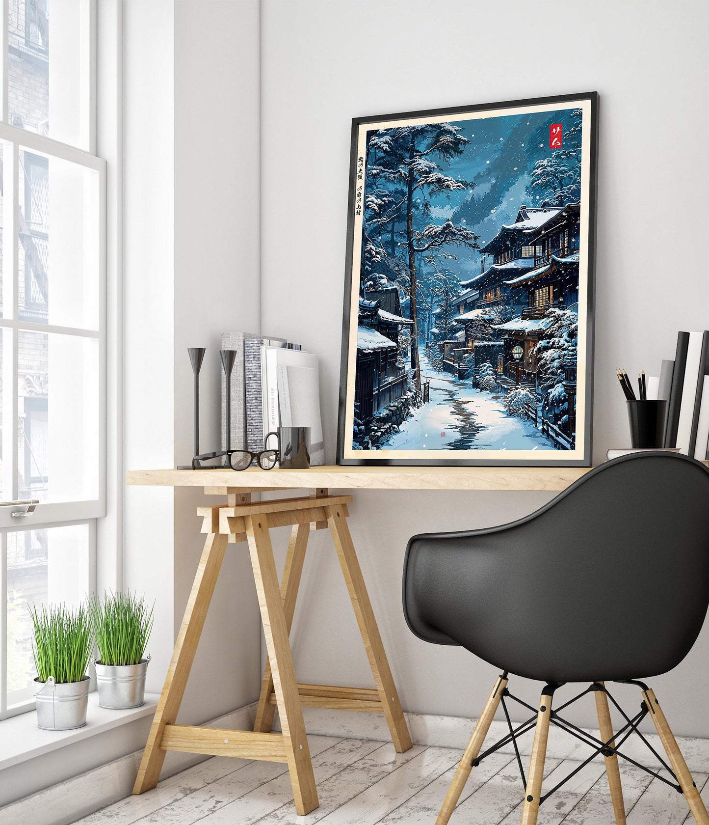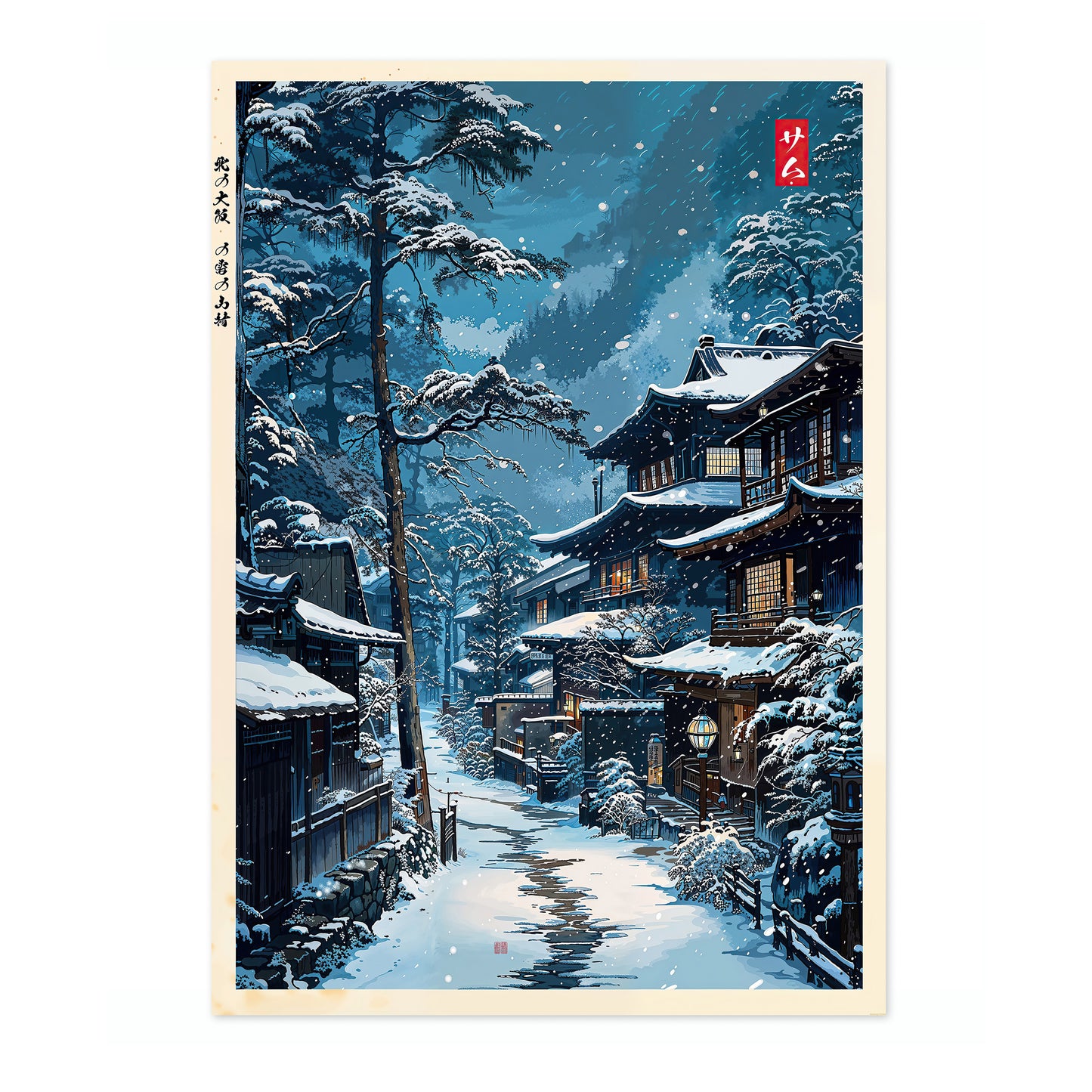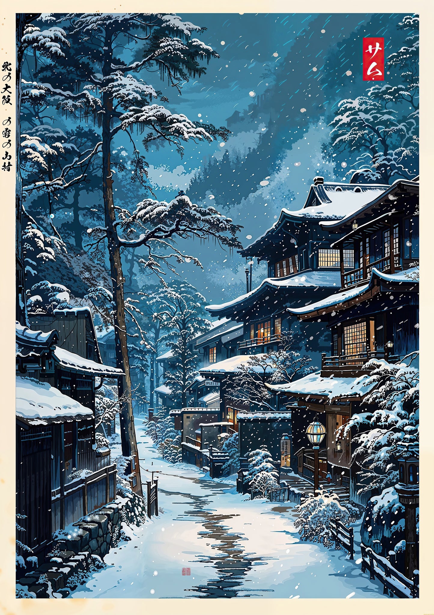 This "Snowy Village in Sapporo" poster captures a serene night time scene in a traditional Japanese village. The illustration, influenced by anime and ukiyo-e woodblock styles, highlights snow-laden rooftops and glowing lanterns amidst falling snowflakes. The peaceful village street, flanked by snow-covered trees and traditional houses, epitomizes winter's quietude in Sapporo. Ideal for those appreciating Japanese art and culture.