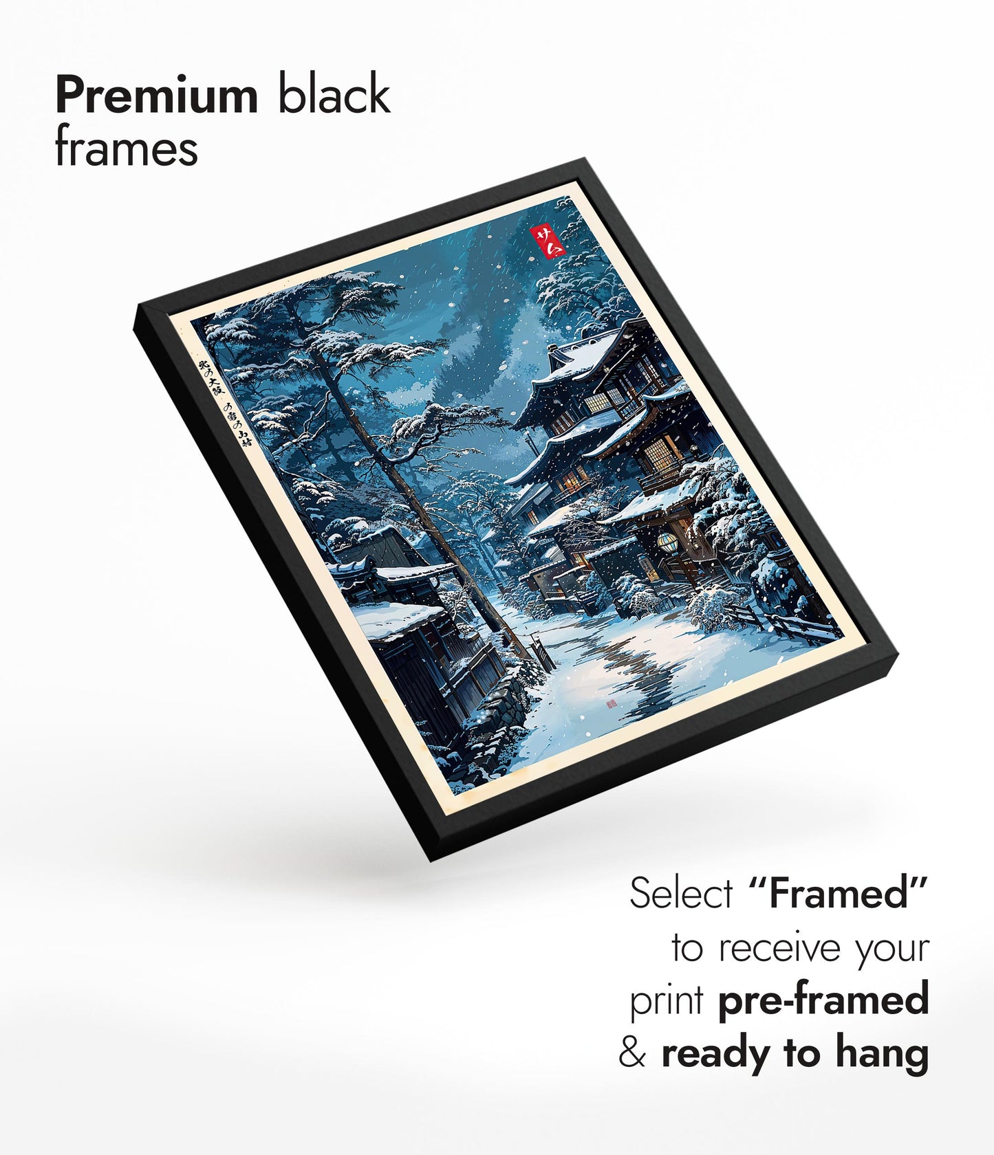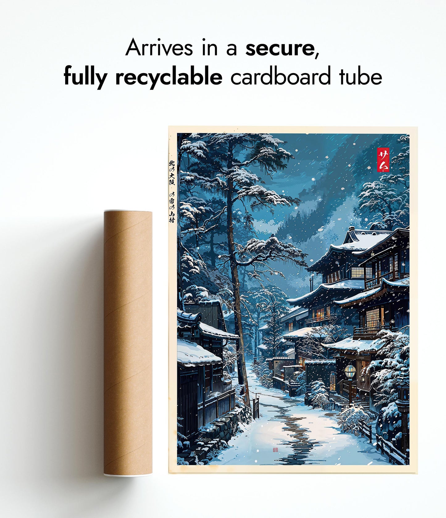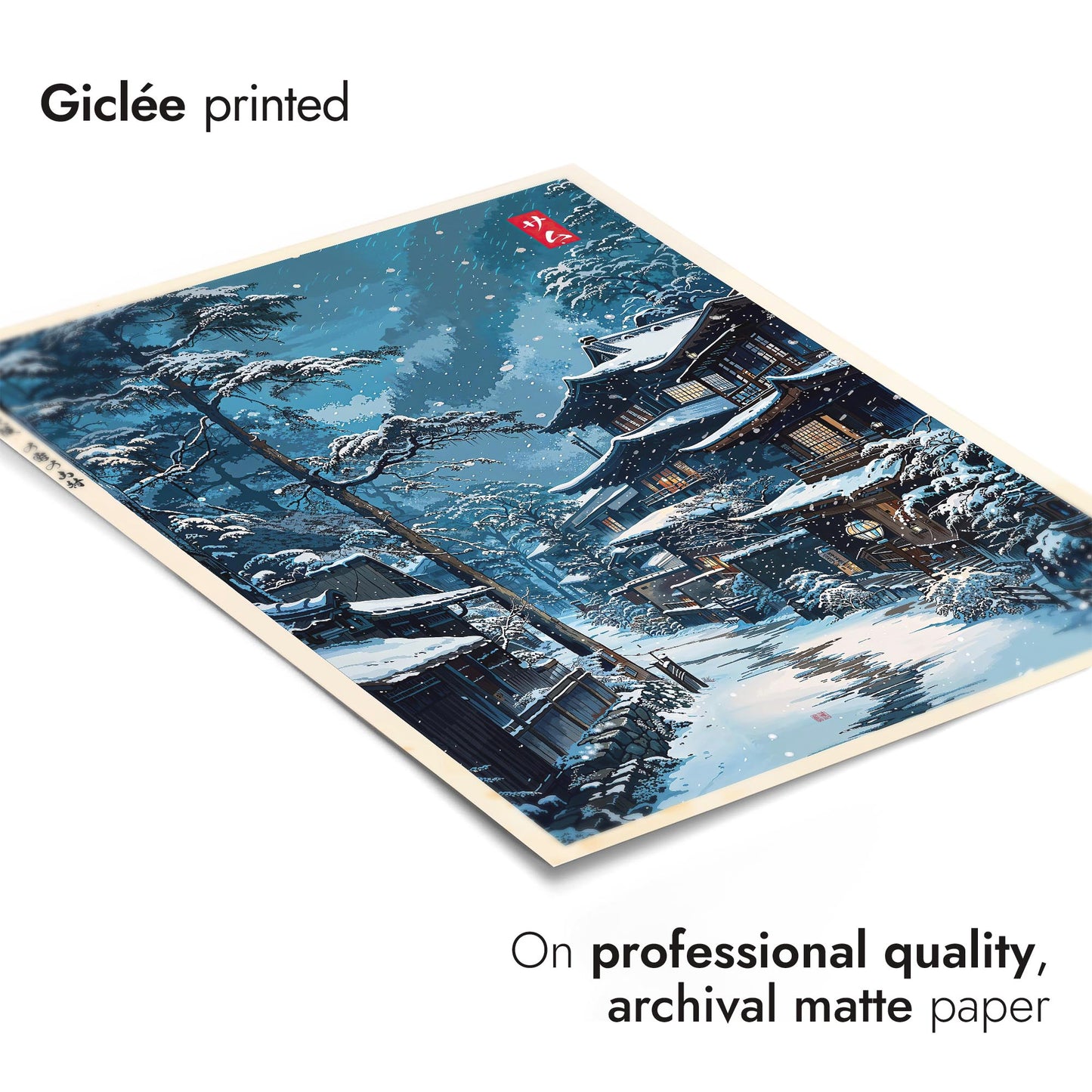 This "Snowy Village in Sapporo" poster captures a serene night time scene in a traditional Japanese village. The illustration, influenced by anime and ukiyo-e woodblock styles, highlights snow-laden rooftops and glowing lanterns amidst falling snowflakes. The peaceful village street, flanked by snow-covered trees and traditional houses, epitomizes winter's quietude in Sapporo. Ideal for those appreciating Japanese art and culture.