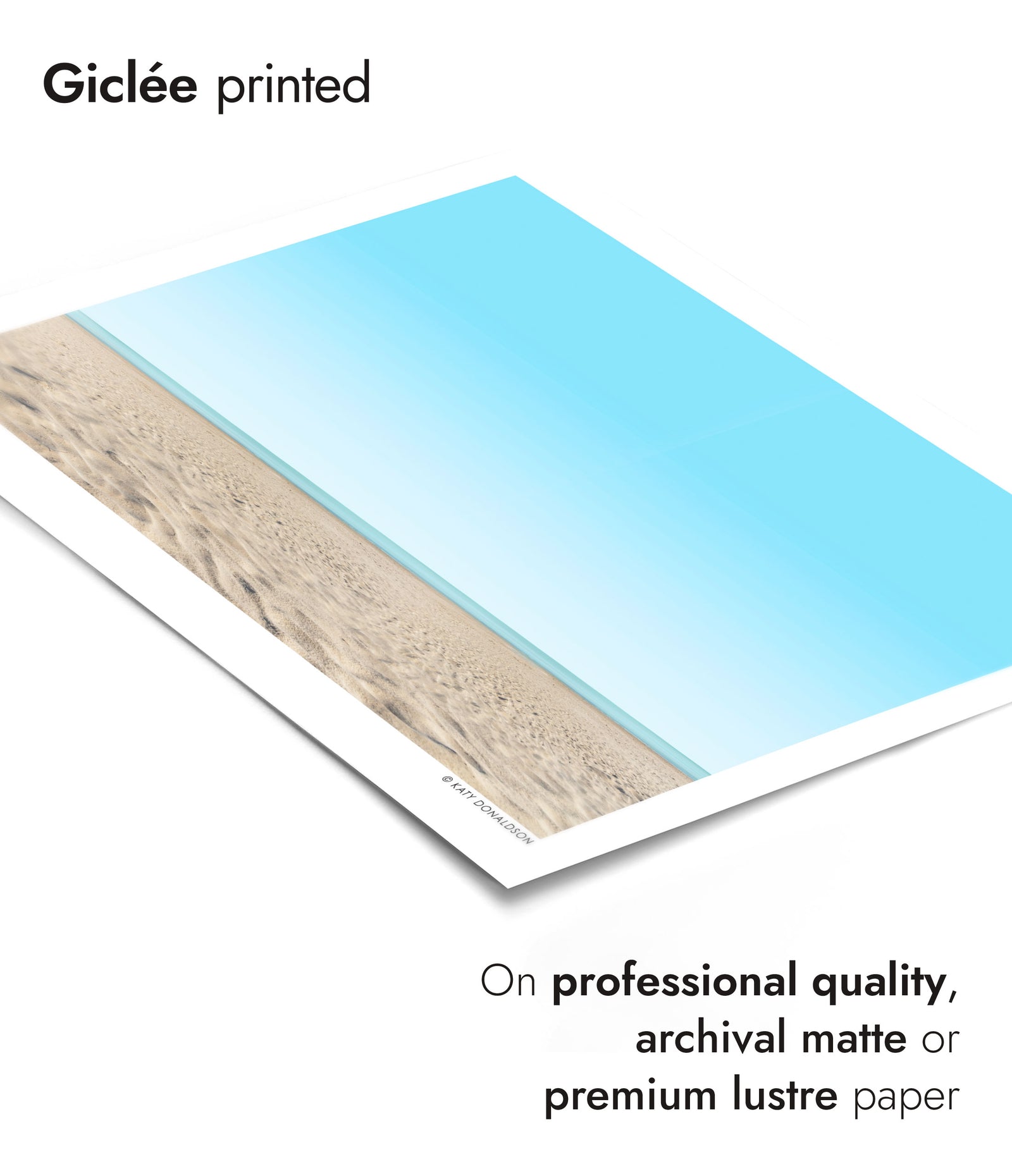 "Soft Sand" by Katy Donaldson captures a serene beachscape with a minimalist touch. This photographic landscape poster showcases an expansive stretch of soft sand leading to a calm ocean, beneath a clear blue sky. Perfect for modern and minimalist decor, bringing the tranquil beauty of the beach indoors. Ideal for sea and beach theme enthusiasts.