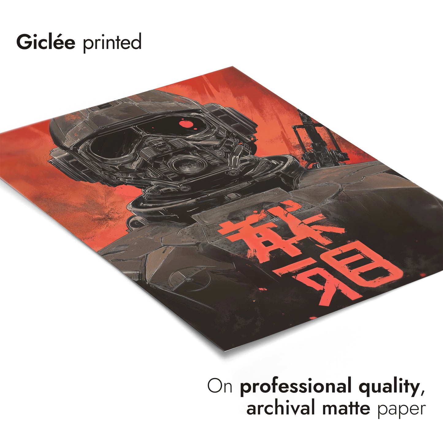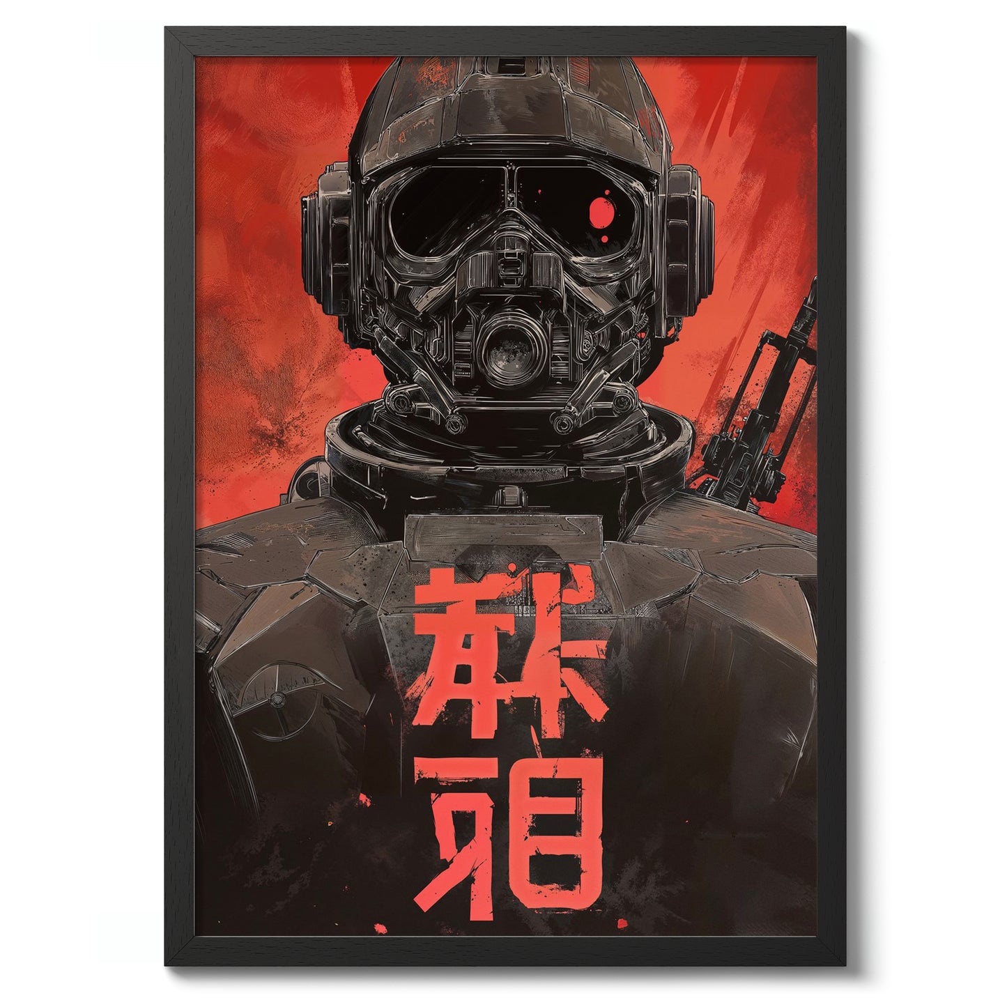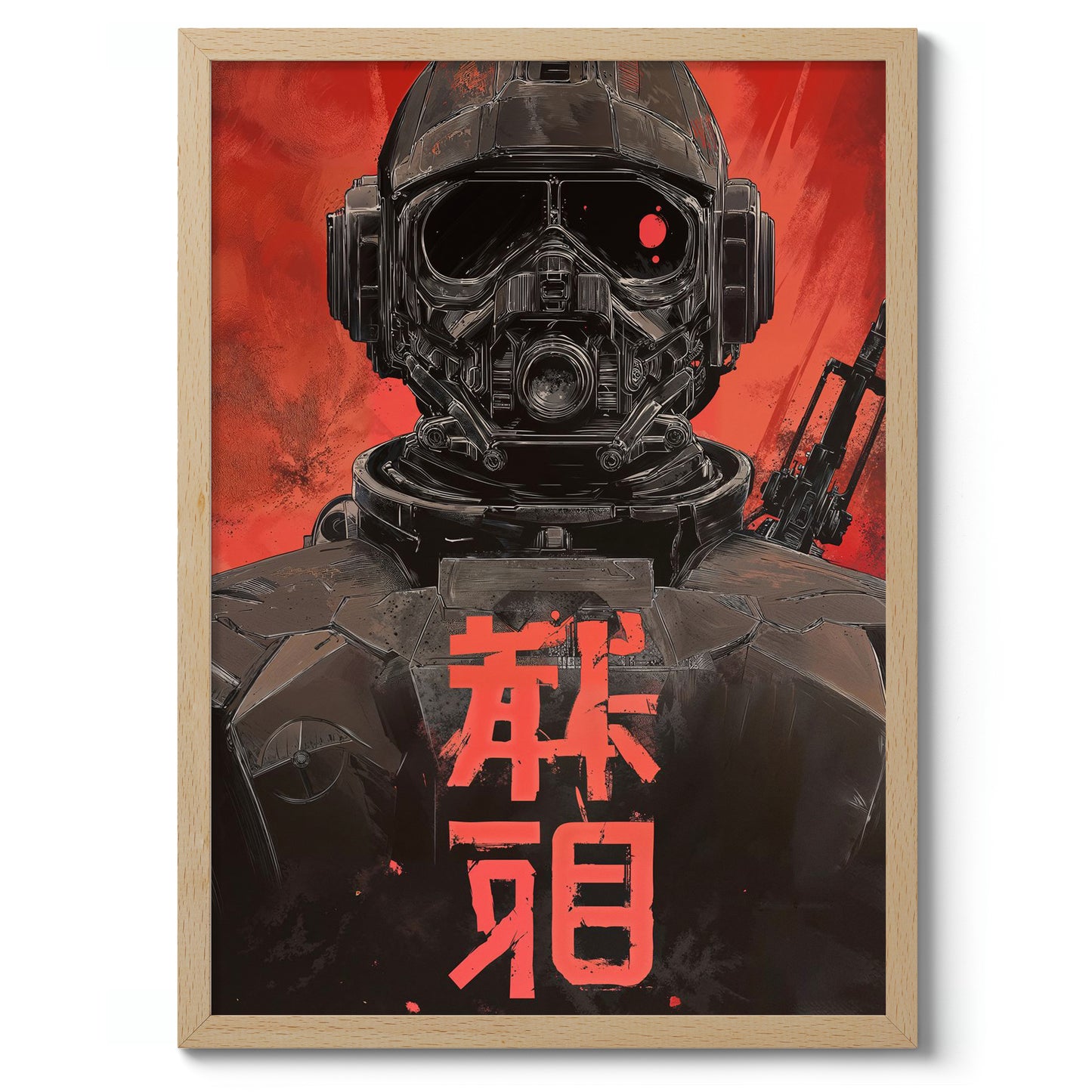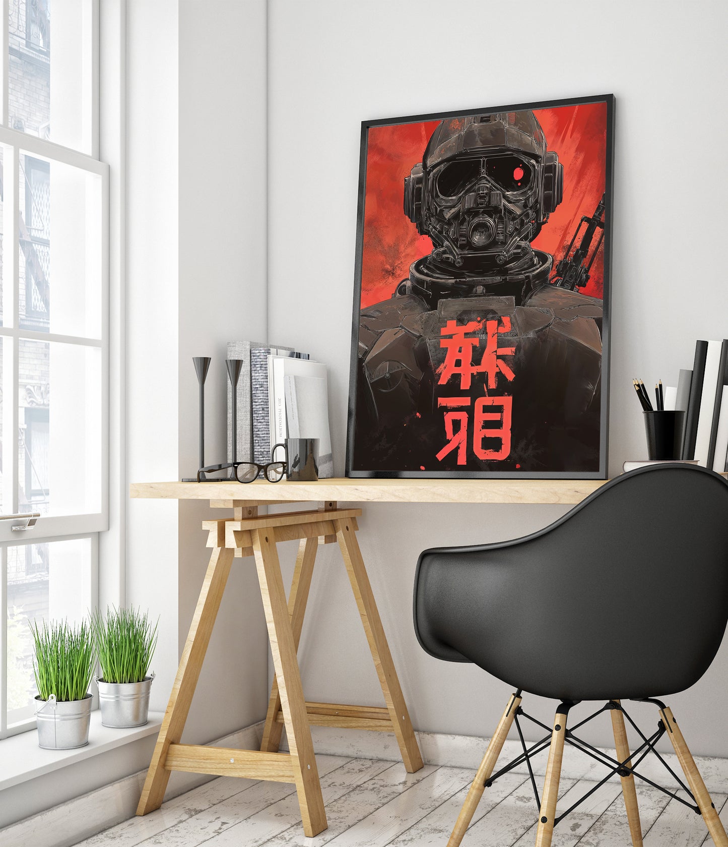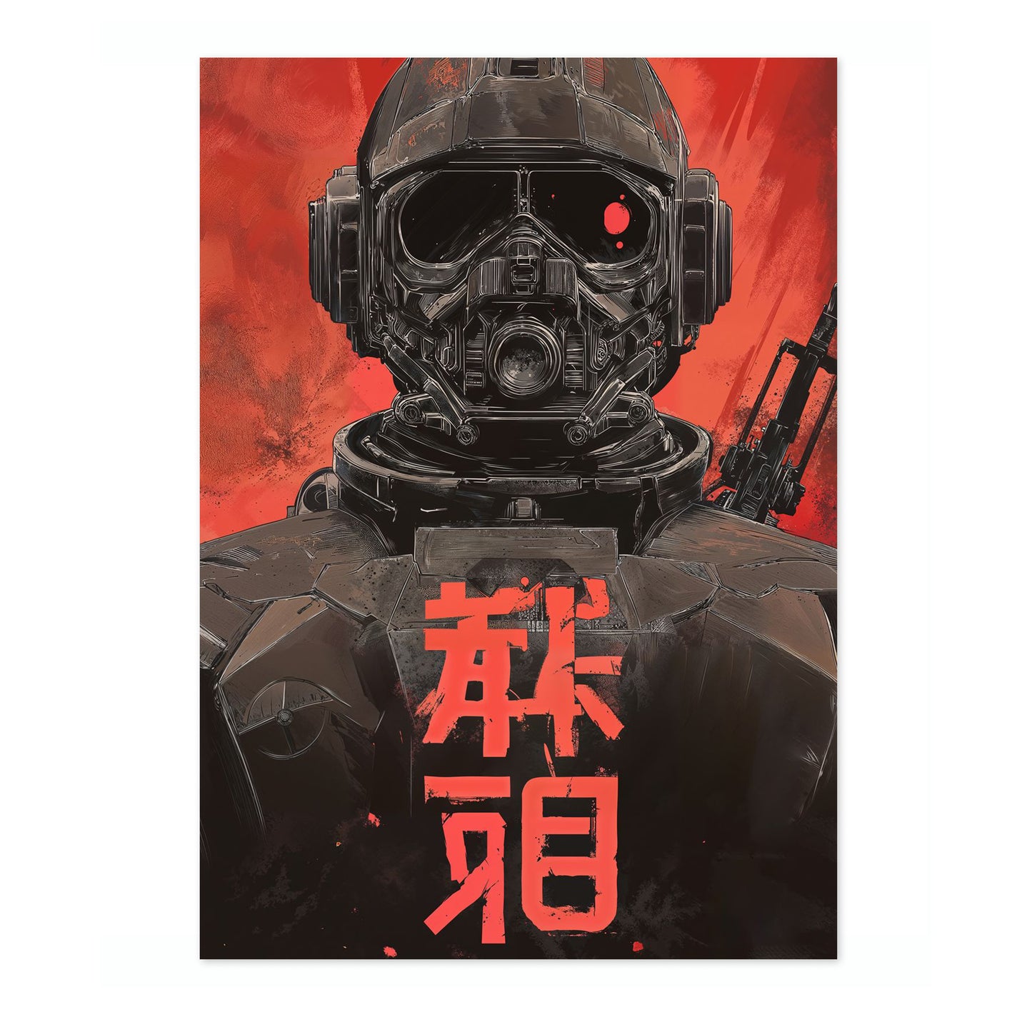 This striking anime poster features a futuristic soldier set against a vivid red backdrop, exuding an intense, bold aesthetic. The intricate details of the soldier's armored suit and helmet evoke a sense of power and readiness. Prominent Japanese typography enhances its cultural and thematic depth, making it an eye-catching piece for fans of Japanese or war-themed anime art.