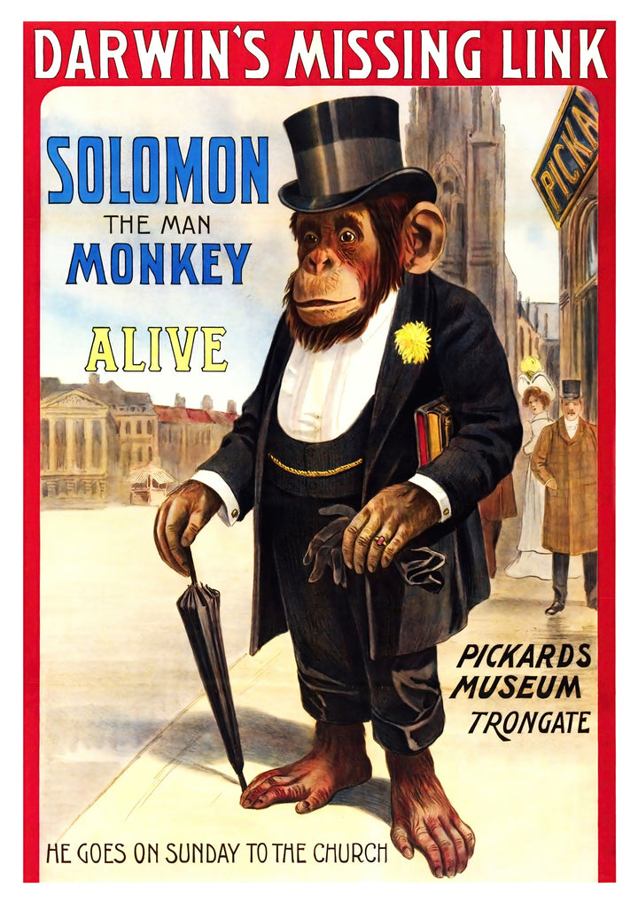 This vintage poster titled "Solomon the Monkey" features a humorous illustration of a monkey dressed in Victorian attire, including a top hat and suit. Advertising an exhibit at Pickards Museum, this quirky and eye-catching piece hails from an era of curiosity and entertainment. Perfect for those interested in vintage advertisements and historical oddities.