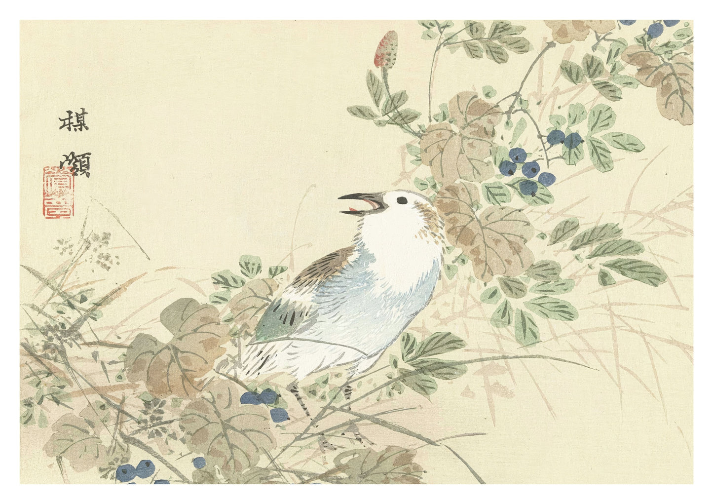 The "Songbird Among Autumn Grasses" poster features a delicate traditional Japanese woodblock print by Kono Bairei. This landscape artwork displays a songbird perched amidst intricate autumn grasses and berries, capturing the serene beauty of nature. The soft colours and meticulous details highlight the elegance of Ukiyo-E style painting, making it a perfect addition for those who appreciate traditional Japanese art.
