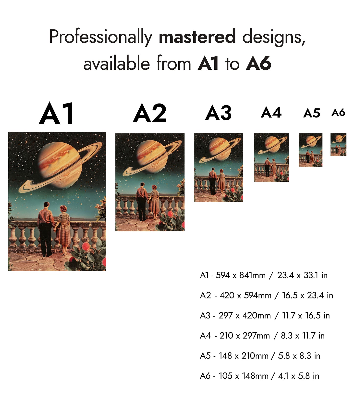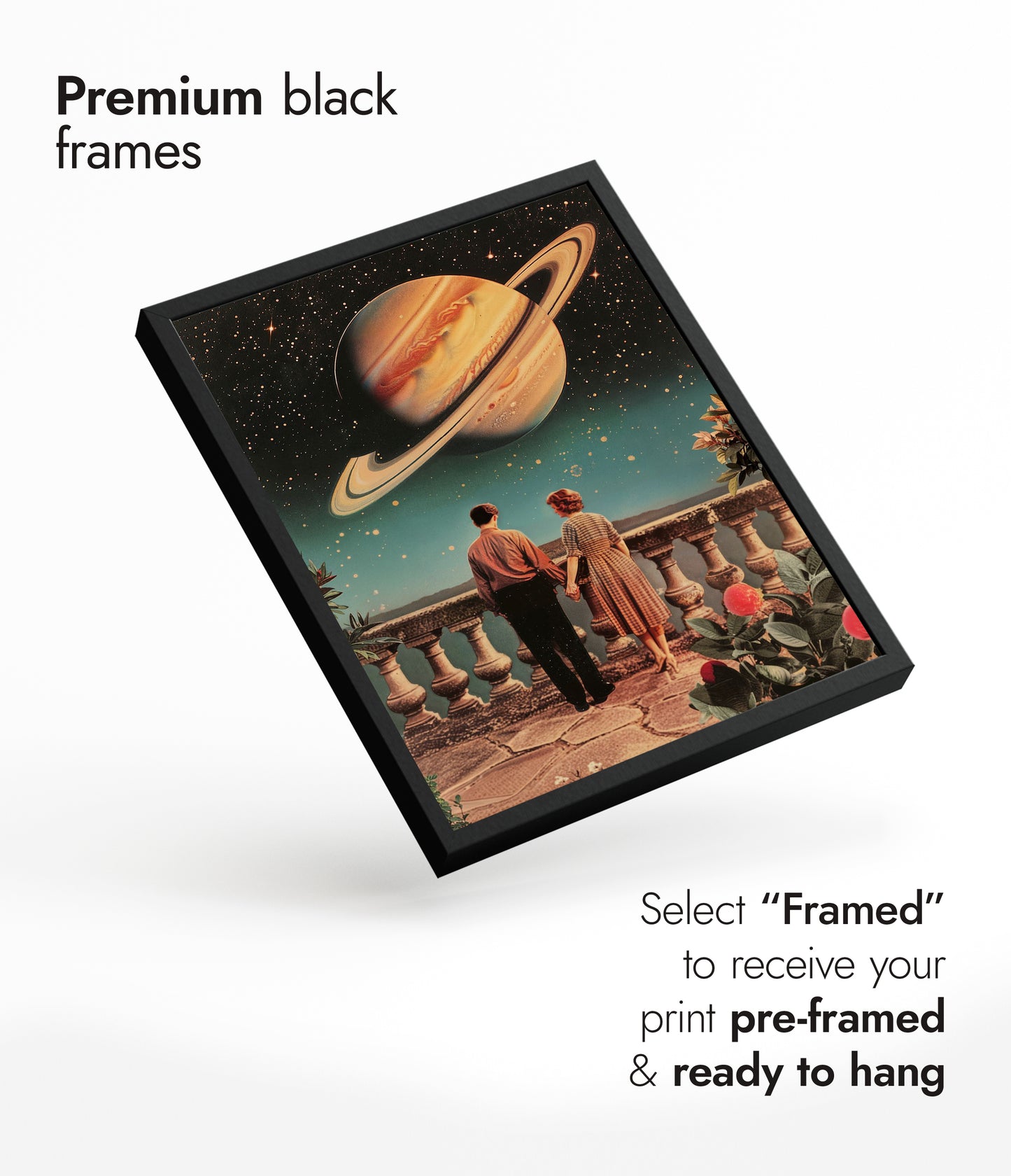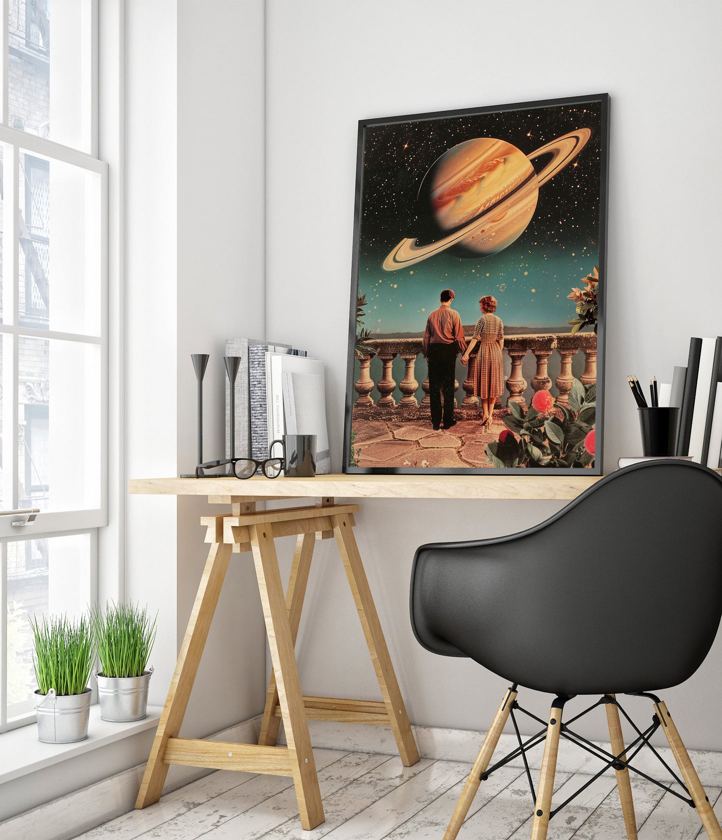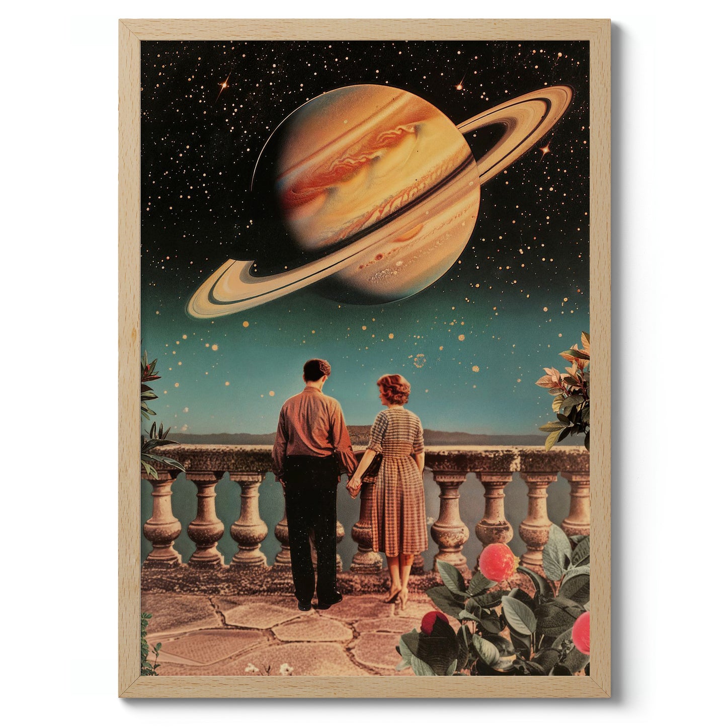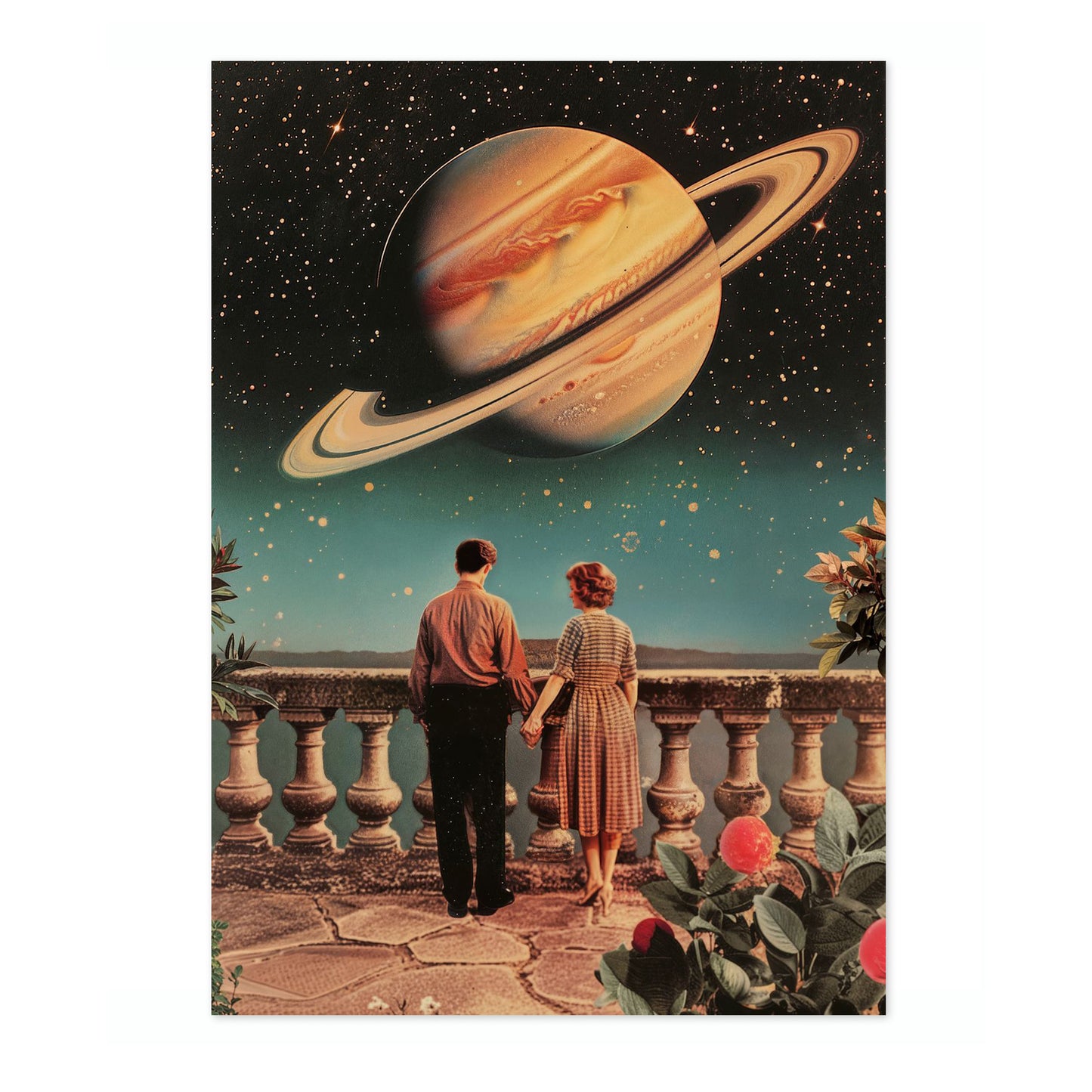 Explore the captivating fusion of vintage charm and cosmic wonder in the "Space Balcony" poster. This artwork features a retro-styled couple gazing at the majestic Saturn from a stone balcony under a star-filled sky. The nostalgic illustration intricately blends art deco aesthetics with sci-fi themes, making it a striking addition to any space-themed decor.