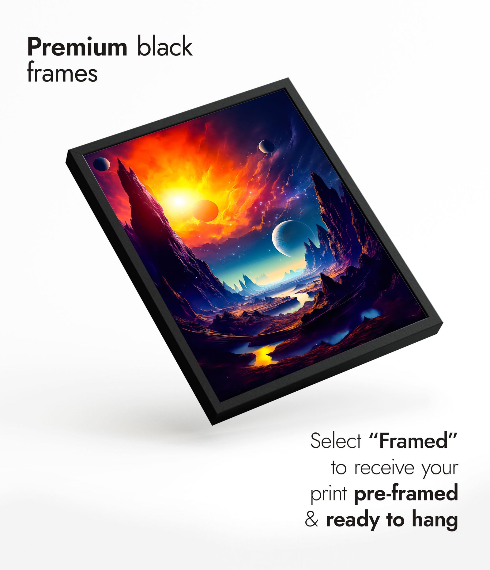Immerse in the cosmic allure of "Space Canyon" with this modern illustration poster. Featuring dramatic mountain peaks, celestial bodies, and a vibrant sunset casting hues over a serene lake, this sci-fi themed artwork captures a stunning extraterrestrial landscape. Perfect for adding a touch of space-inspired wonder to any room.