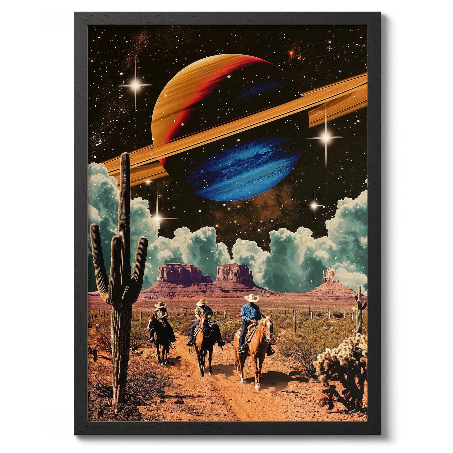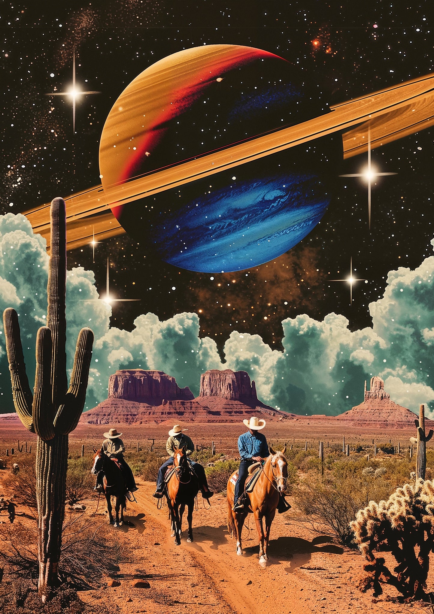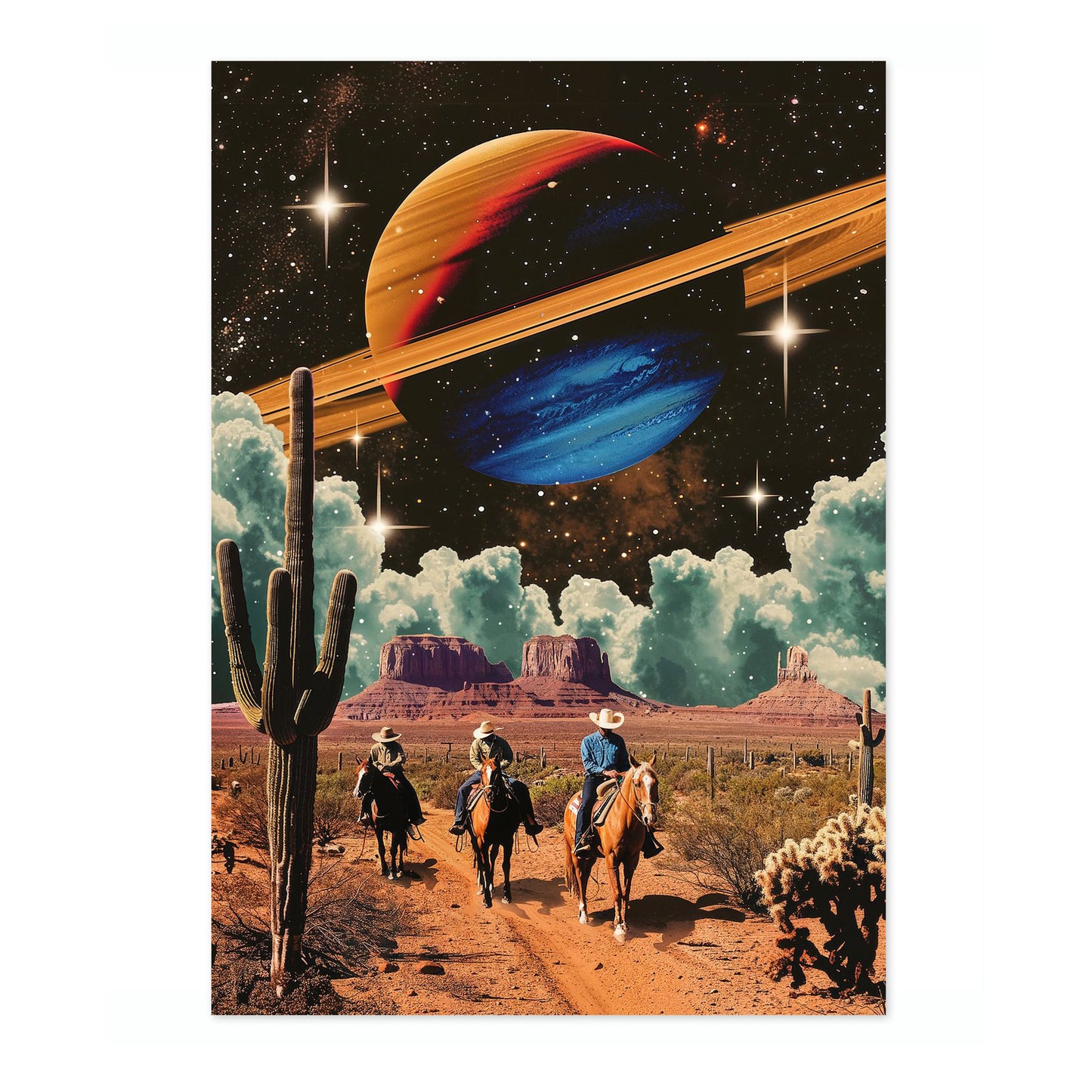 "Space Cowboys" poster merges vintage western aesthetics with cosmic elements. Cowboys ride through a desert landscape, flanked by towering cacti, beneath a star-filled sky featuring a vibrantly colored ringed planet. This sci-fi illustration seamlessly blends retro and space themes, offering a unique visual experience that's perfect for art enthusiasts and collectors of imaginative, graphic design.