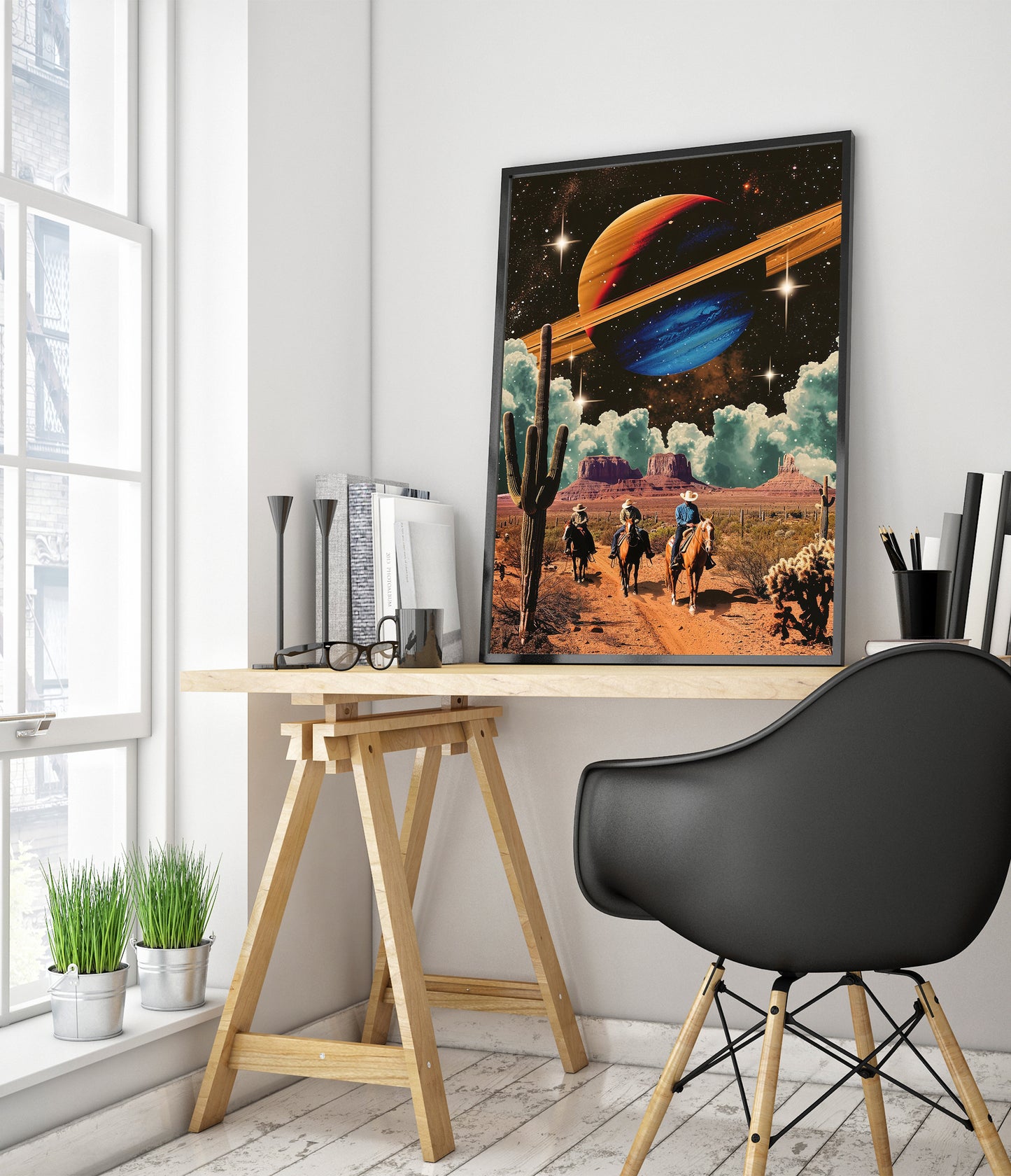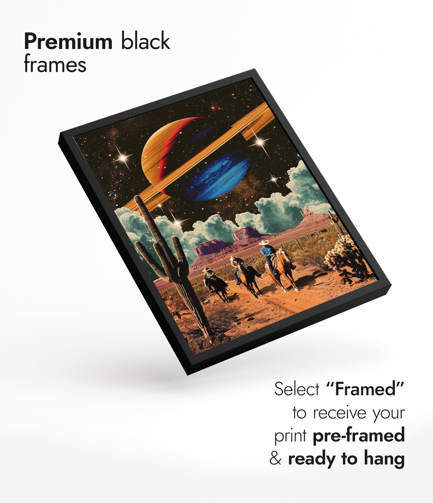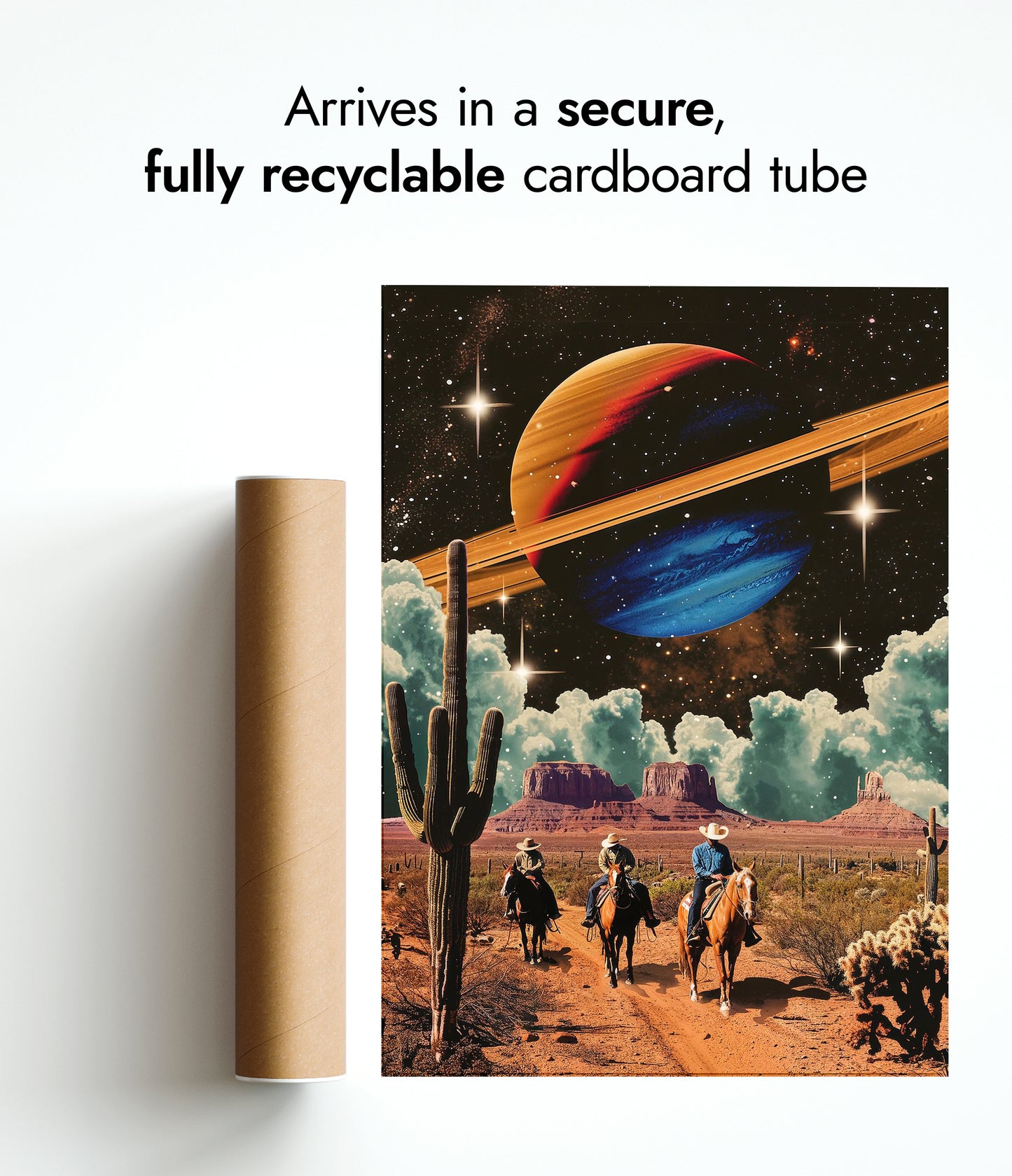 "Space Cowboys" poster merges vintage western aesthetics with cosmic elements. Cowboys ride through a desert landscape, flanked by towering cacti, beneath a star-filled sky featuring a vibrantly colored ringed planet. This sci-fi illustration seamlessly blends retro and space themes, offering a unique visual experience that's perfect for art enthusiasts and collectors of imaginative, graphic design.