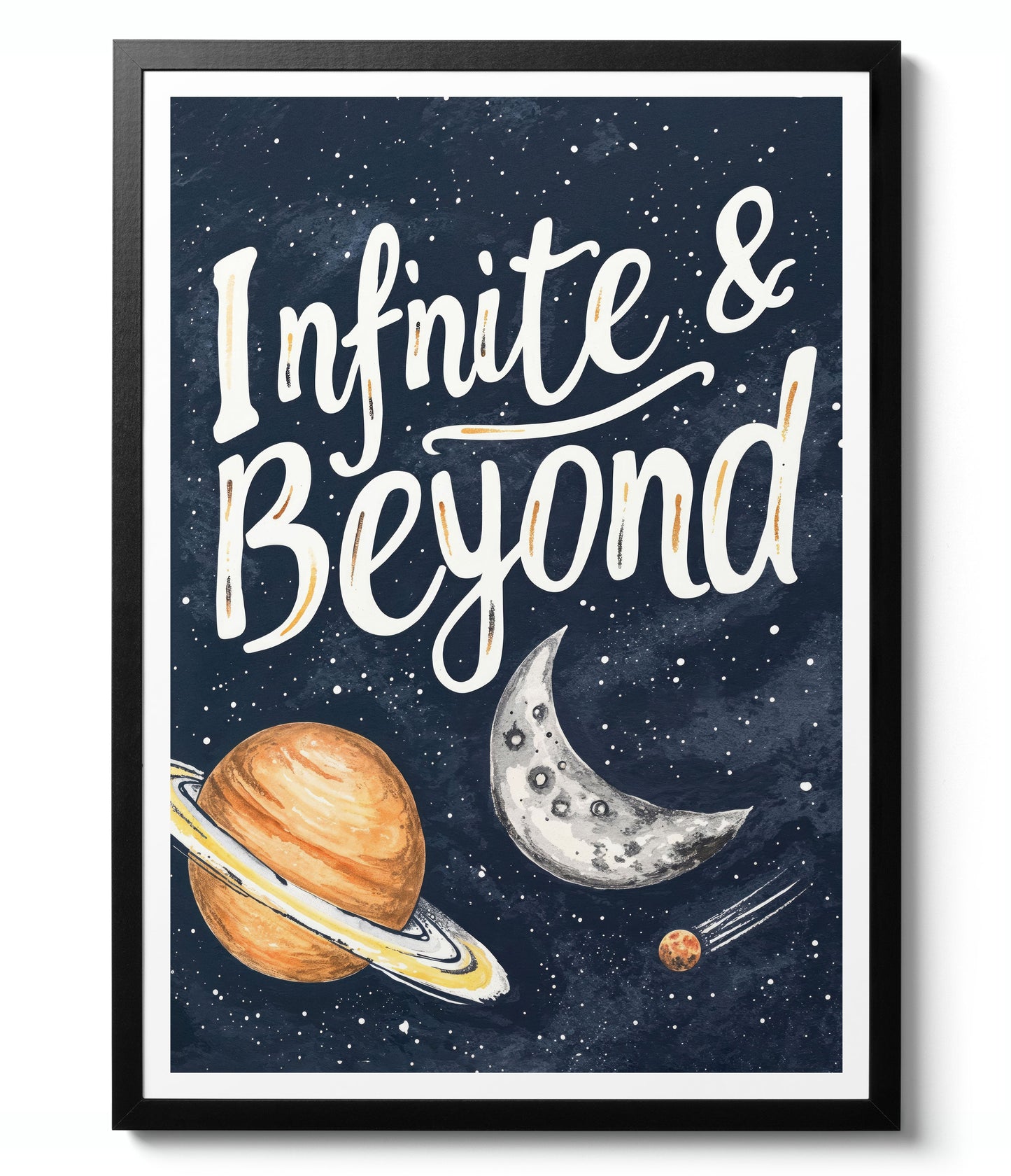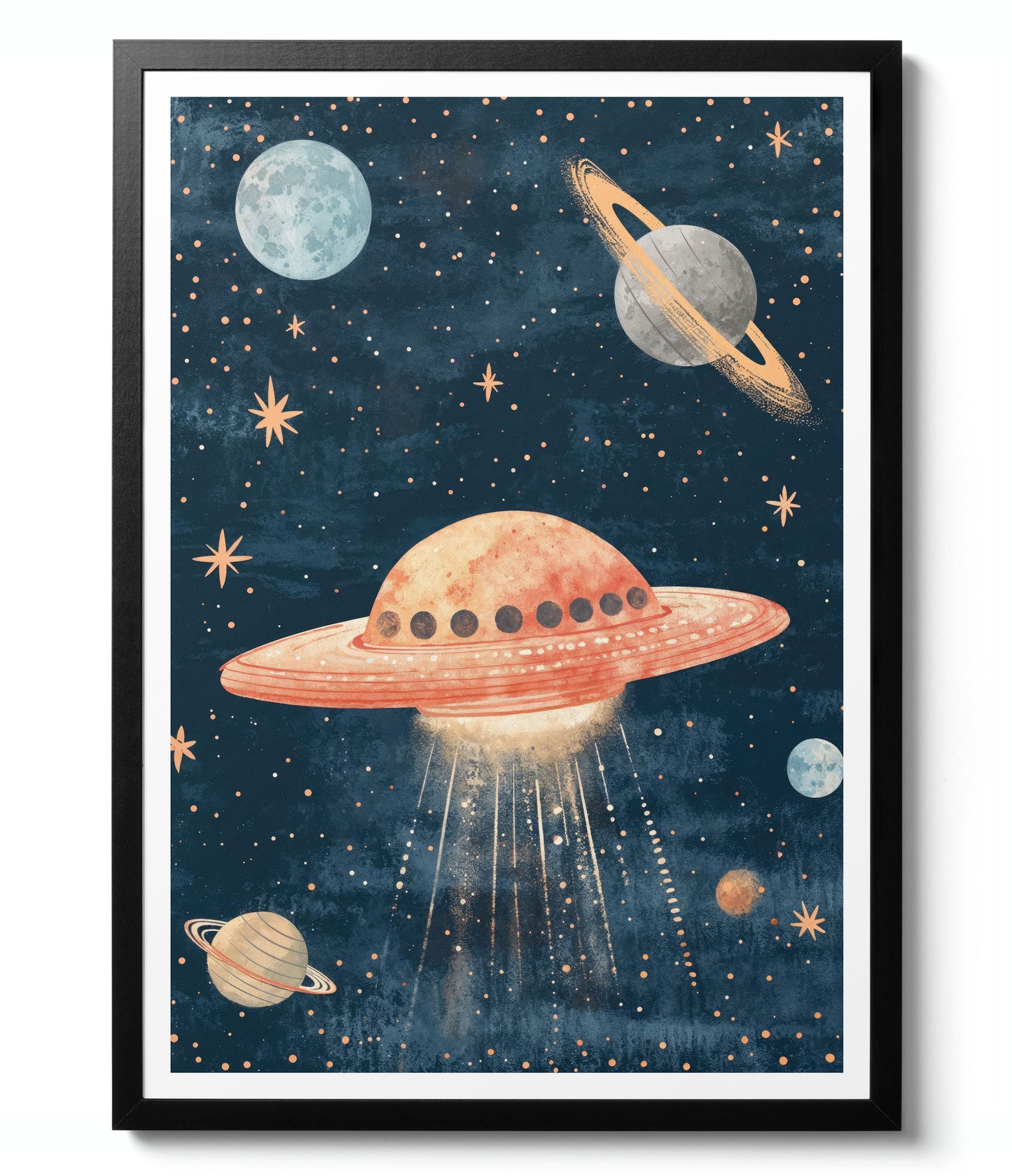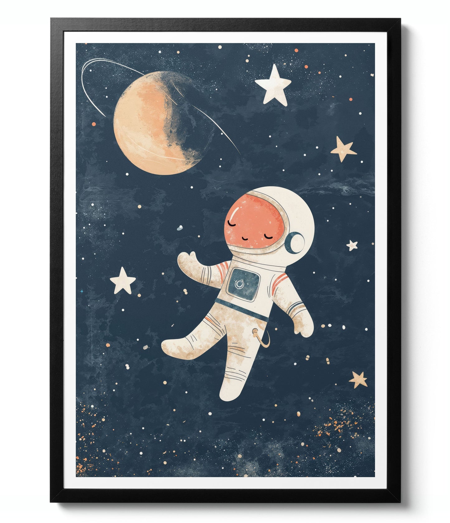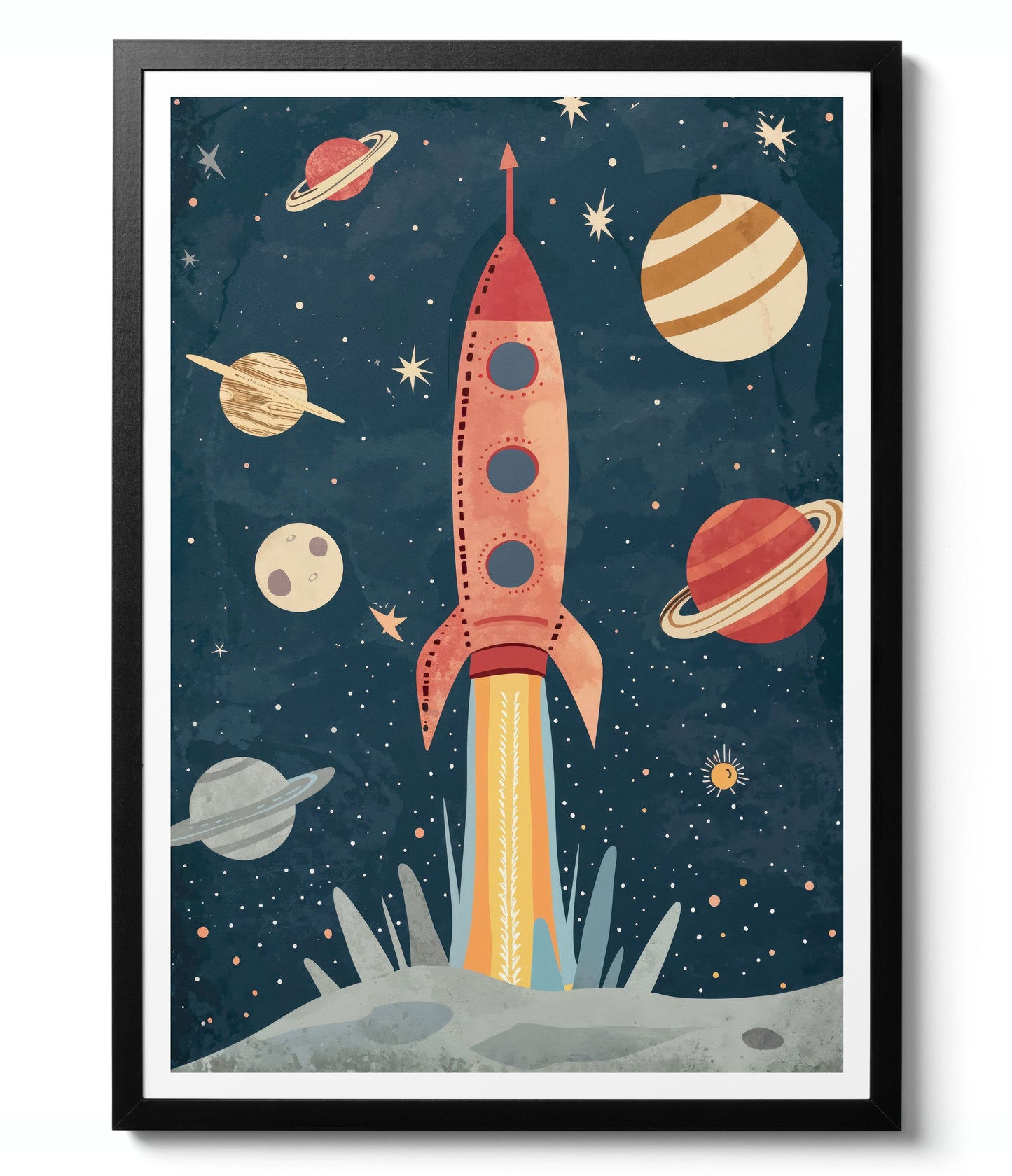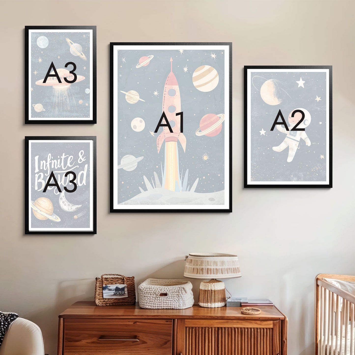 This set of nursery wall art posters features a space theme with rockets, planets, and an astronaut. The prints have a whimsical design, ideal for kids’ rooms. Each piece is made with high-quality materials, offering vibrant colours and durability. Perfect for creating a space-themed gallery wall. Suitable for children's spaces, enhancing creativity and imagination.