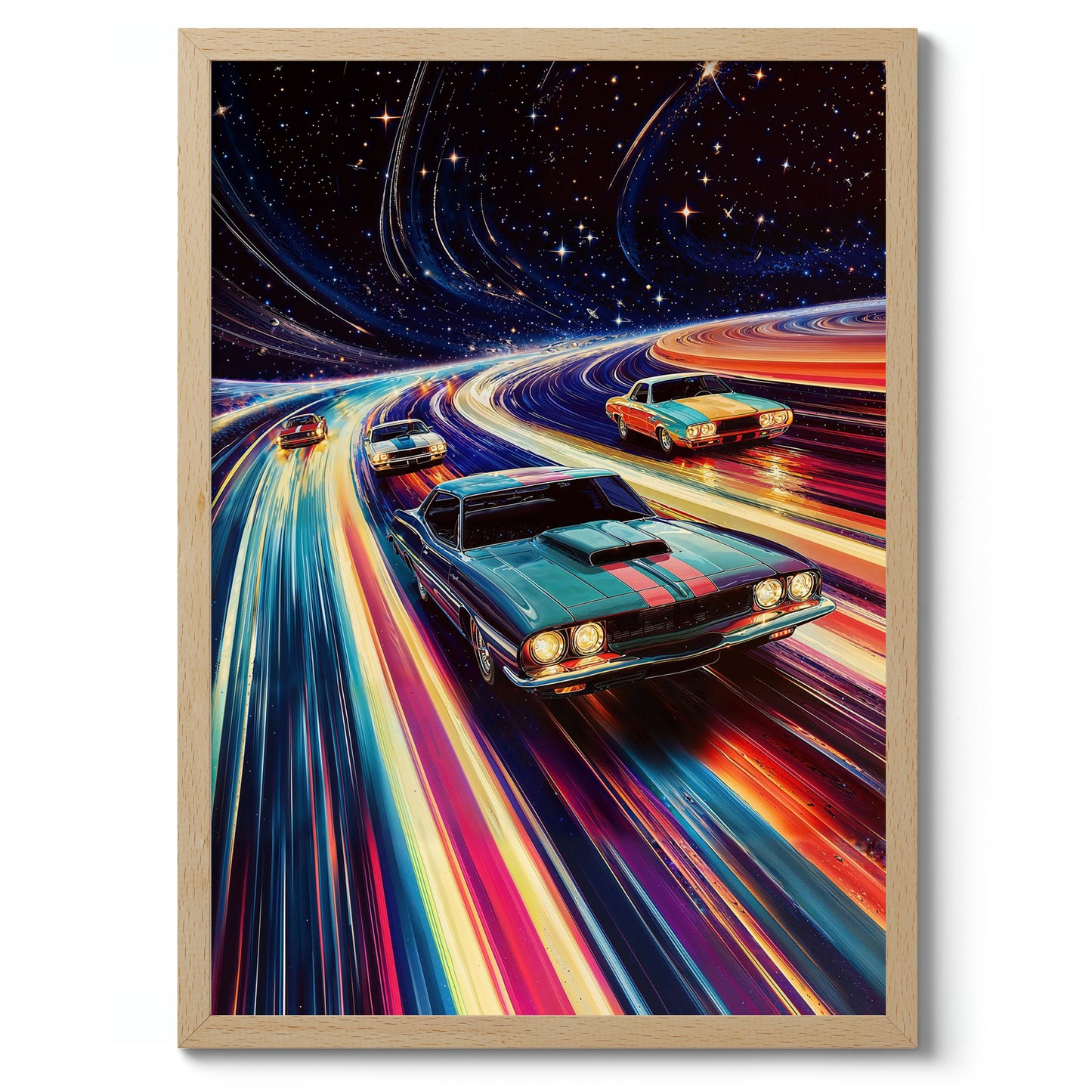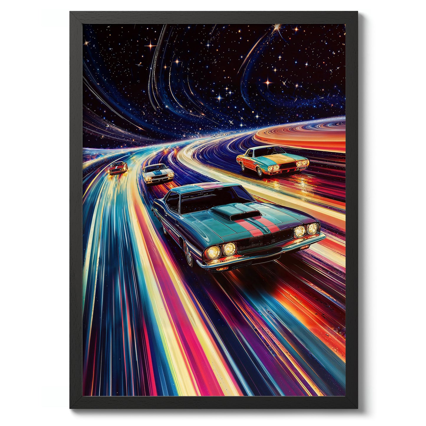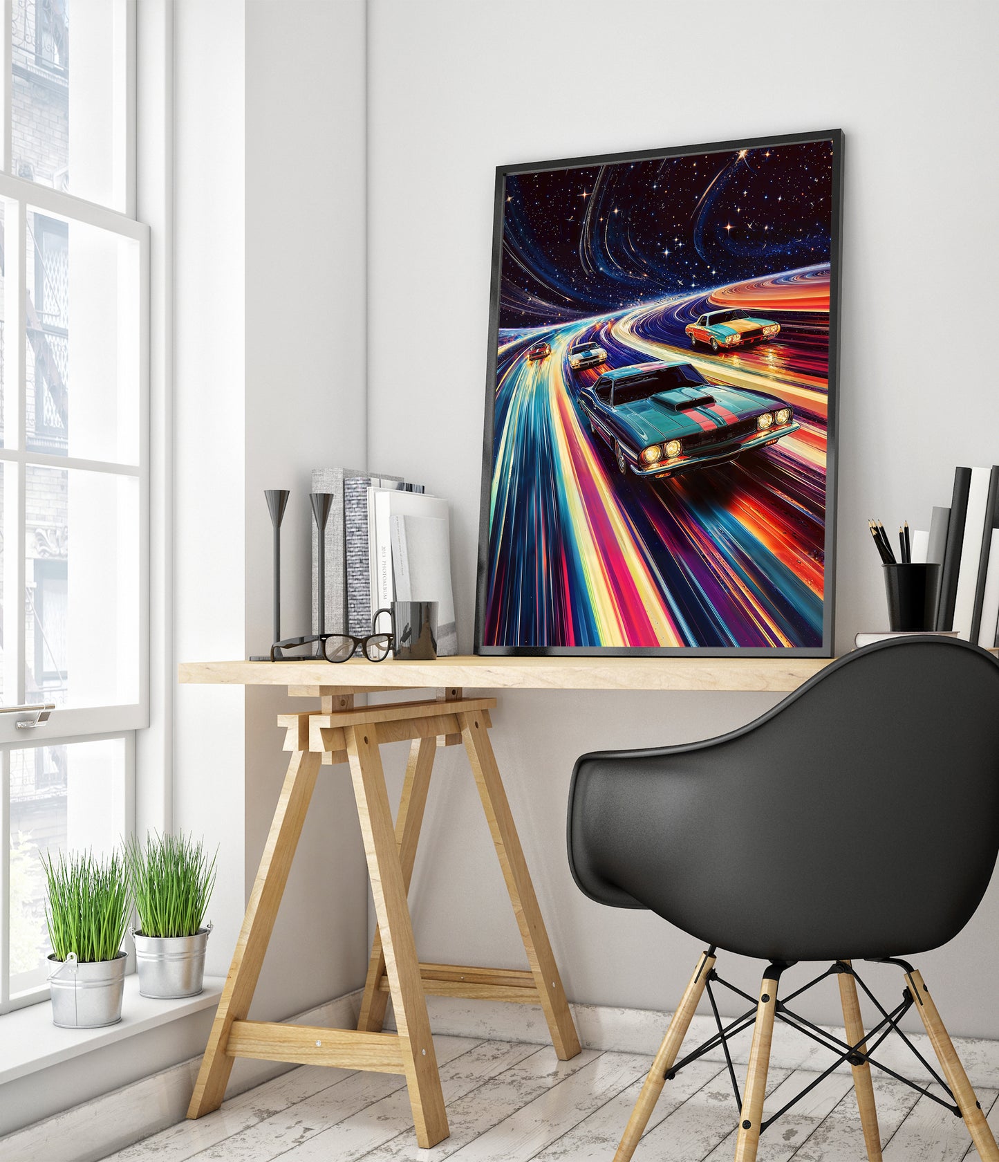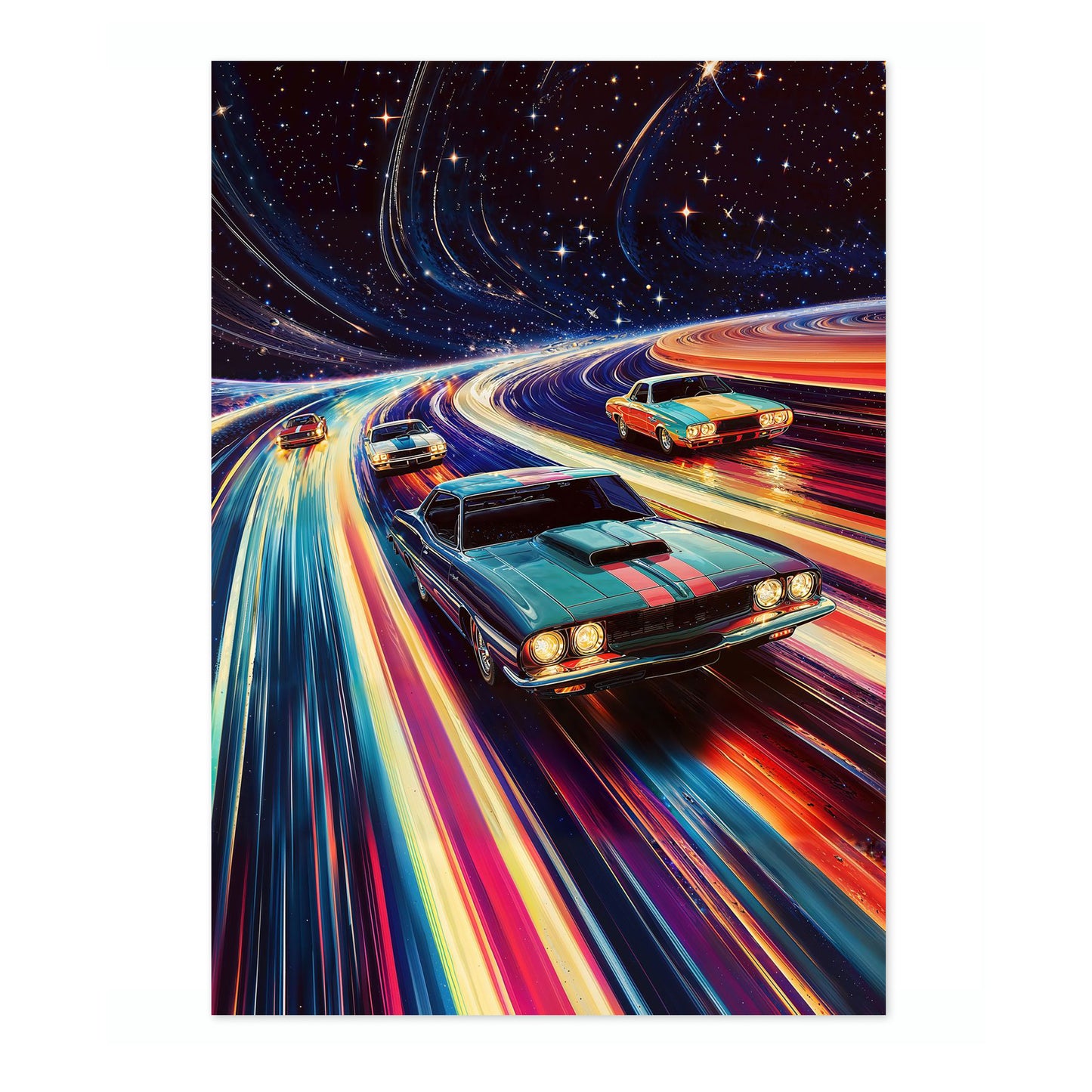 The "Space Race" poster captures a thrilling sci-fi scene with vintage cars racing through vibrant, swirling trails of color against a star-studded cosmic backdrop. This graphic, modern artwork combines elements of speed and space, offering a dynamic visual that appeals to car enthusiasts and sci-fi lovers alike, making it a standout piece in any collection.