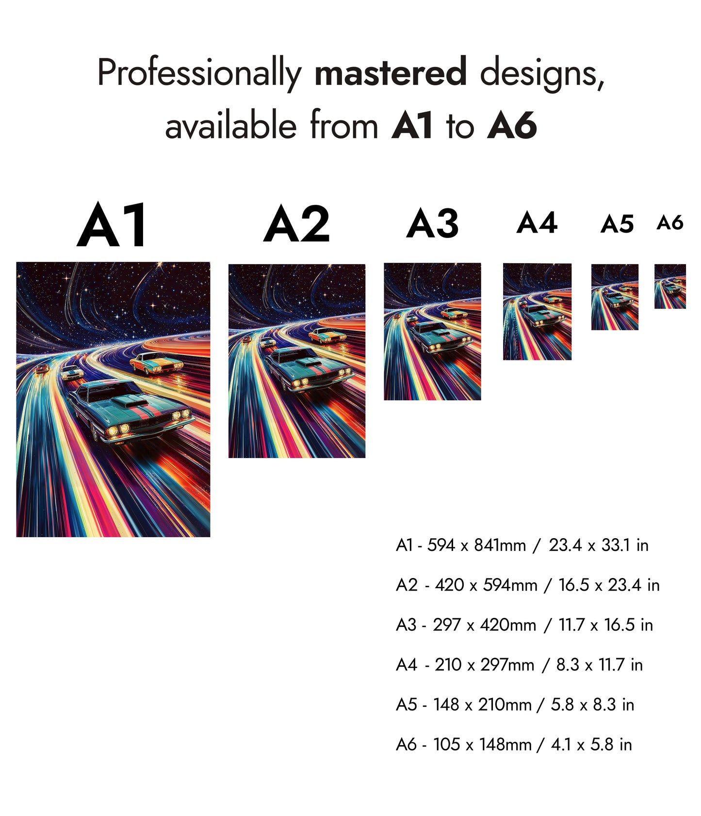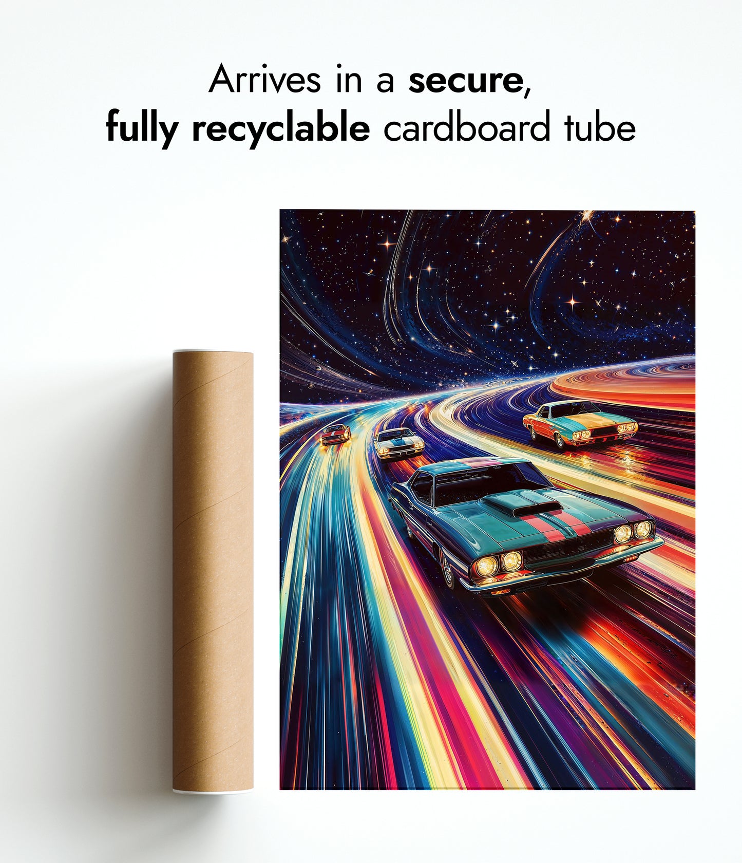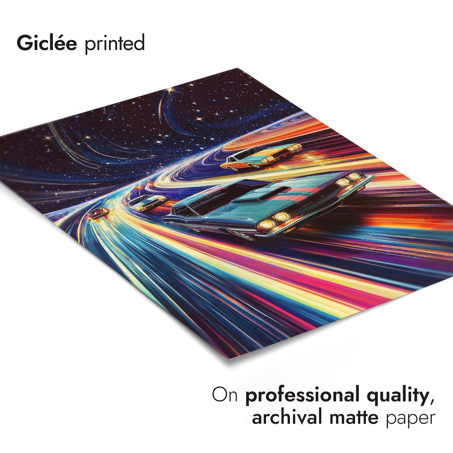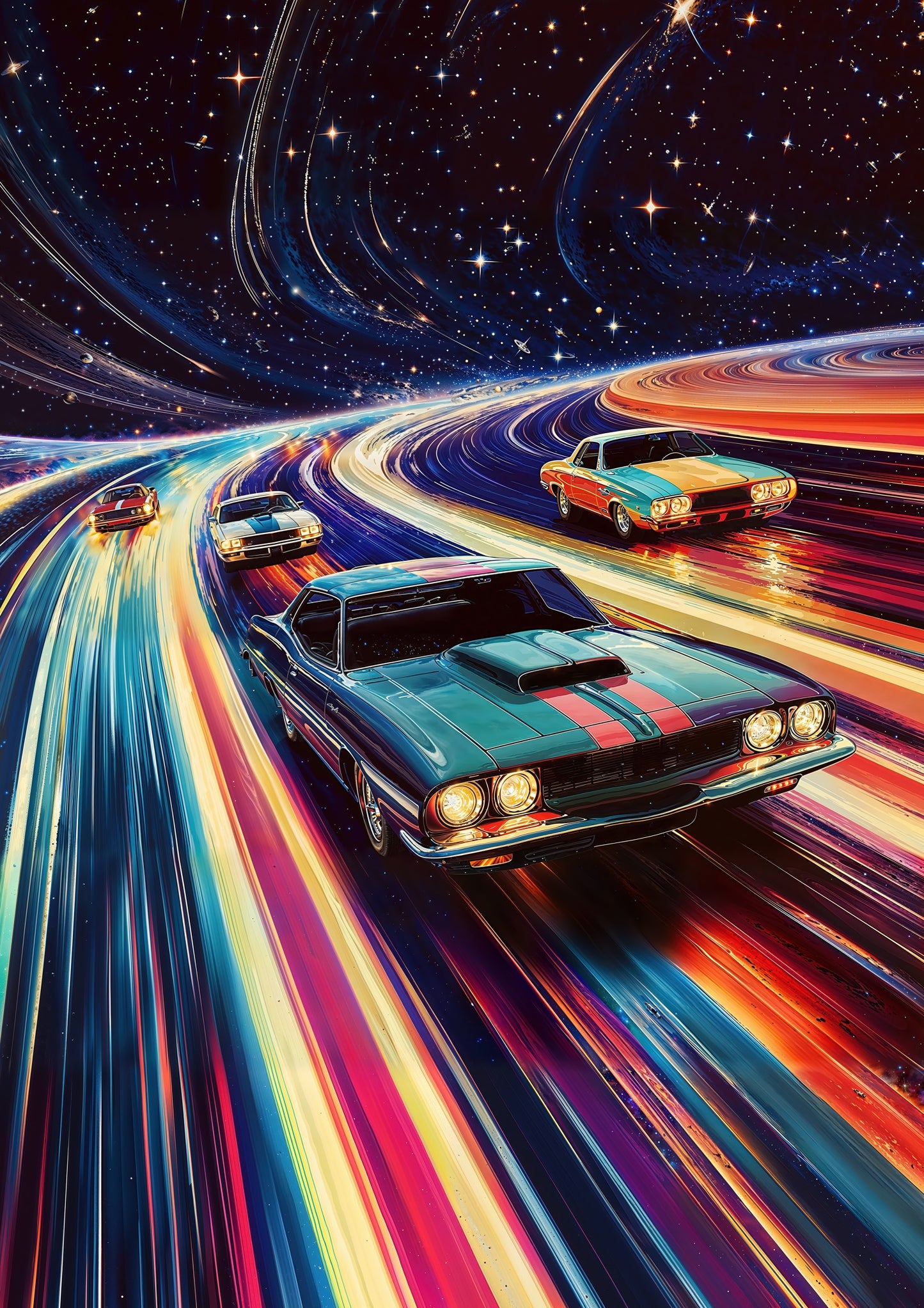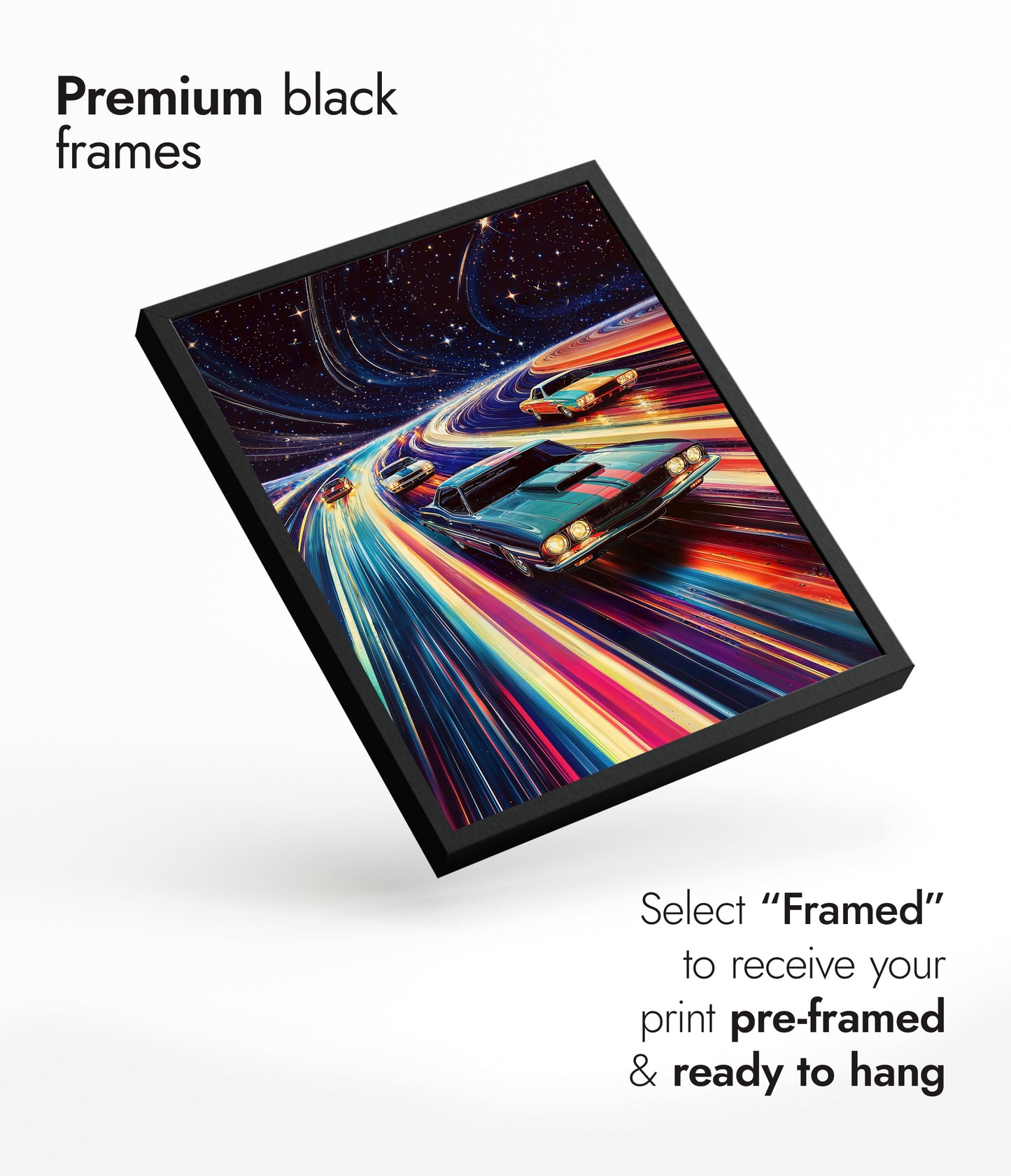 The "Space Race" poster captures a thrilling sci-fi scene with vintage cars racing through vibrant, swirling trails of color against a star-studded cosmic backdrop. This graphic, modern artwork combines elements of speed and space, offering a dynamic visual that appeals to car enthusiasts and sci-fi lovers alike, making it a standout piece in any collection.