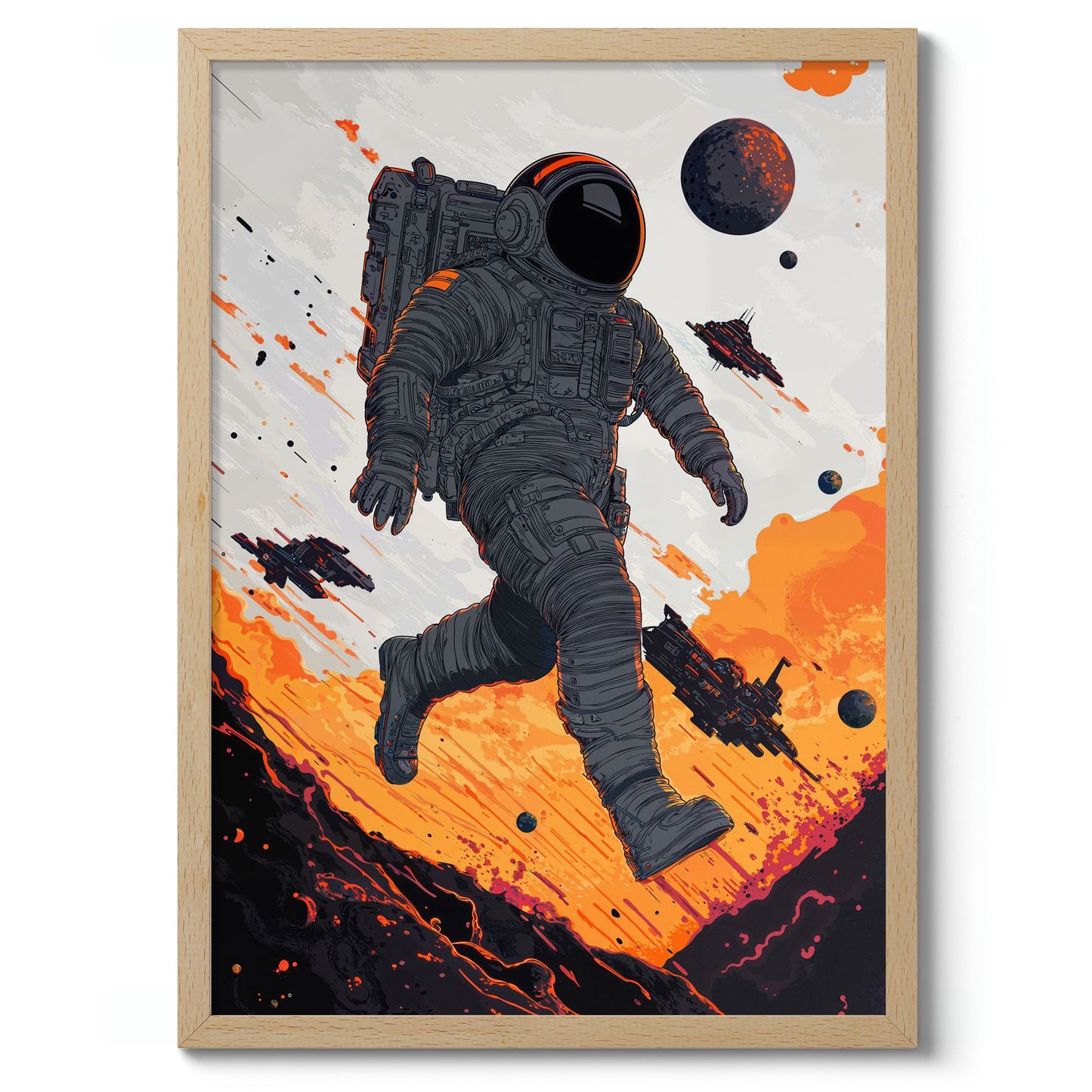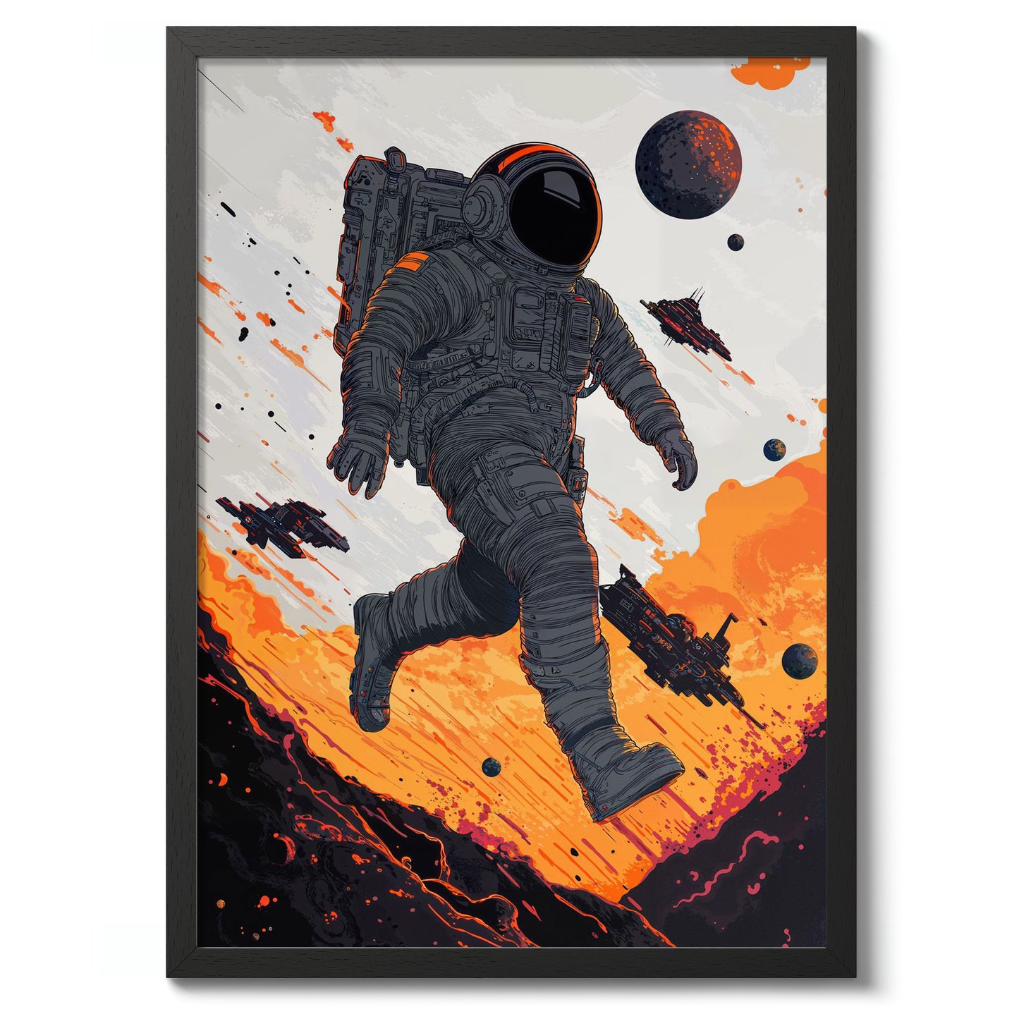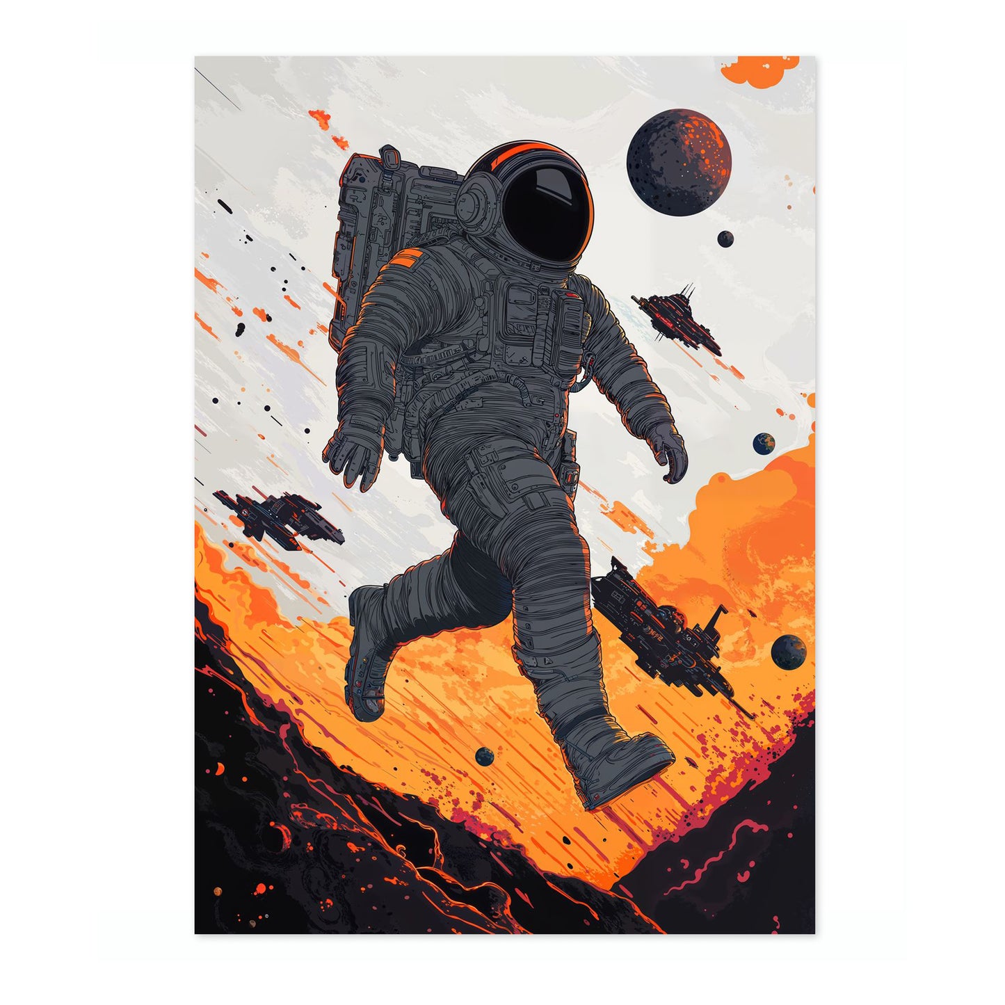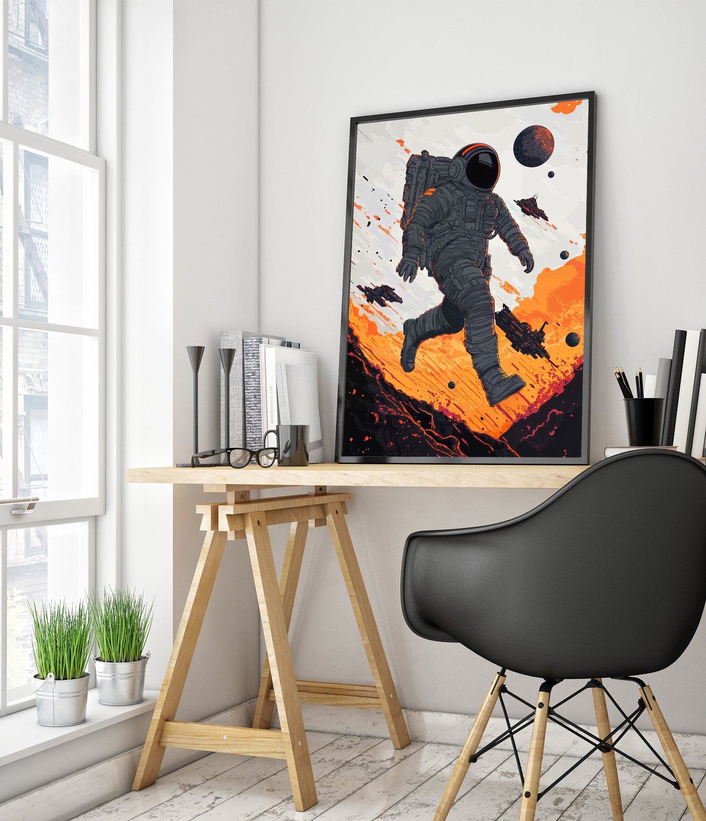 The "Spacewalk" poster showcases a lone astronaut traversing an extraterrestrial landscape, surrounded by burning orange skies and distant planets. This sci-fi-themed artwork captures the adventurous spirit of space exploration, with intricate details and contrasting hues. Ideal for fans of modern, graphic styles, this print highlights the allure of cosmic wonders and futuristic travels.
