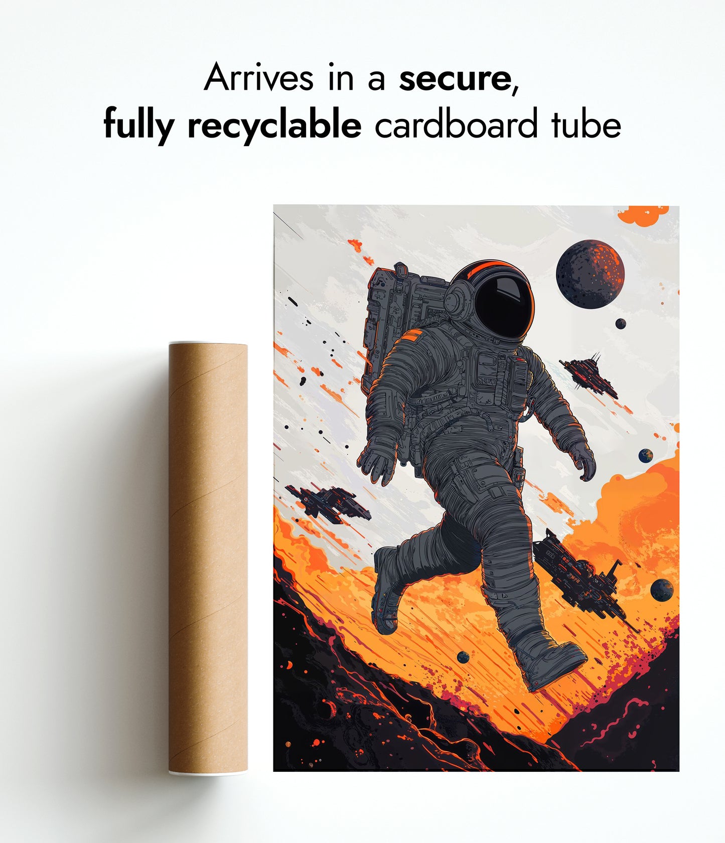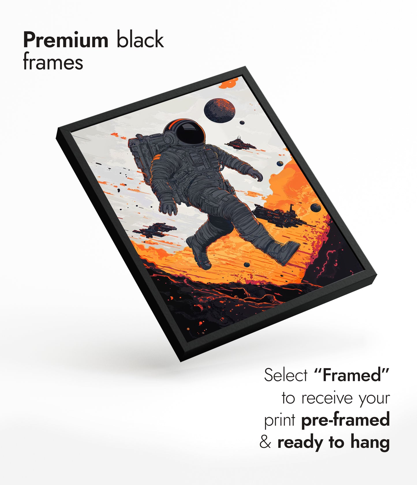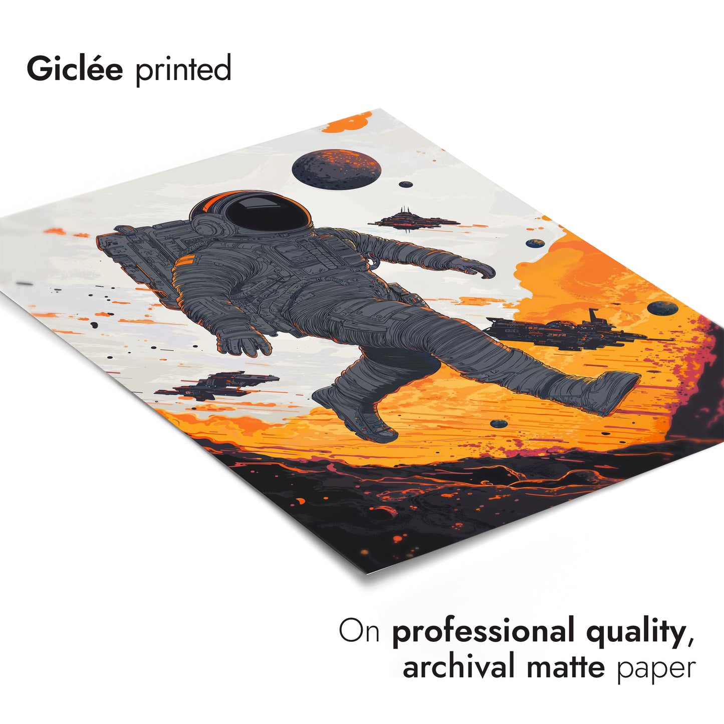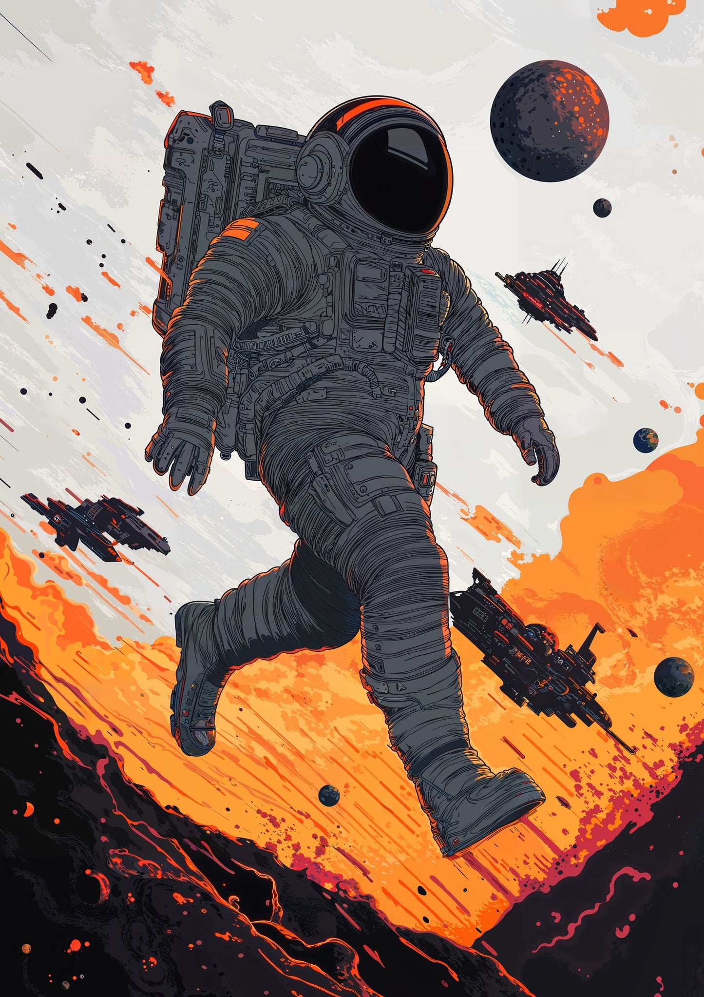 The "Spacewalk" poster showcases a lone astronaut traversing an extraterrestrial landscape, surrounded by burning orange skies and distant planets. This sci-fi-themed artwork captures the adventurous spirit of space exploration, with intricate details and contrasting hues. Ideal for fans of modern, graphic styles, this print highlights the allure of cosmic wonders and futuristic travels.