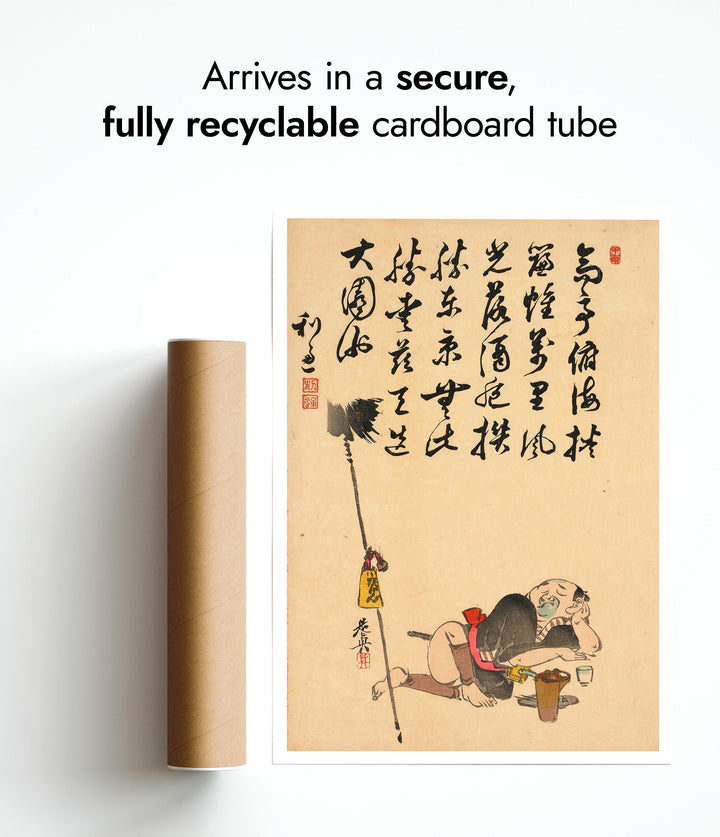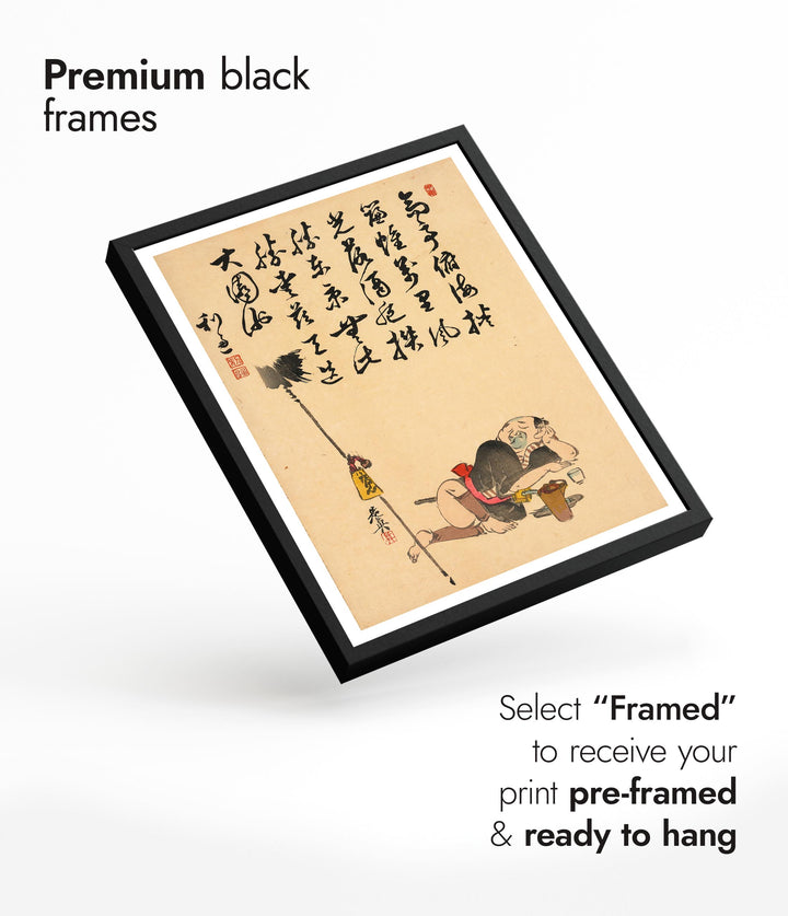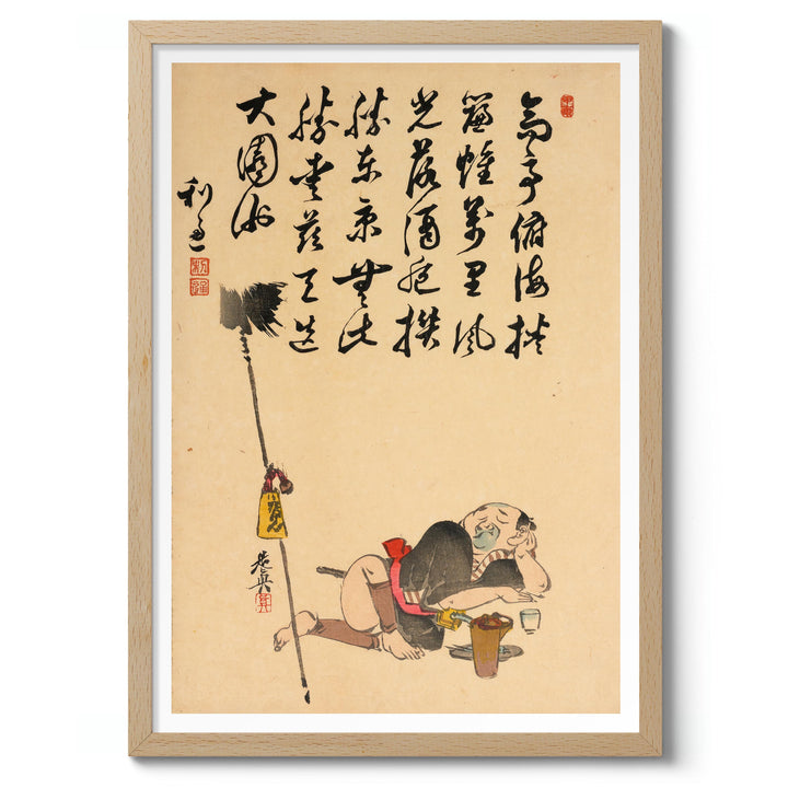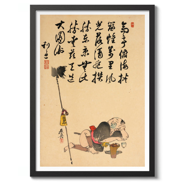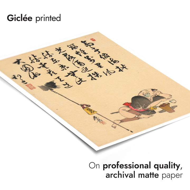 This traditional Japanese portrait poster, titled "Spear Holder" by Shibata Zeshin, features a weary warrior resting against a spear. The sumi-e painting showcases meticulous brushwork and authentic Japanese calligraphy, capturing a moment of respite amidst a warrior's duties. Ideal for fans of historical and oriental art, this piece embodies the timeless essence of traditional Japanese culture.