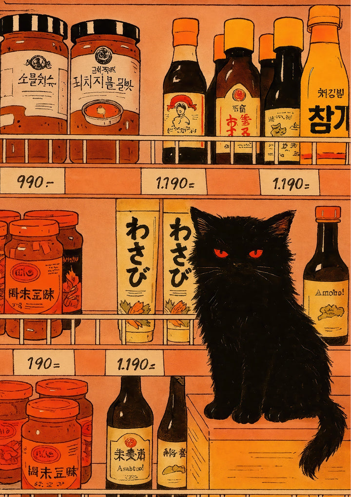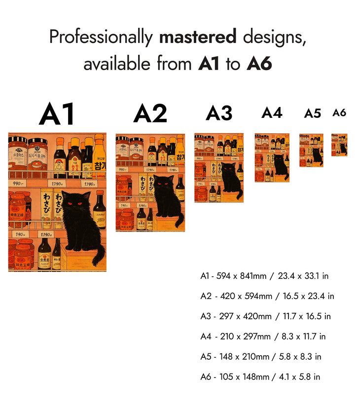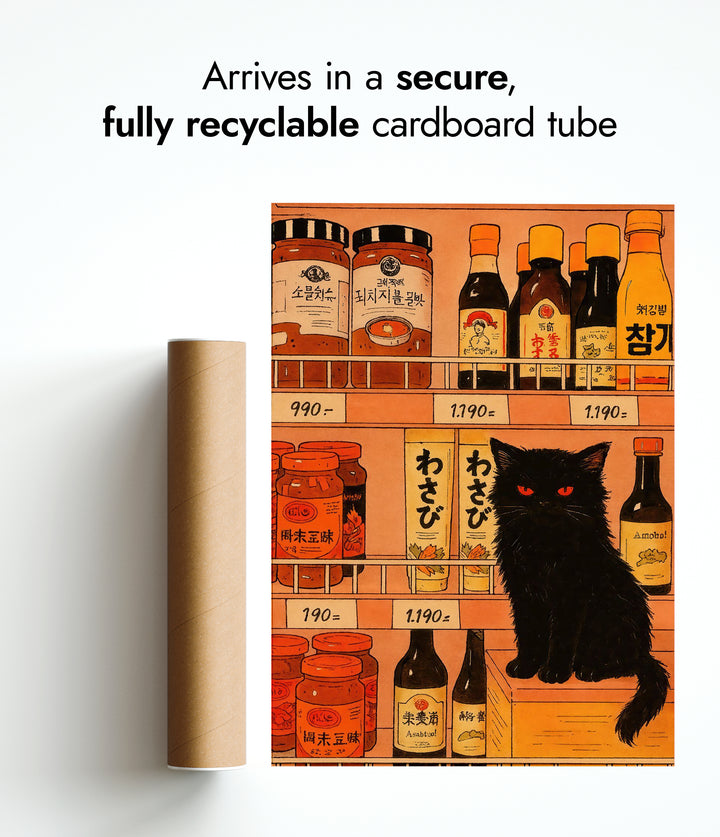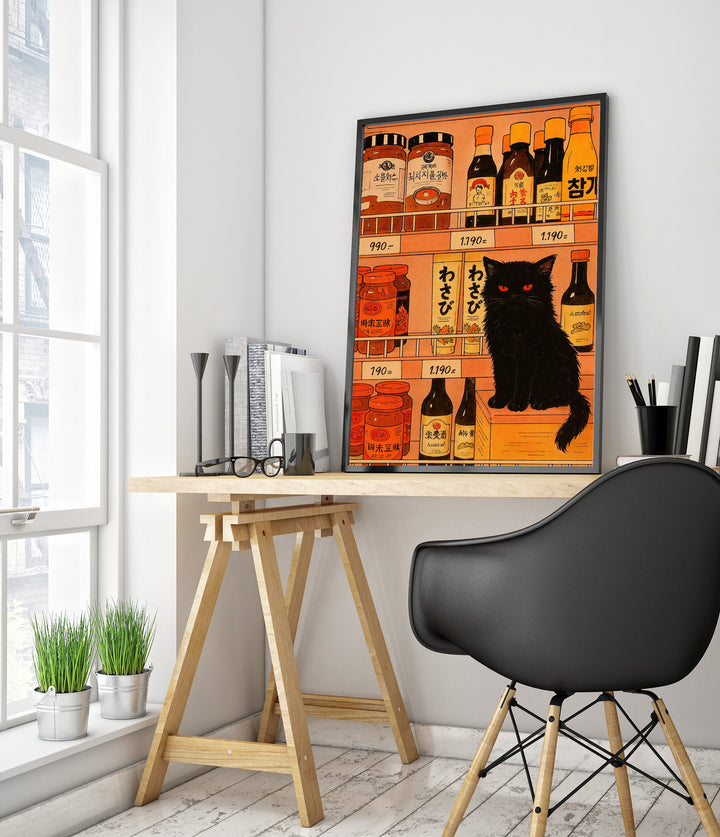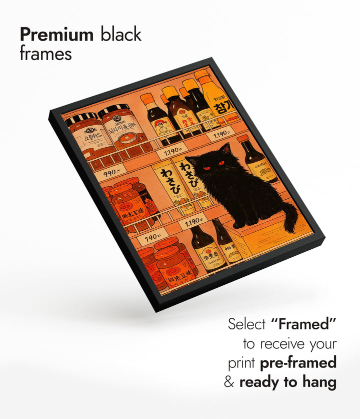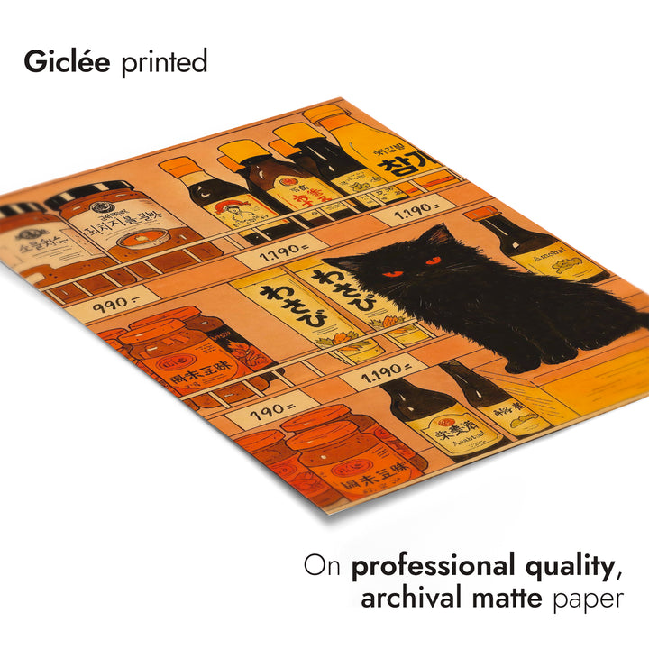 This poster, titled "Spice Shelf Cat," features a black cat sitting amidst an array of Japanese condiments, sauces, and jars. The vivid orange background with intricate anime-style illustrations captures a whimsical kitchen scene. Ideal for cat lovers and enthusiasts of Japanese culture, this artwork blends cuteness with culinary charm, perfect for adding character to your space.