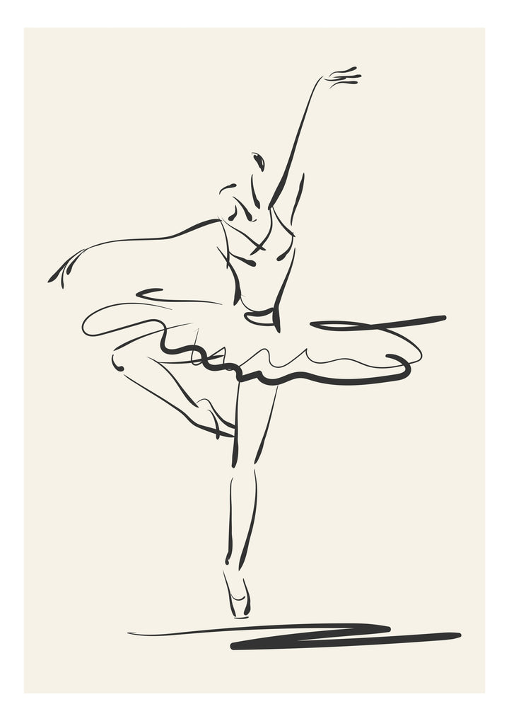 "Spirit in Motion" showcases the ethereal elegance of a ballet dancer captured in minimalist line art. This Scandi-style poster features fluid black lines on a soft beige background, highlighting the grace and poise of the dancer mid-movement. Perfect for adding a touch of artistic simplicity to any space.