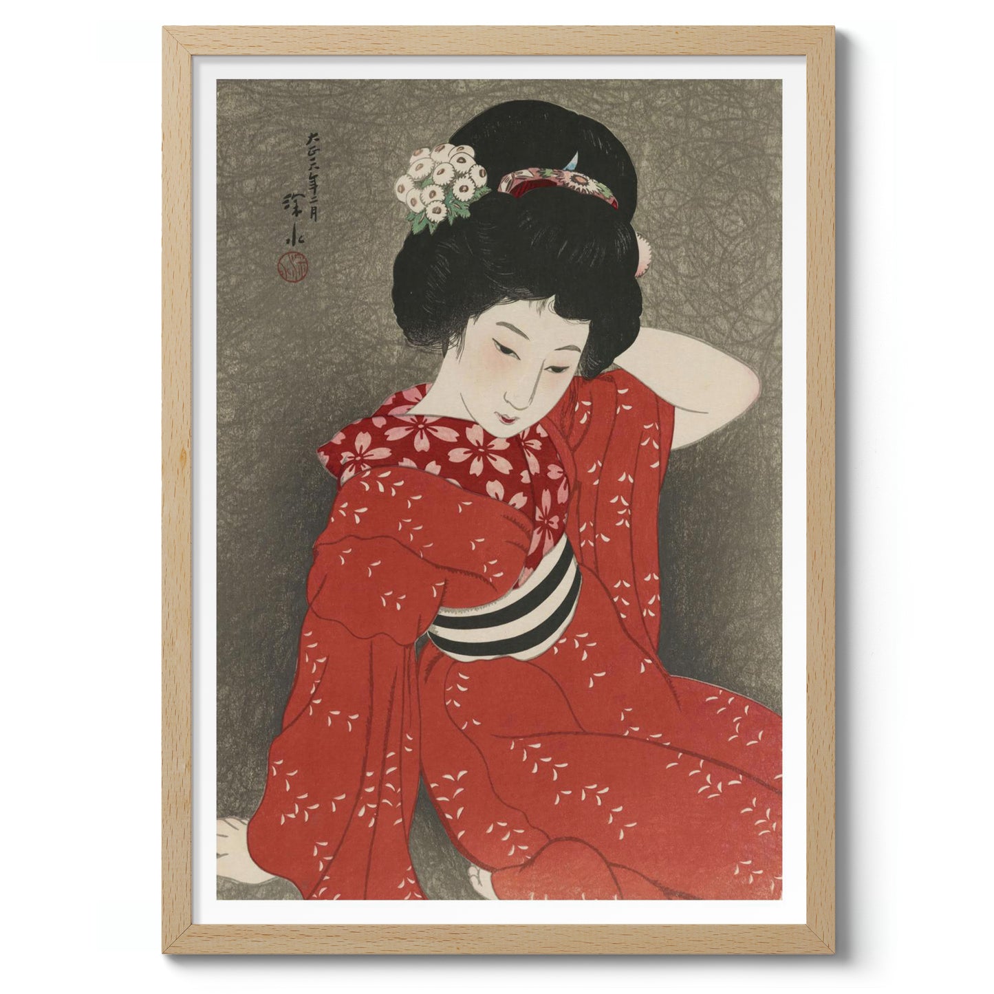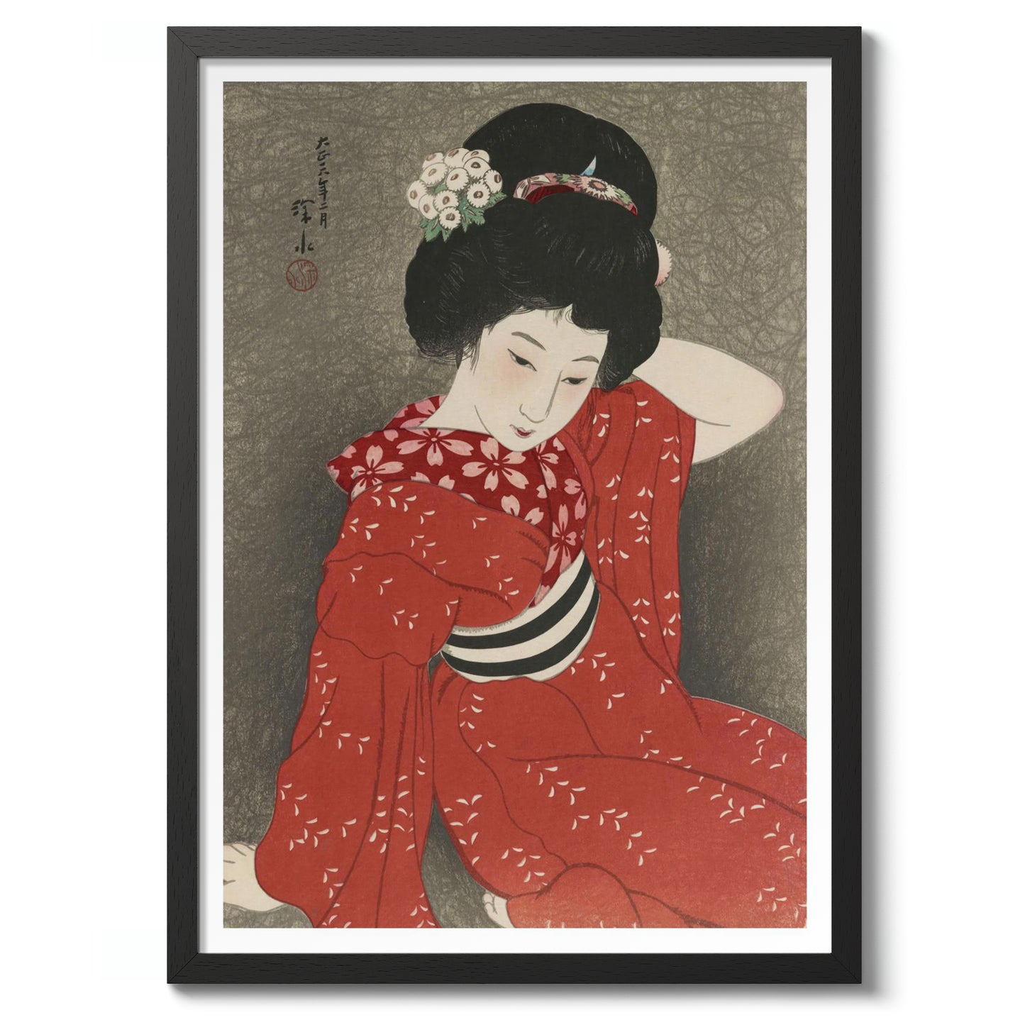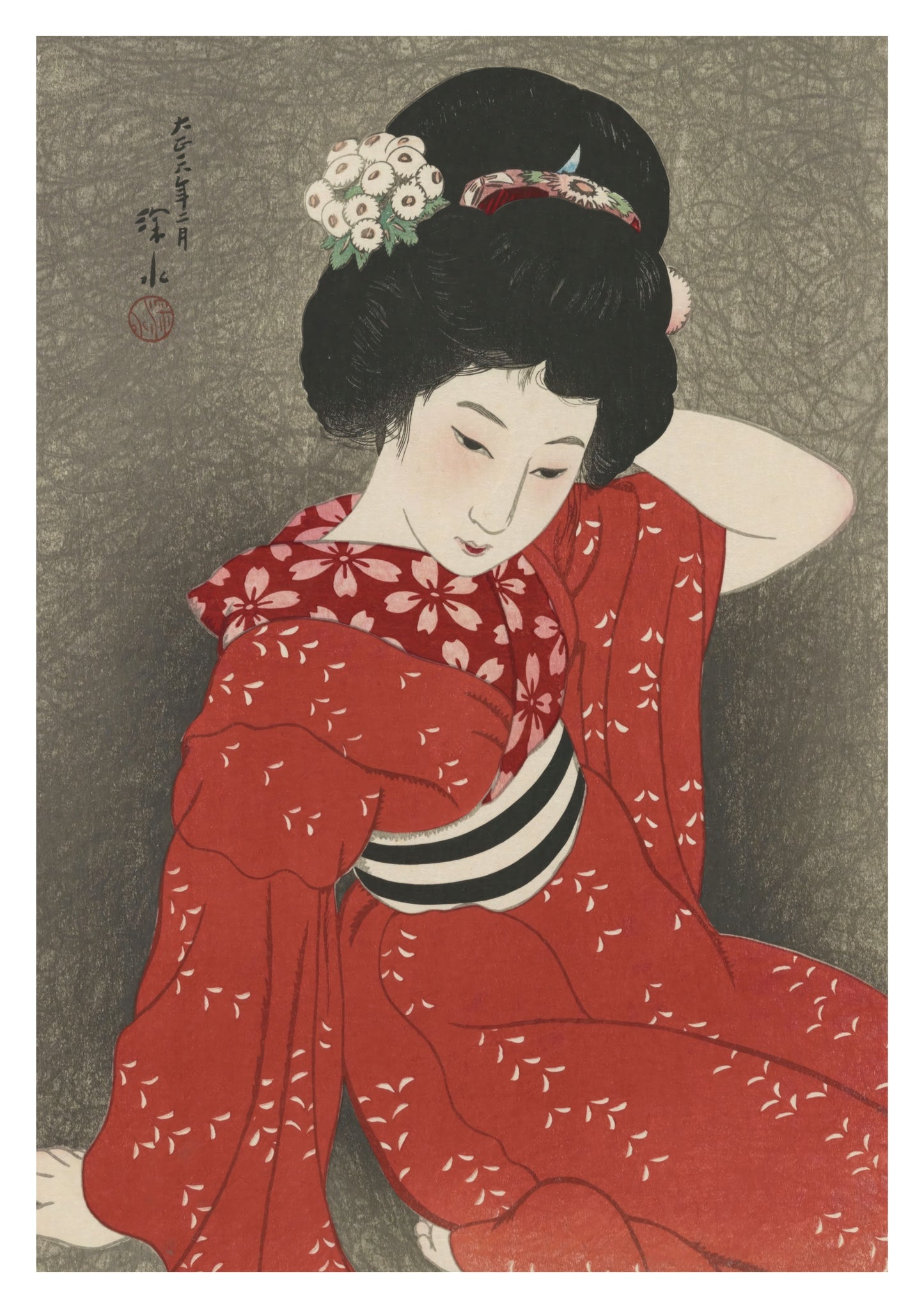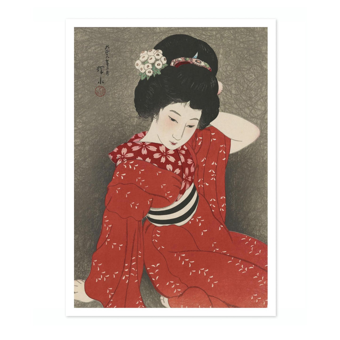 This elegant poster features a 1917 traditional Japanese woodblock print by Shinsui Ito. It depicts a serene woman gracefully posed in a red kimono adorned with delicate white floral patterns. Her intricately styled hair and gentle expression evoke a sense of tranquility. The muted grey background enhances the boldness of her attire, embodying the ukiyo-e and shin-hanga art styles.
