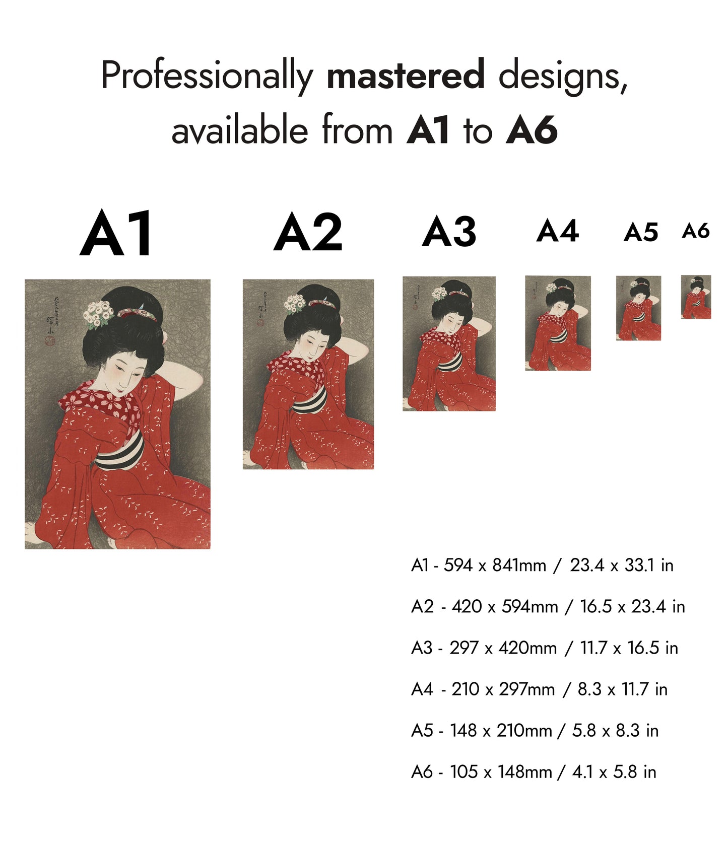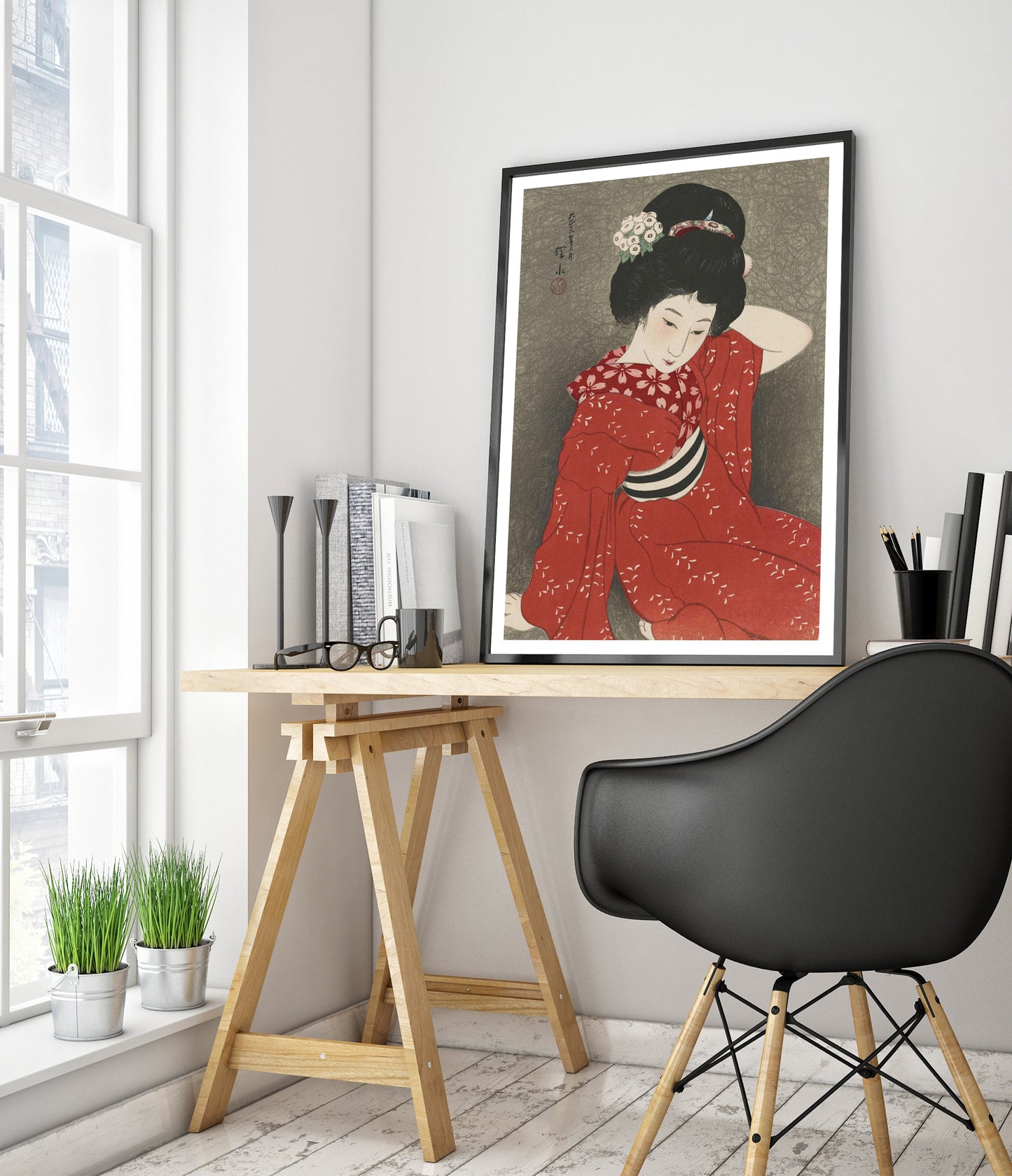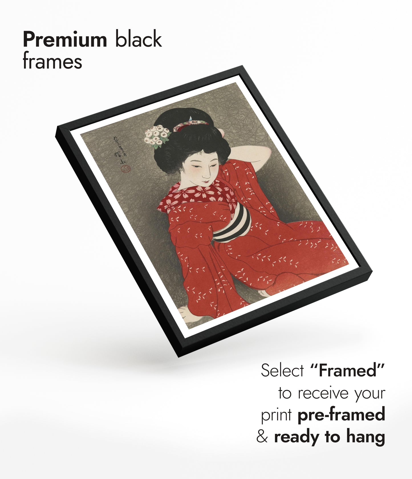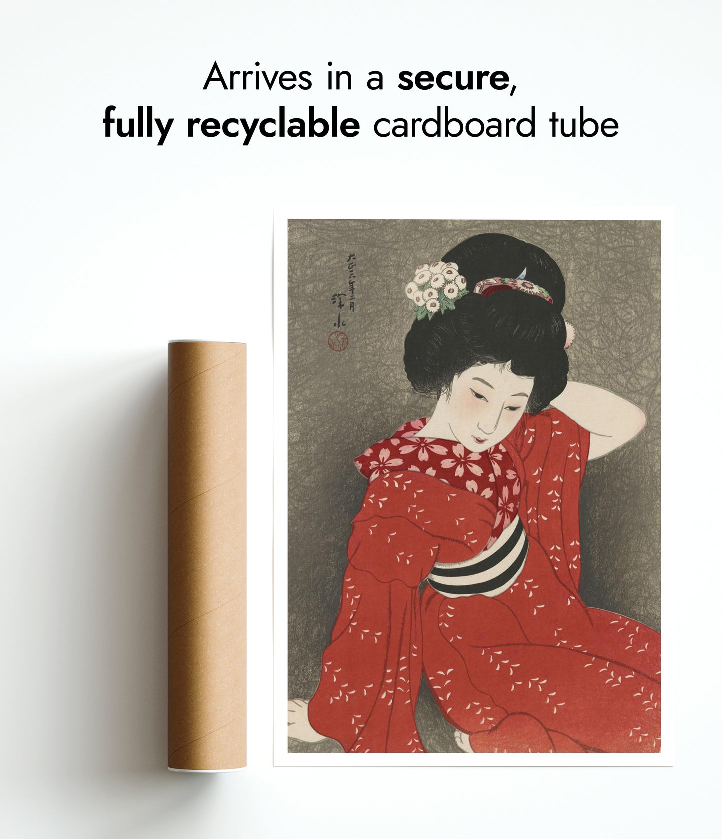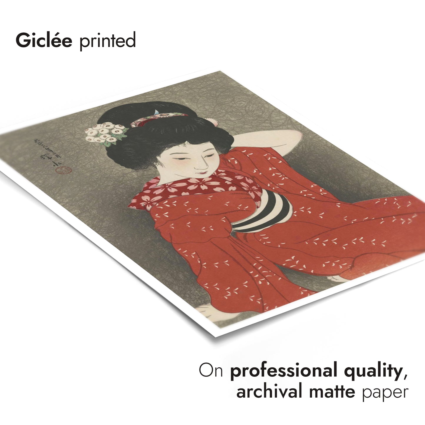 This elegant poster features a 1917 traditional Japanese woodblock print by Shinsui Ito. It depicts a serene woman gracefully posed in a red kimono adorned with delicate white floral patterns. Her intricately styled hair and gentle expression evoke a sense of tranquility. The muted grey background enhances the boldness of her attire, embodying the ukiyo-e and shin-hanga art styles.
