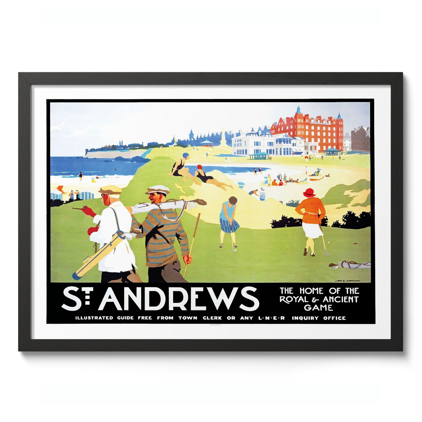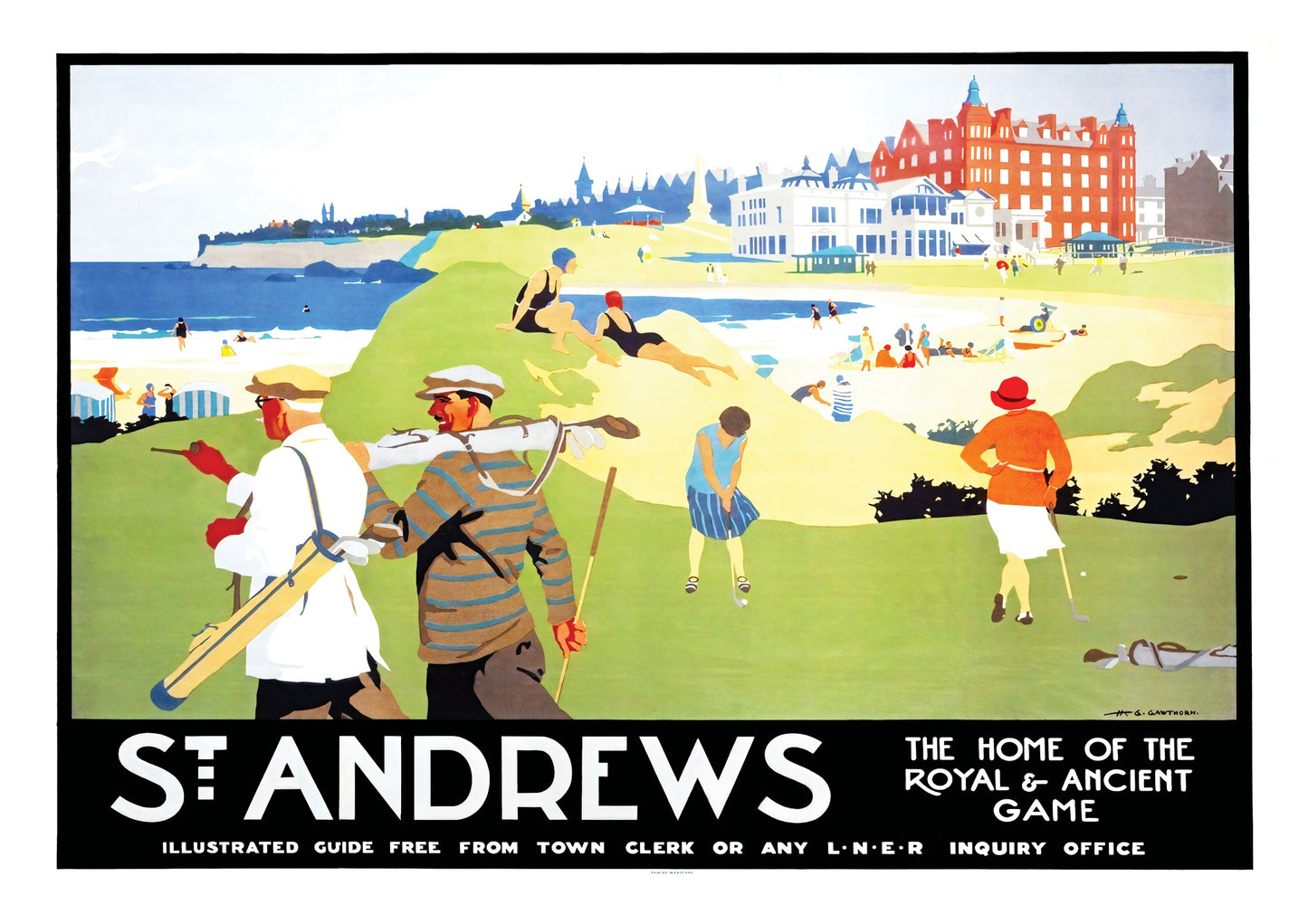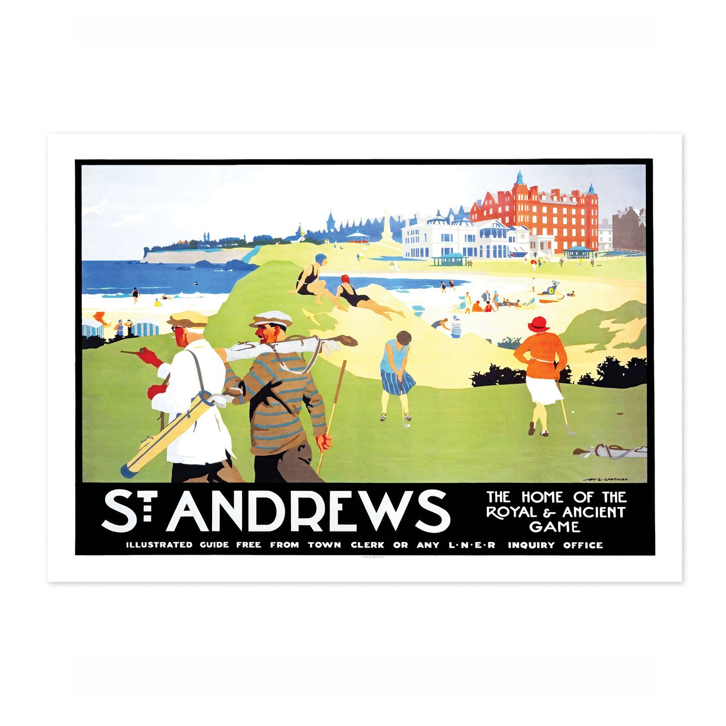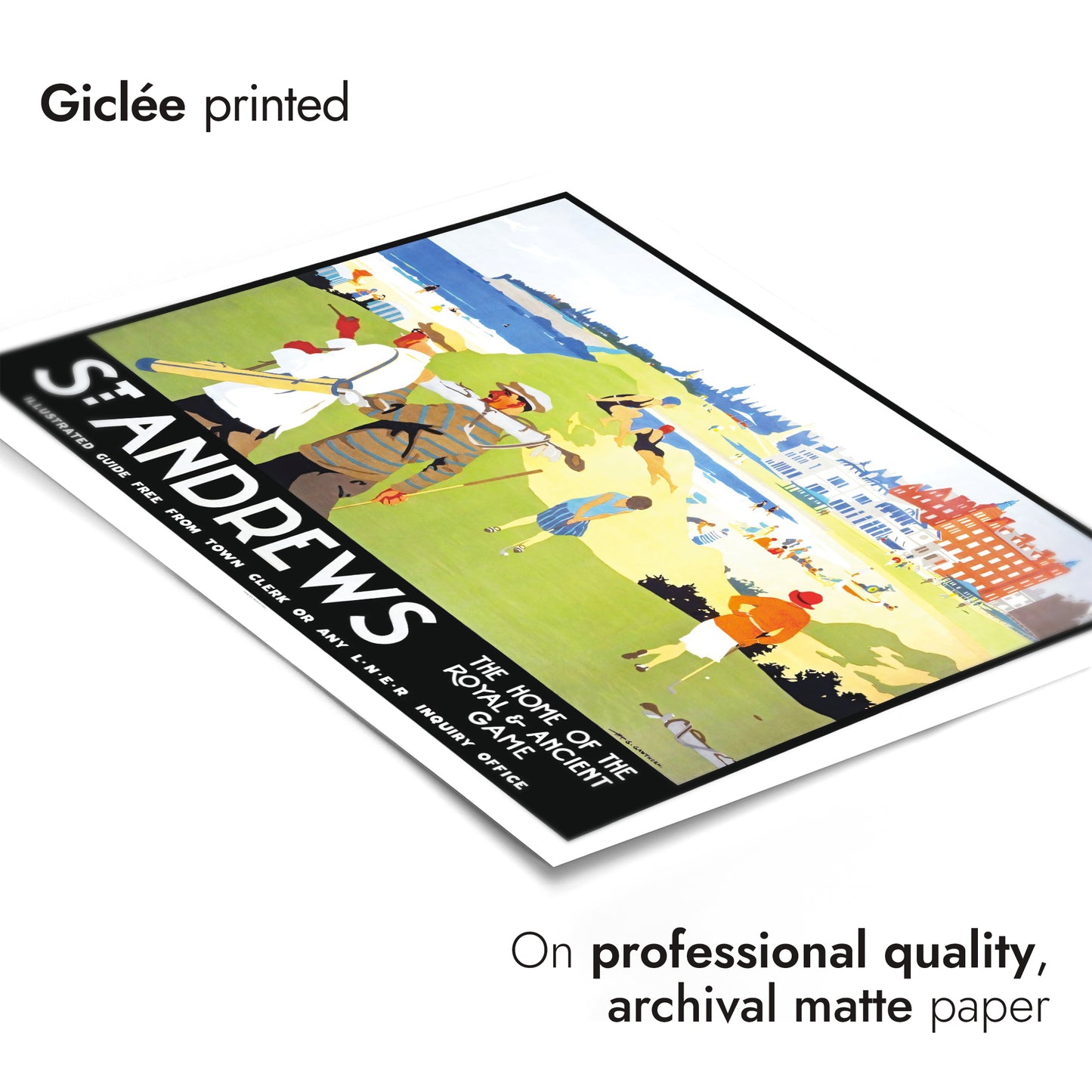 This vintage illustration poster of "St. Andrews" beautifully encapsulates the timeless allure of the renowned golf destination in Scotland. Featuring golfers in classic attire against a vibrant backdrop of lush greens and beachfront, it symbolizes the iconic "Home of the Royal & Ancient Game." Ideal for travel enthusiasts and sport aficionados, this artwork brings Britain’s golfing heritage to life.