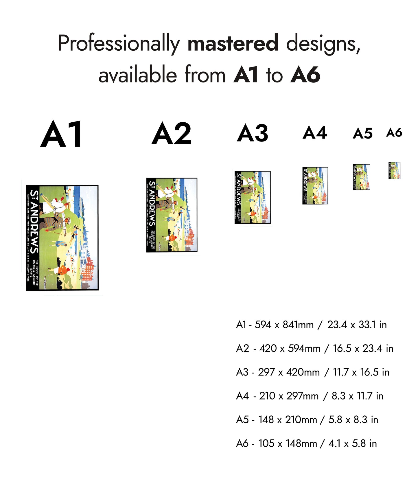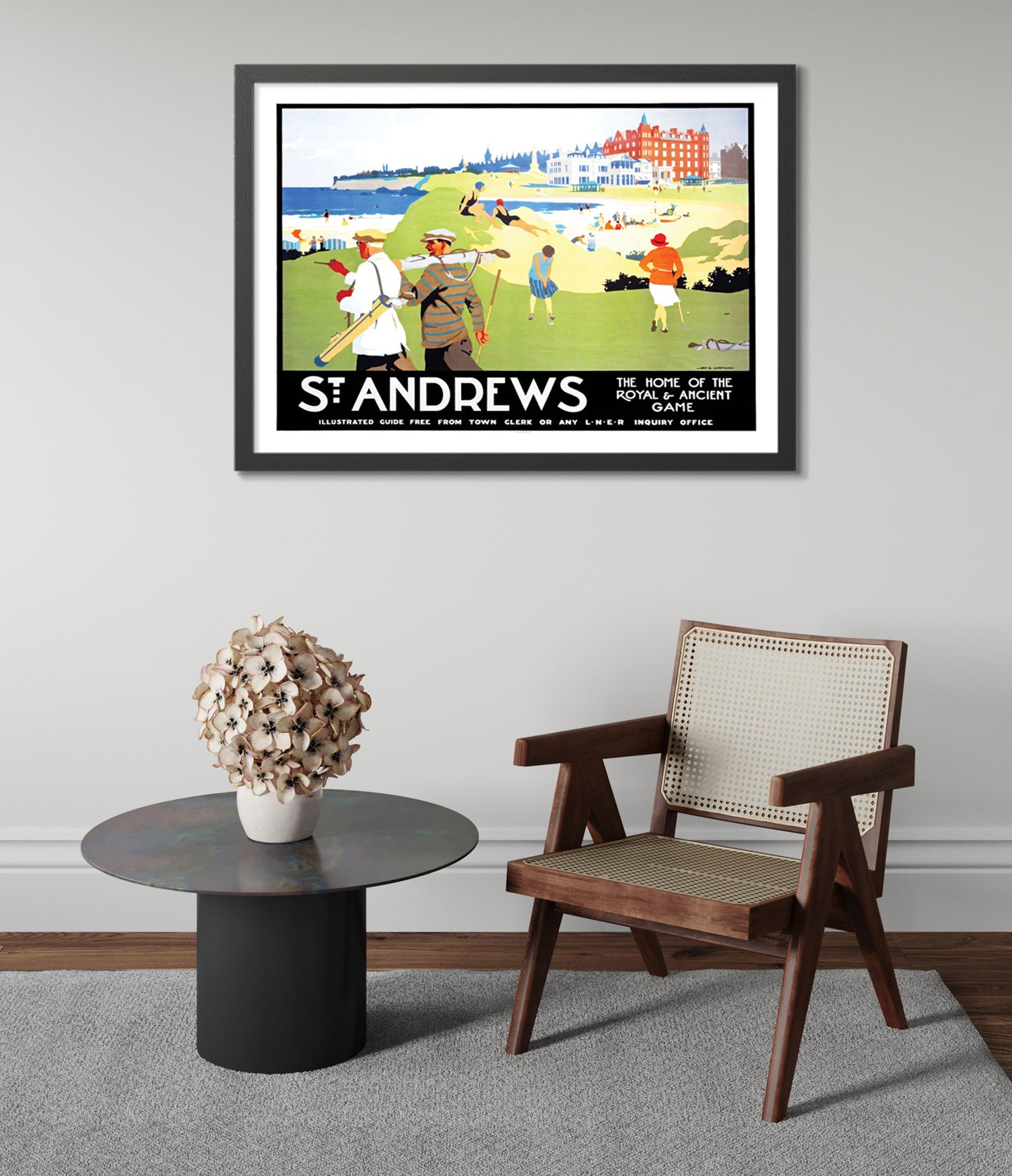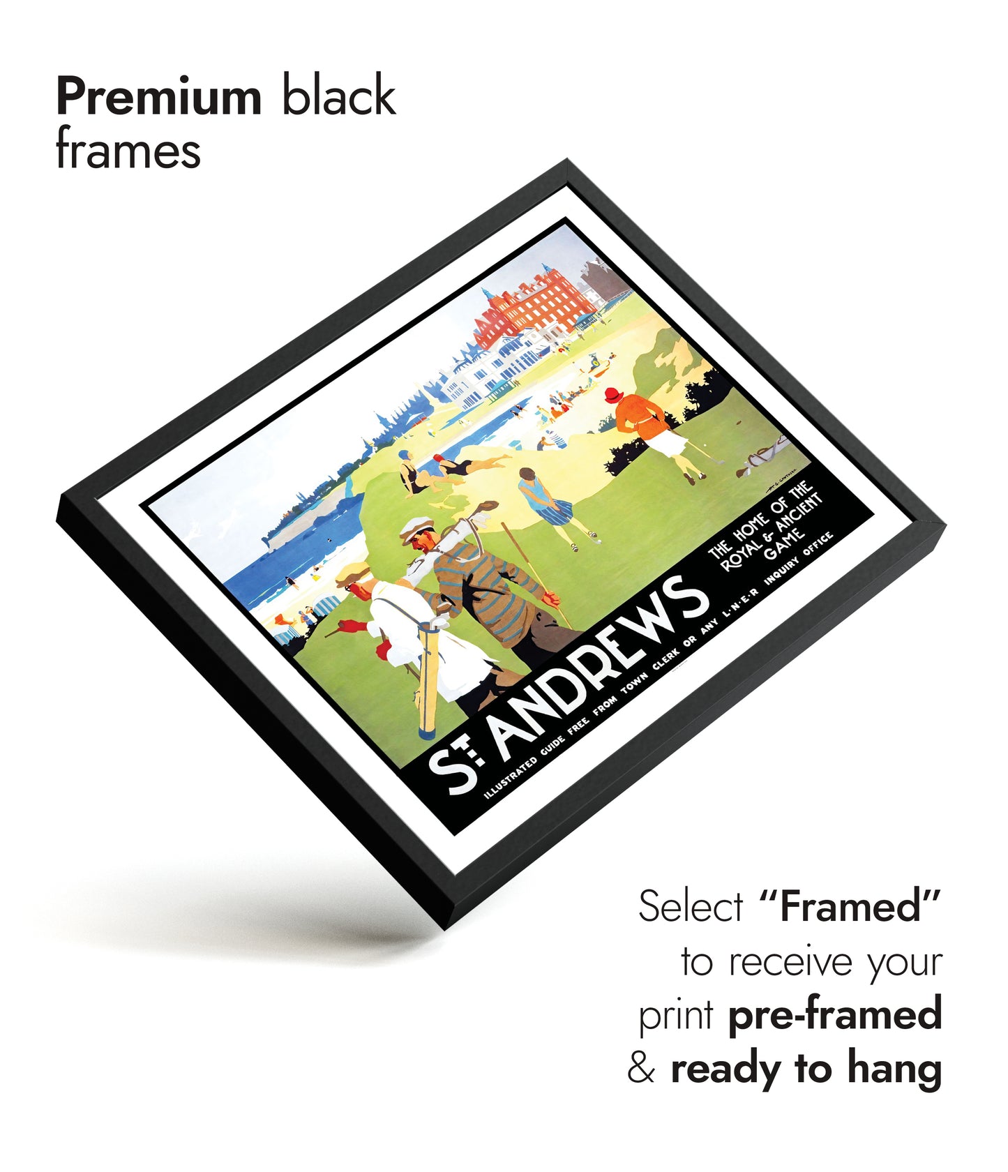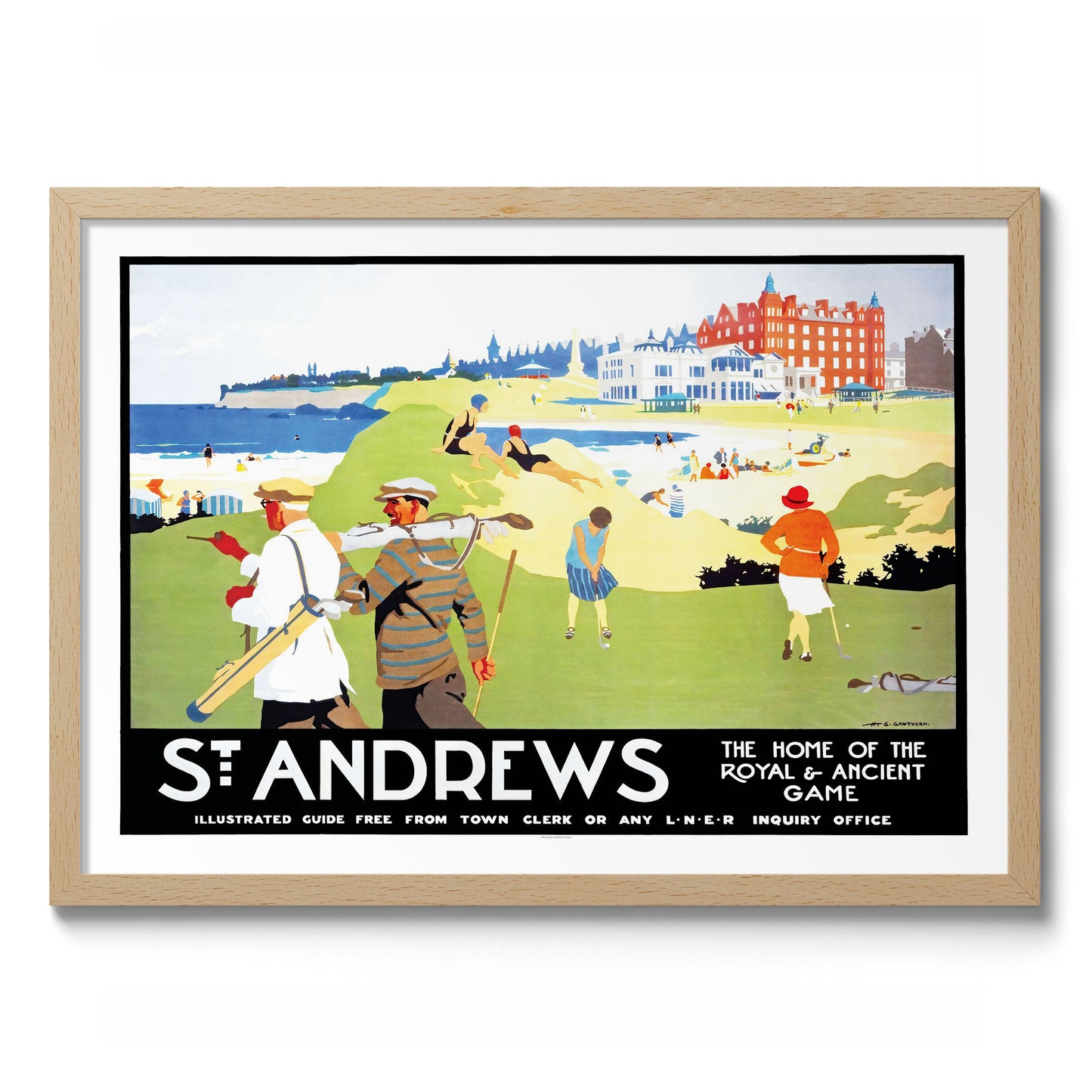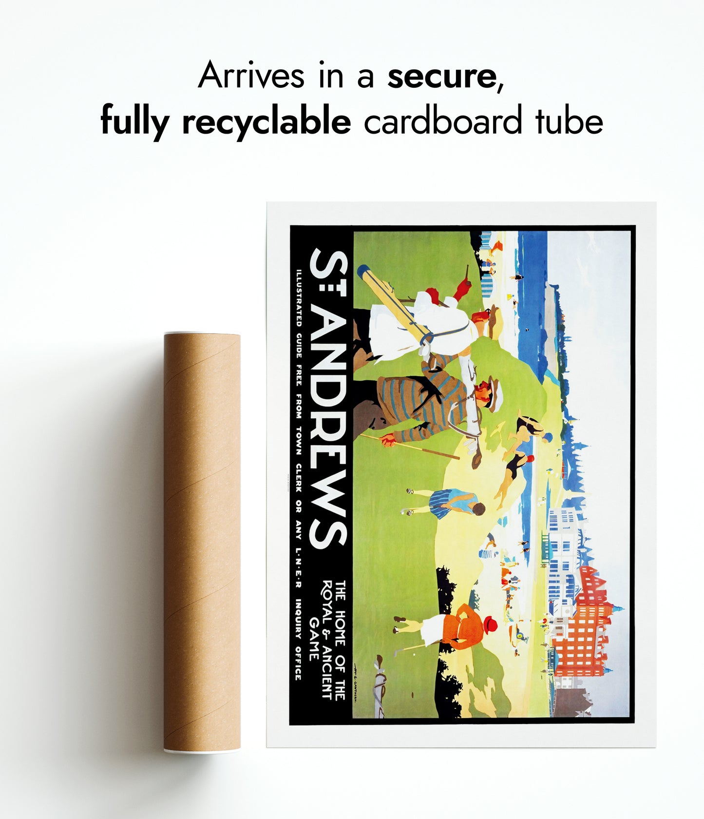 This vintage illustration poster of "St. Andrews" beautifully encapsulates the timeless allure of the renowned golf destination in Scotland. Featuring golfers in classic attire against a vibrant backdrop of lush greens and beachfront, it symbolizes the iconic "Home of the Royal & Ancient Game." Ideal for travel enthusiasts and sport aficionados, this artwork brings Britain’s golfing heritage to life.