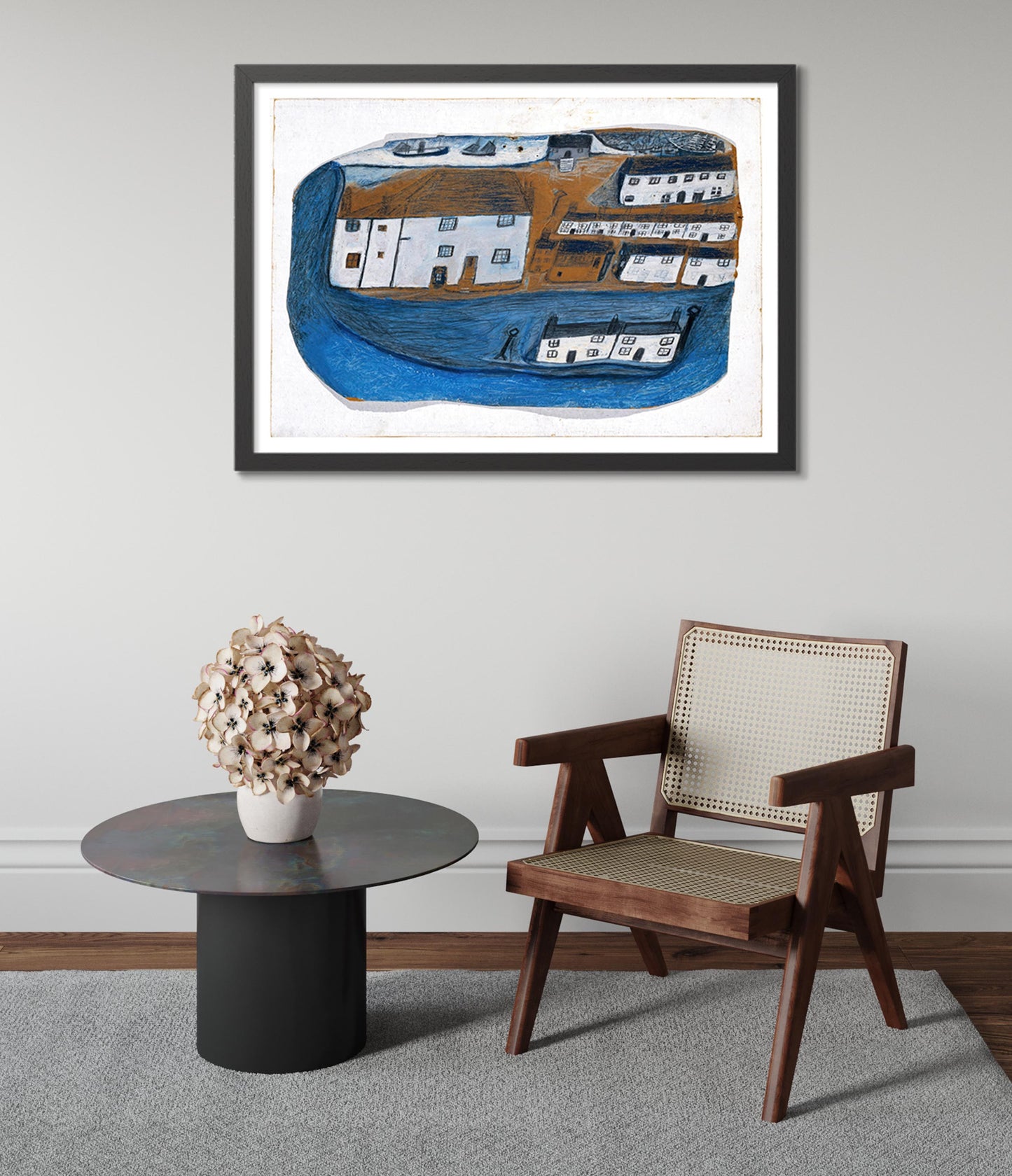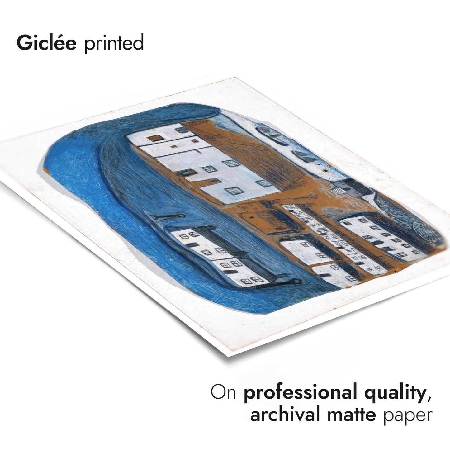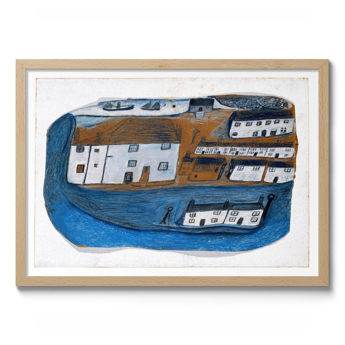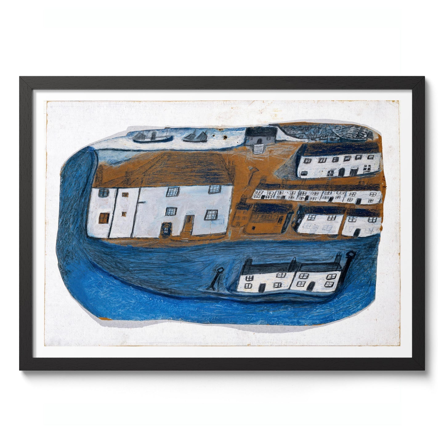 The "St. Ives" poster by Alfred Wallis showcases a naive landscape painting style, depicting the serene seaside village of St. Ives, Cornwall. The artwork features rustic houses set against a backdrop of blue sea and rugged cliffs. Wallis's primitive technique and use of earthy tones beautifully capture the essence of this charming English harbor. Perfect for adding coastal charm to your space.