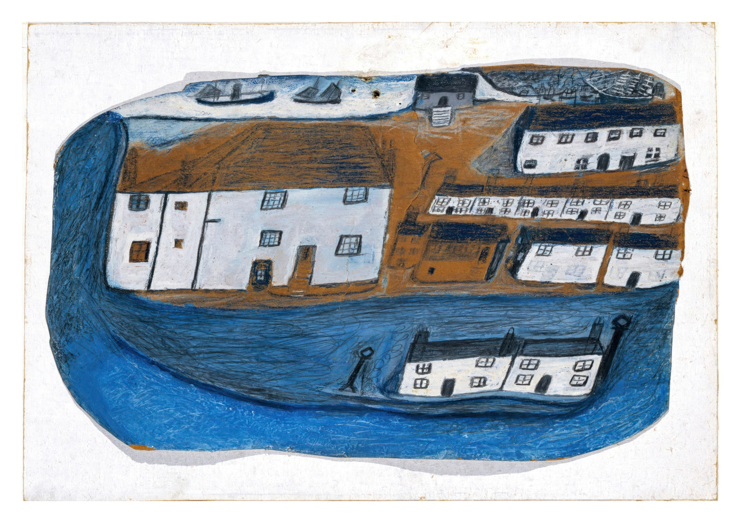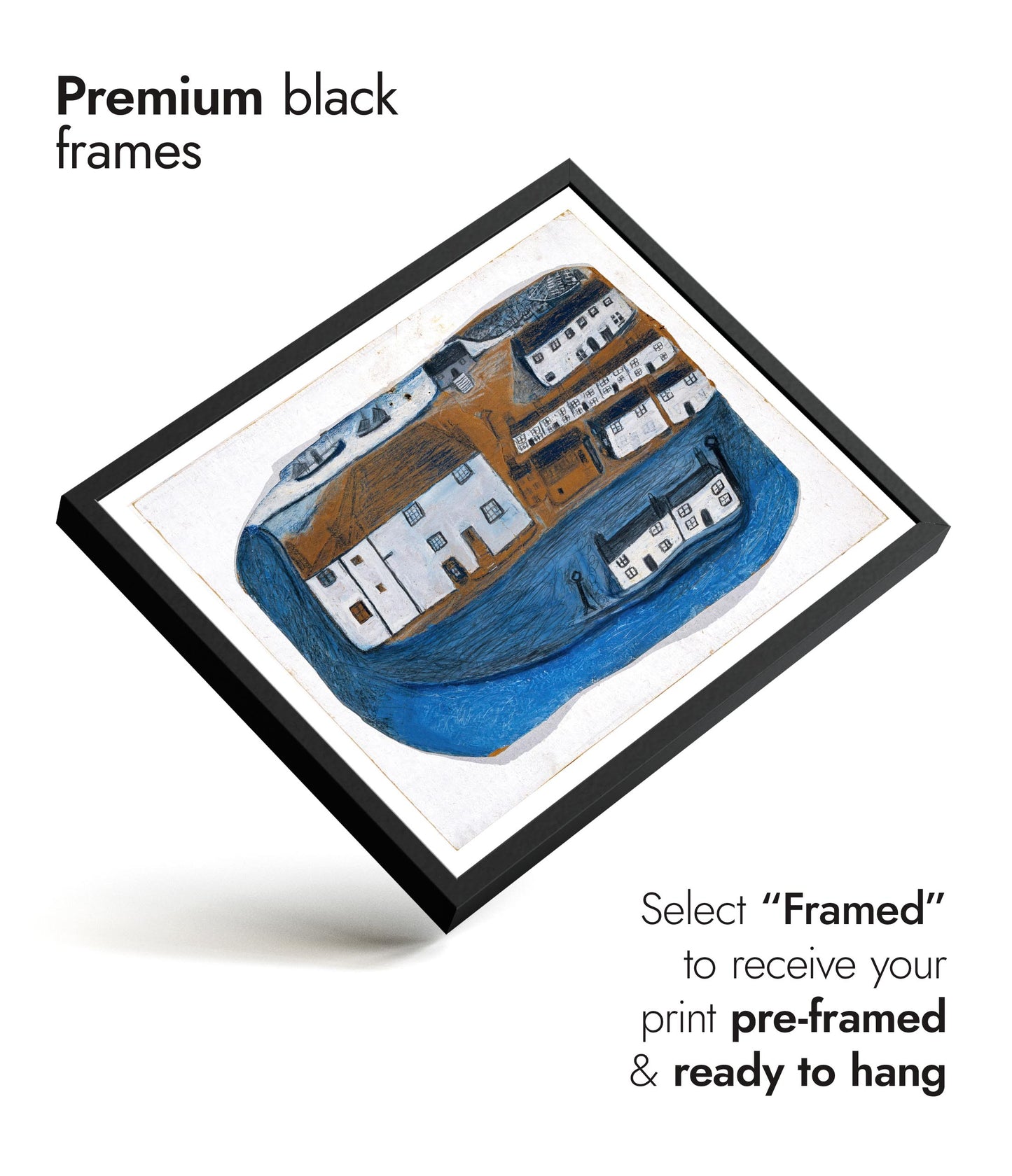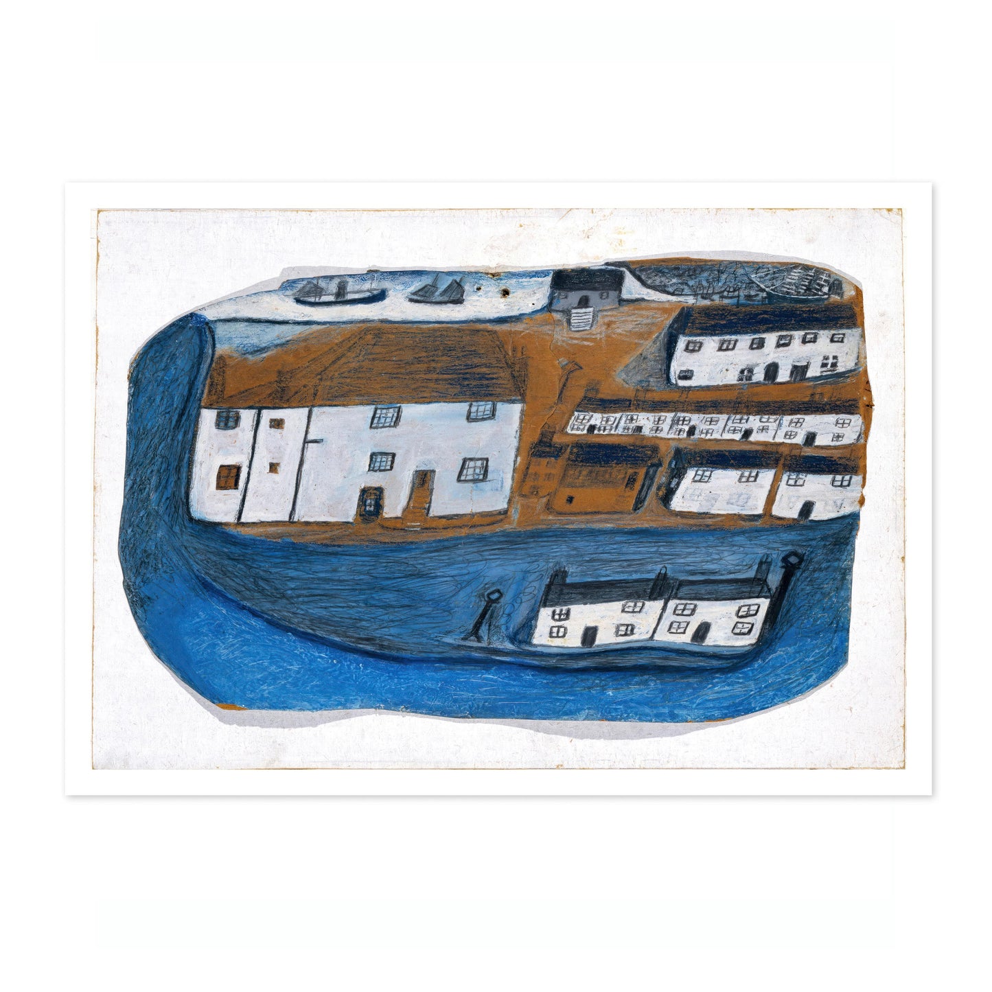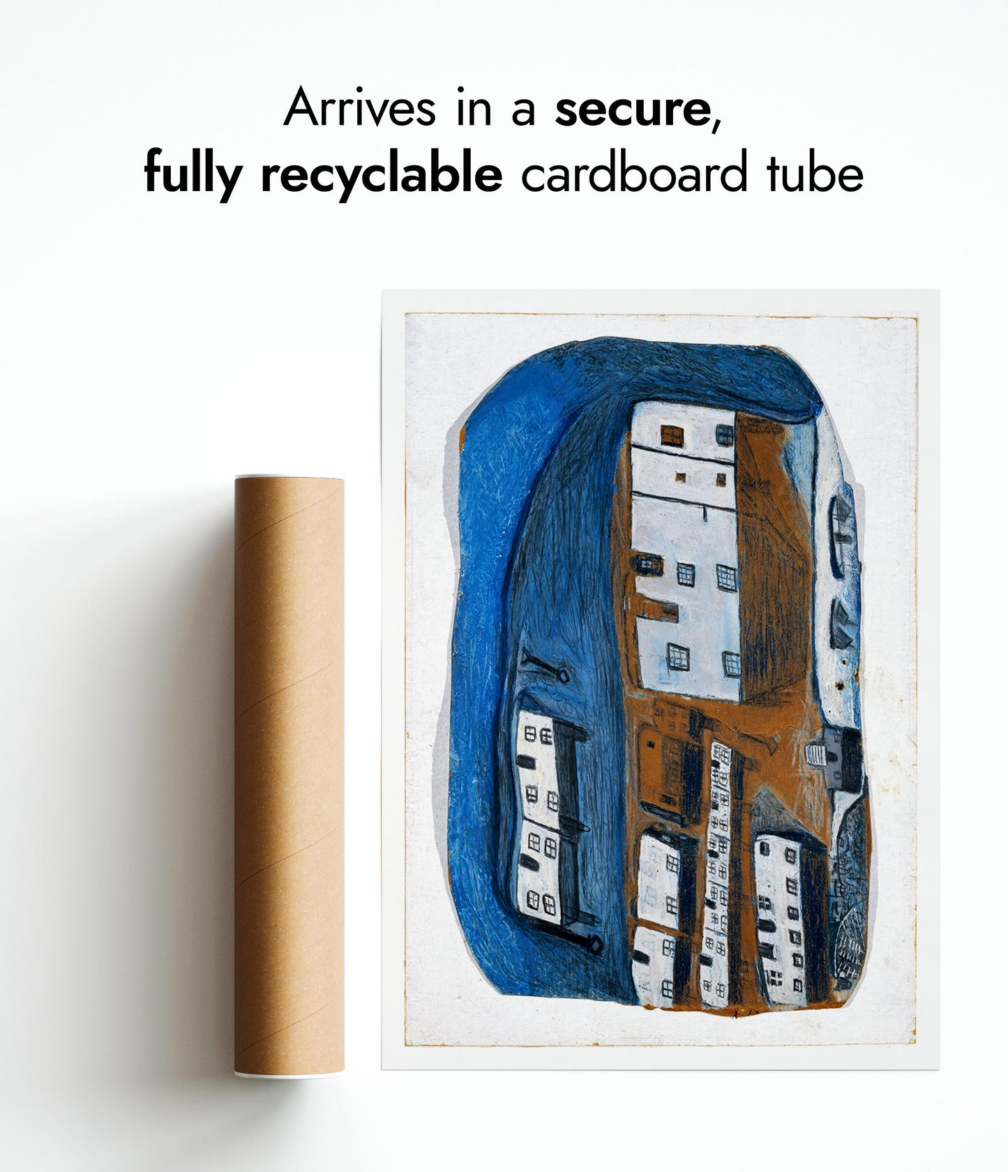 The "St. Ives" poster by Alfred Wallis showcases a naive landscape painting style, depicting the serene seaside village of St. Ives, Cornwall. The artwork features rustic houses set against a backdrop of blue sea and rugged cliffs. Wallis's primitive technique and use of earthy tones beautifully capture the essence of this charming English harbor. Perfect for adding coastal charm to your space.
