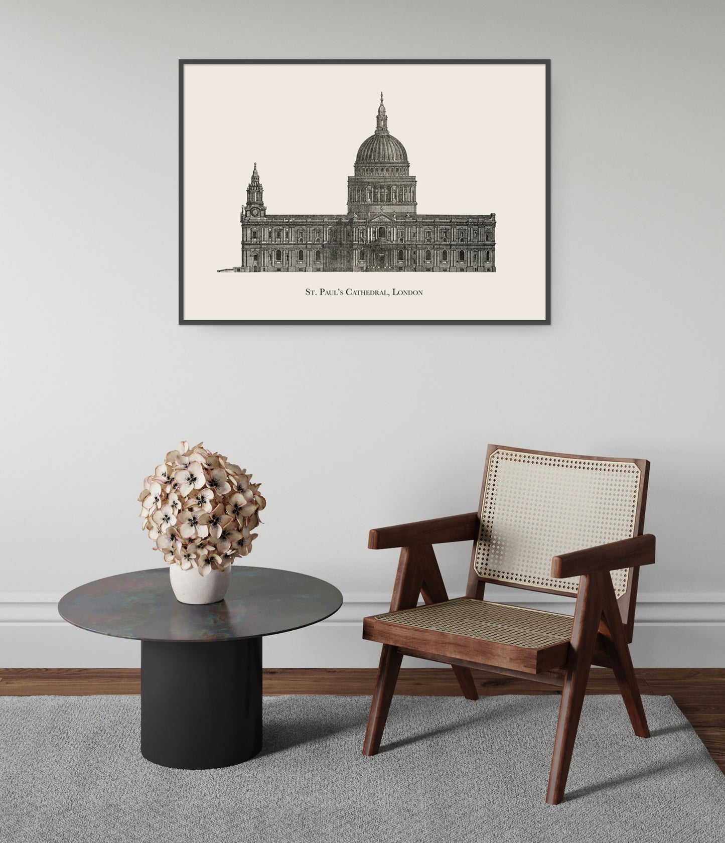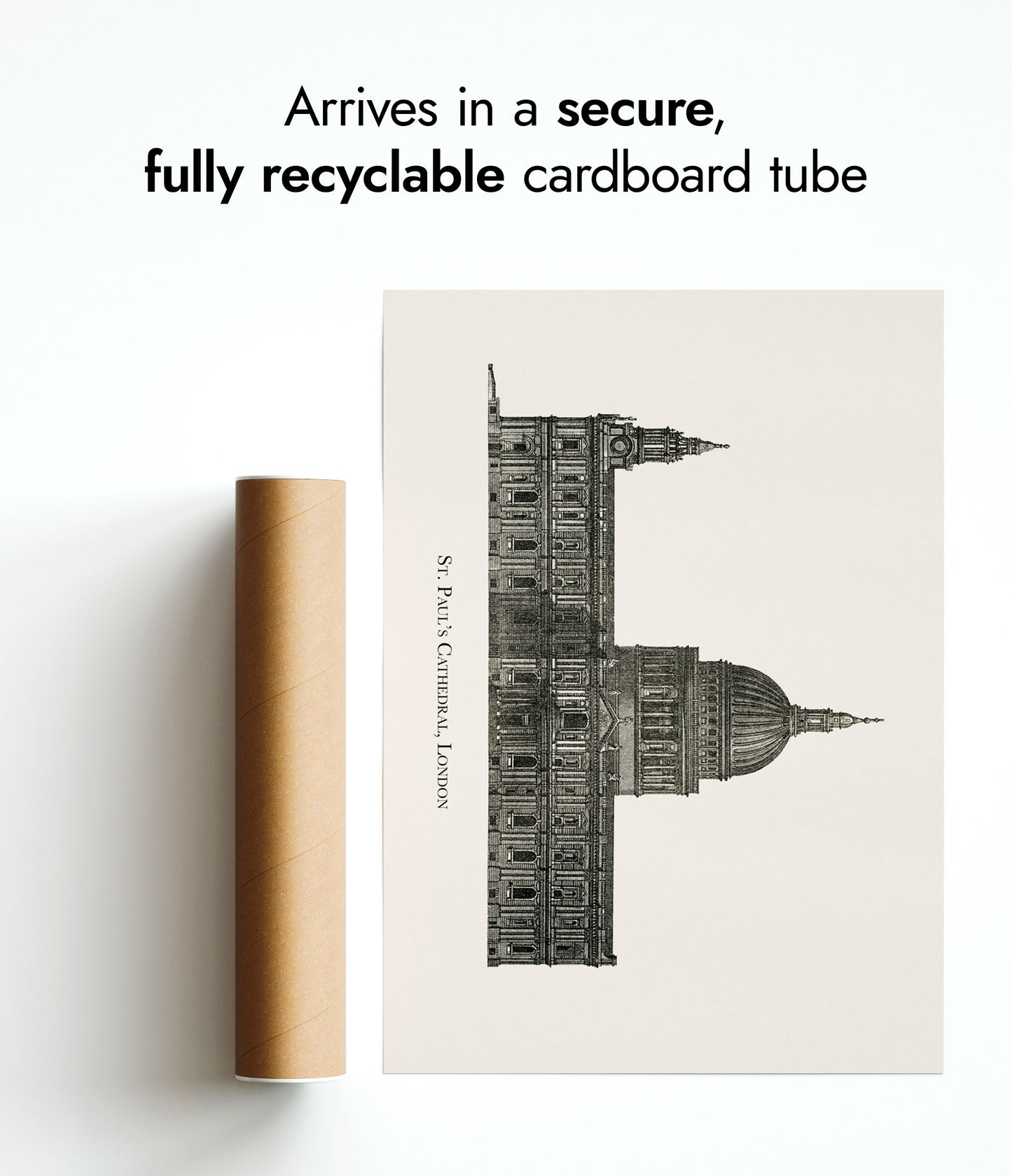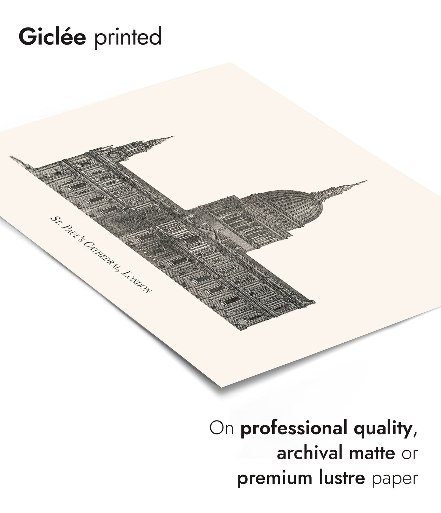 This vintage-style poster depicts St. Paul's Cathedral in London. The intricate line art illustration captures the historic architectural details of this iconic English landmark. Perfect for fans of classic architecture and travel enthusiasts, this cathedral poster adds a touch of timeless elegance to any space, highlighting the grandeur of one of the UK's most famous buildings.