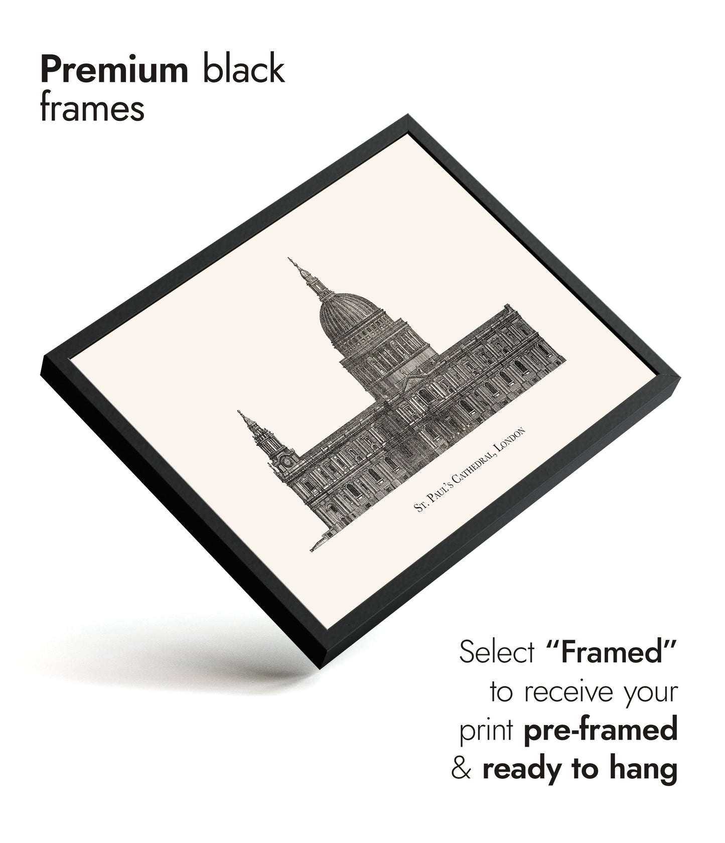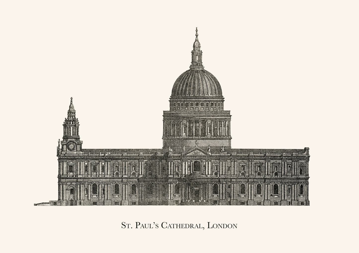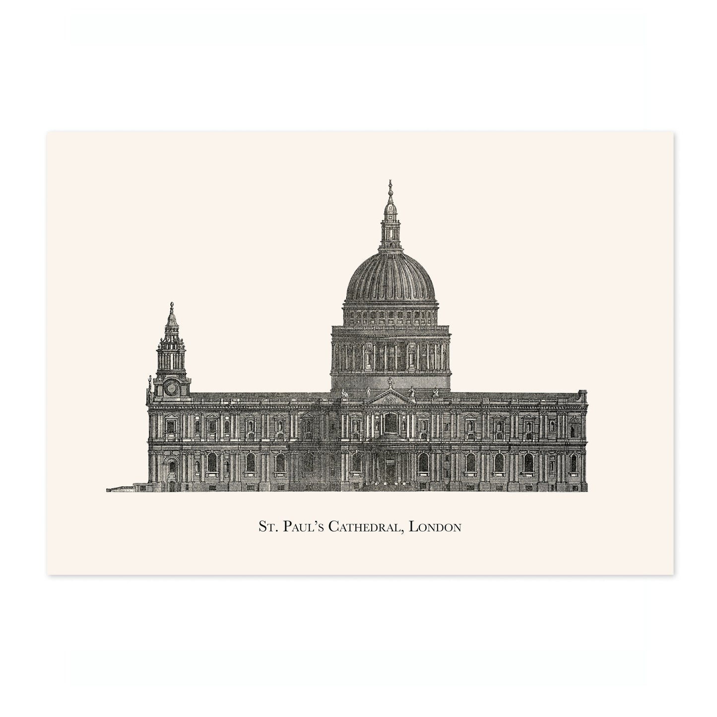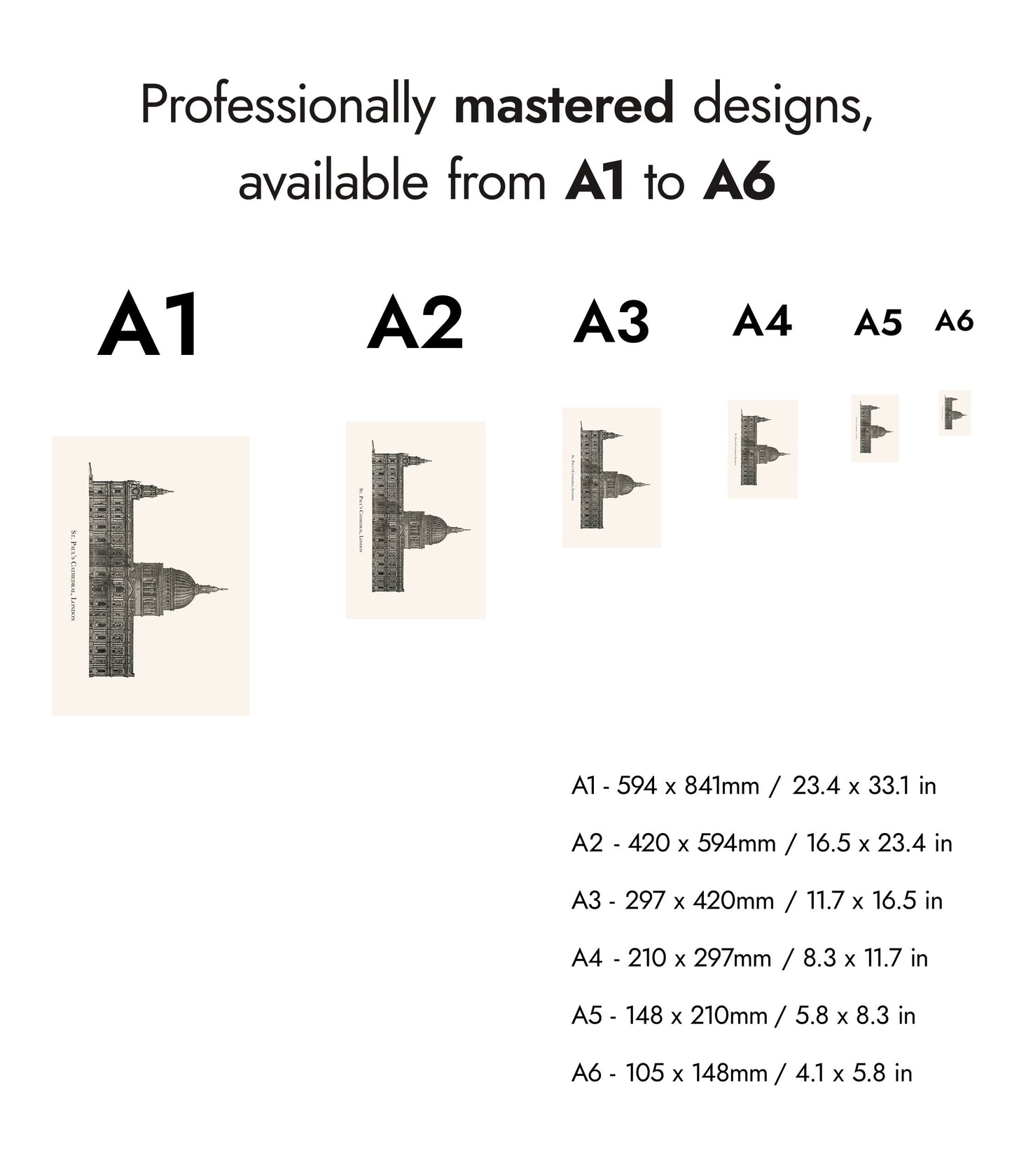 This vintage-style poster depicts St. Paul's Cathedral in London. The intricate line art illustration captures the historic architectural details of this iconic English landmark. Perfect for fans of classic architecture and travel enthusiasts, this cathedral poster adds a touch of timeless elegance to any space, highlighting the grandeur of one of the UK's most famous buildings.