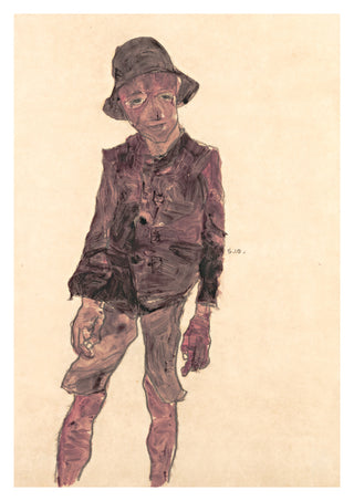 "Standing Boy with Hat" by Egon Schiele is a striking expressionist portrait poster depicting a young boy dressed in a jacket and hat. The muted colours and raw brushstrokes emphasize the boy's contemplative expression and delicate physique. An excellent choice for art enthusiasts seeking a poignant and evocative piece, capturing the essence of Schiele's unique artistic style.