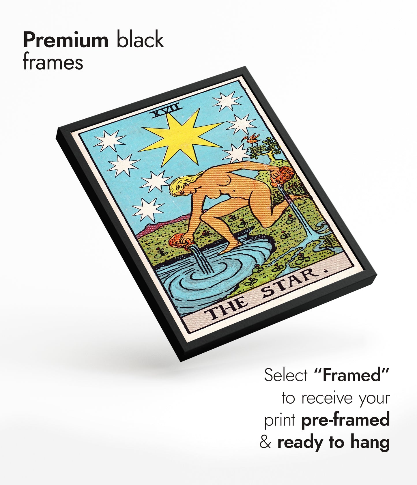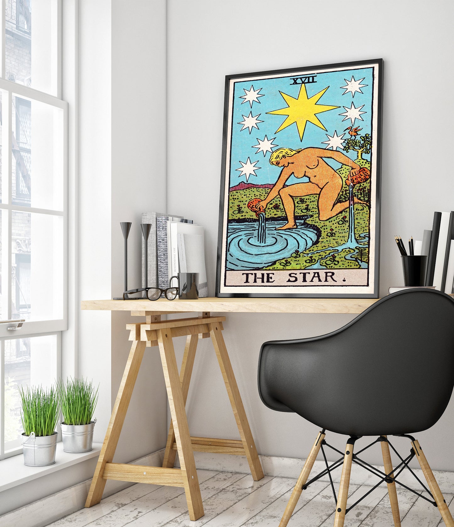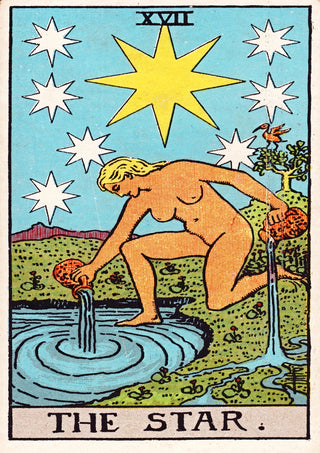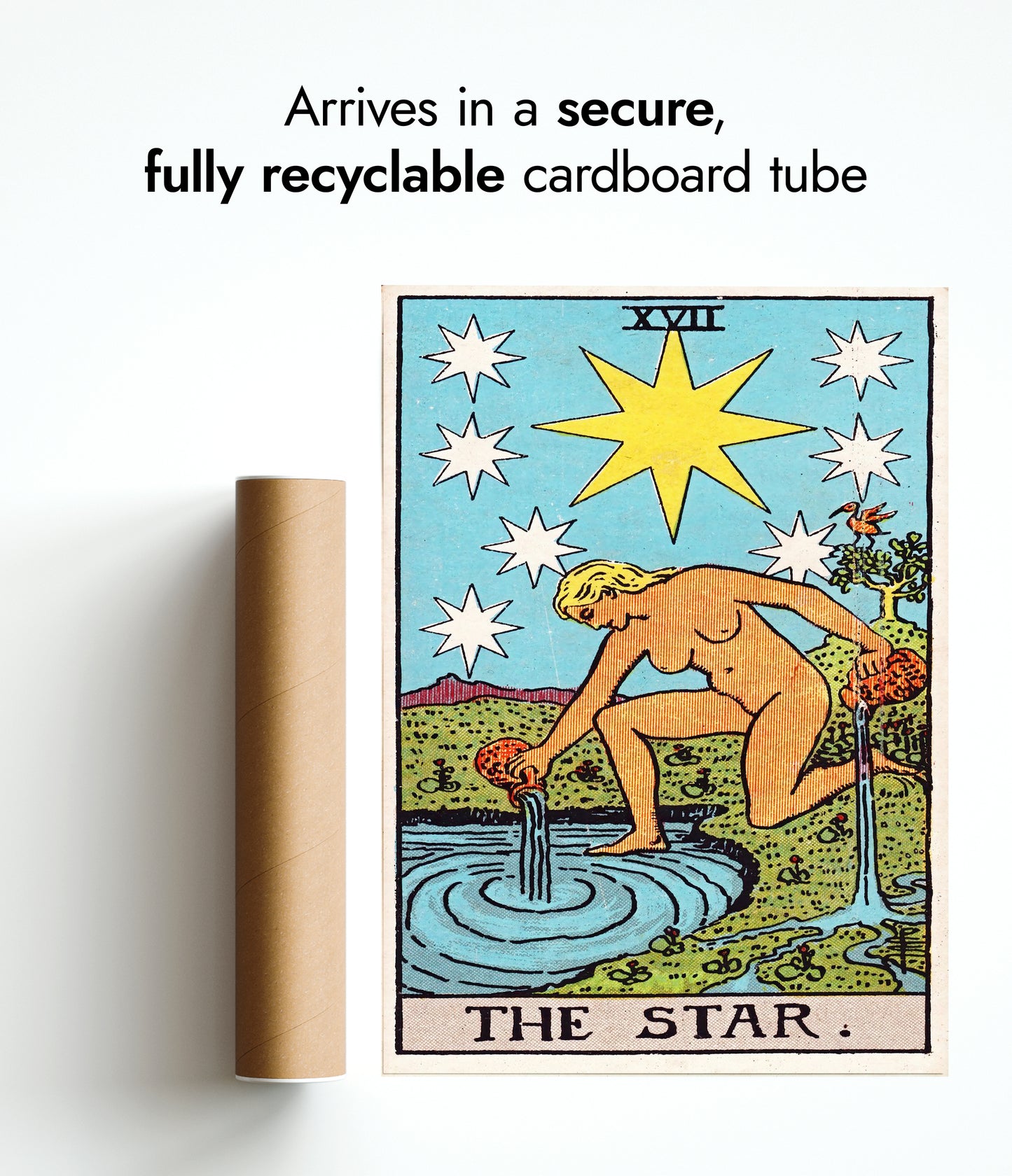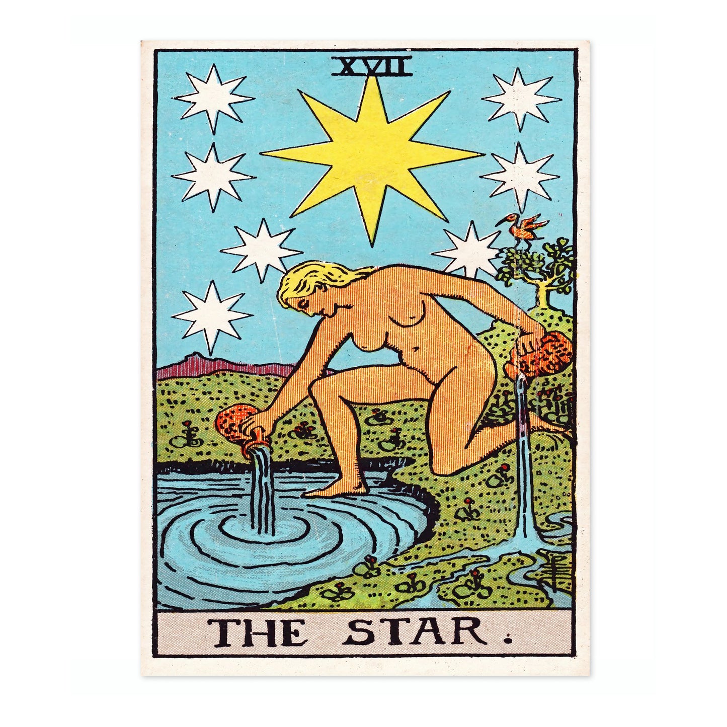 This vibrant vintage-style tarot poster, titled "The Star," captures a serene scene with a nude figure gracefully pouring water into a tranquil pond. Set against a backdrop of lush greenery and a radiant sky studded with stars, this piece embodies themes of spirituality and renewal. Perfect for lovers of spiritual and illustrative art in calming blue and green tones.