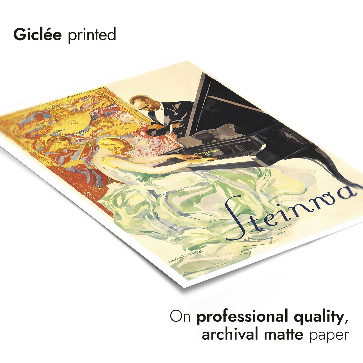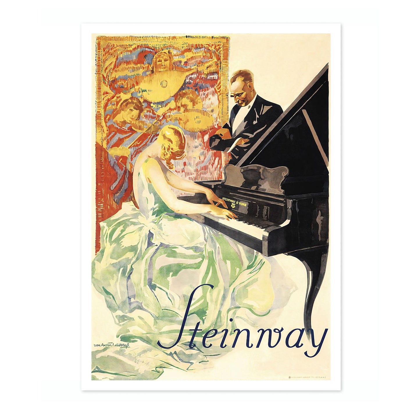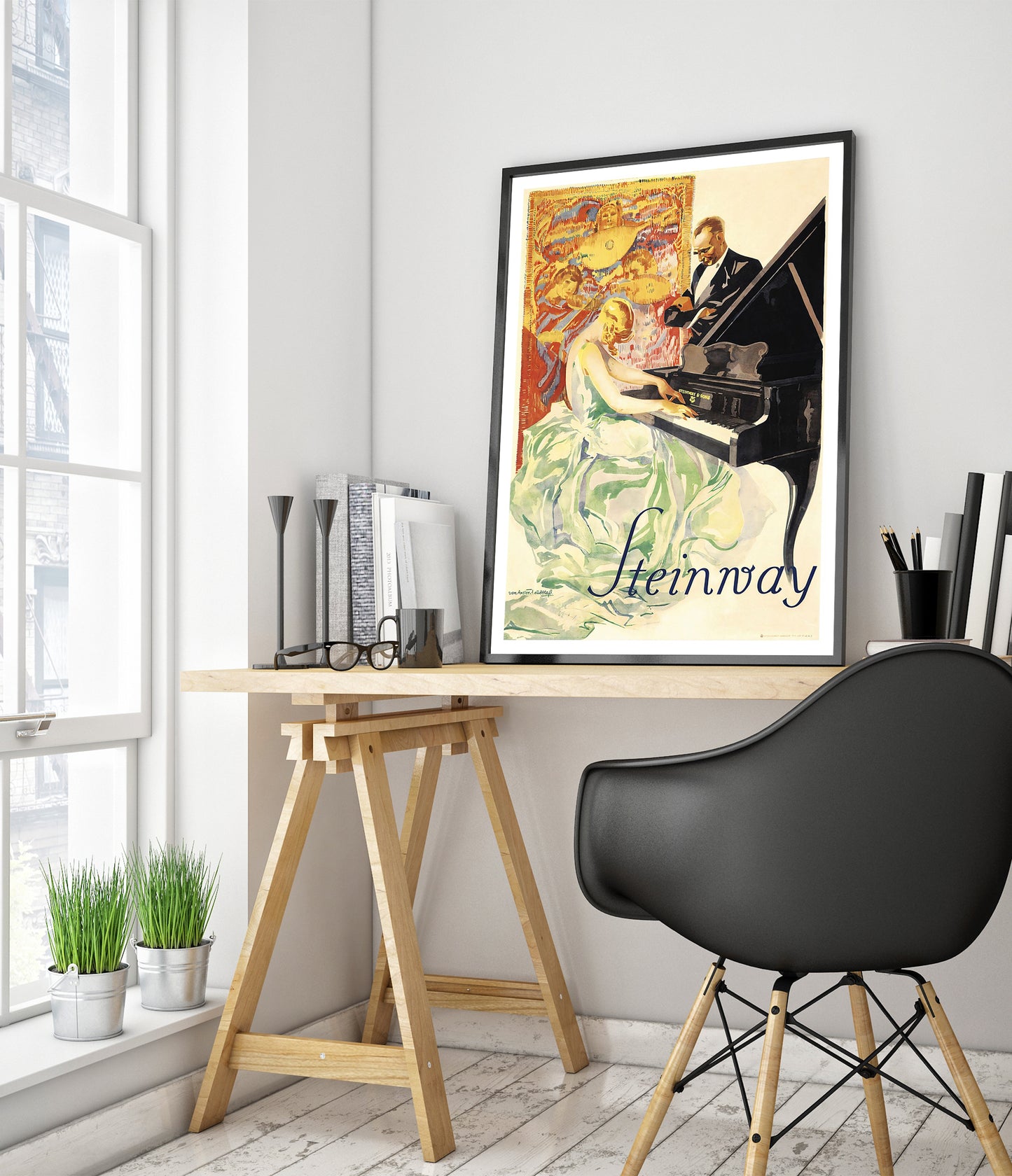 This vintage Steinway Piano poster captures the elegance of a bygone era. It features a sophisticated scene with a woman in a flowing green dress at a grand piano, accompanied by a male musician. The watercolor-style illustration is enhanced with warm yellows and greens, making it a timeless piece for music enthusiasts and vintage art collectors.