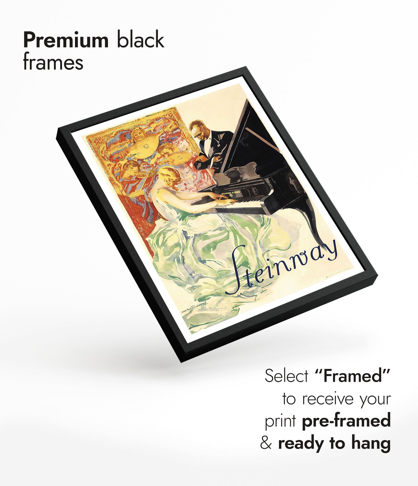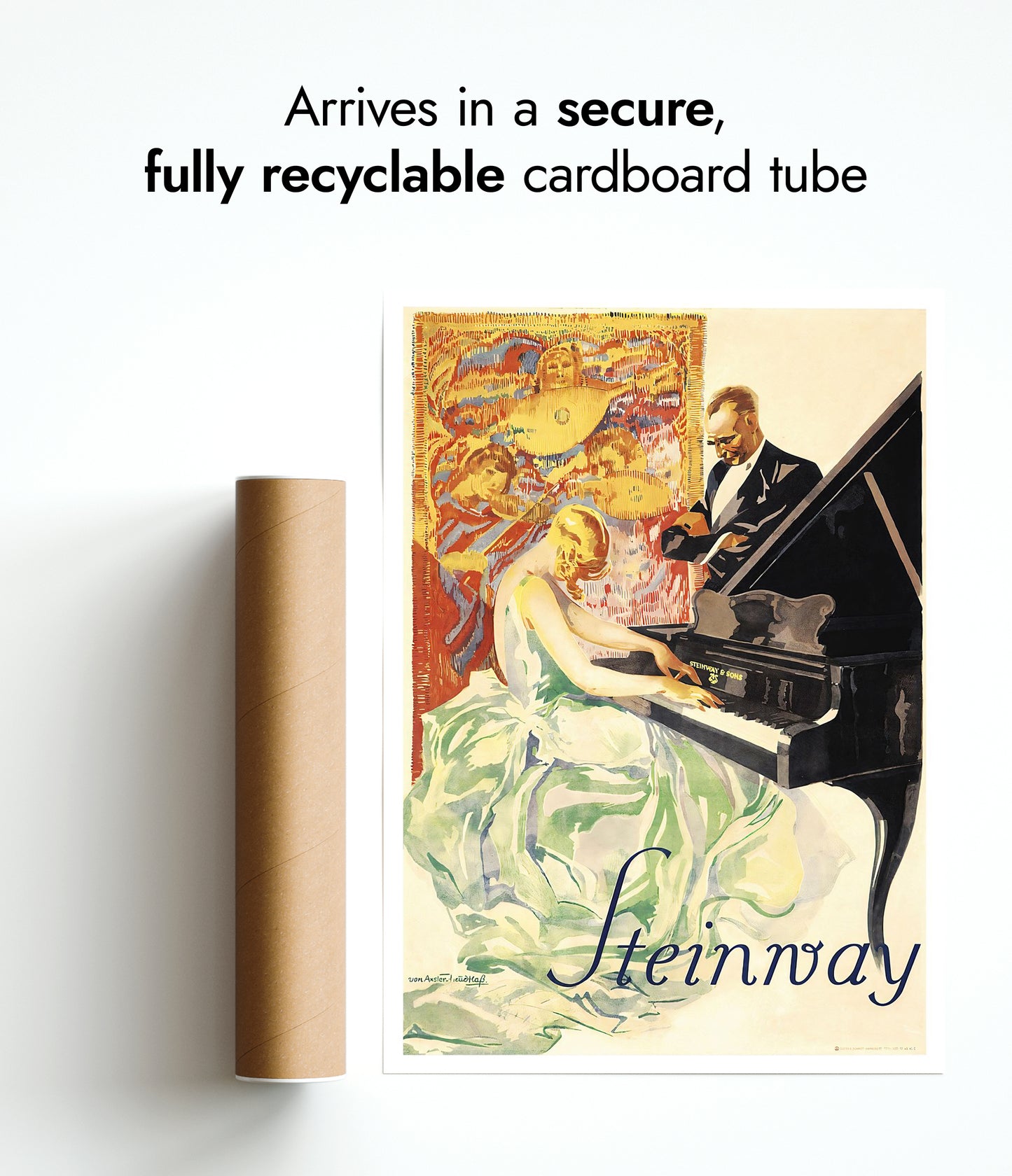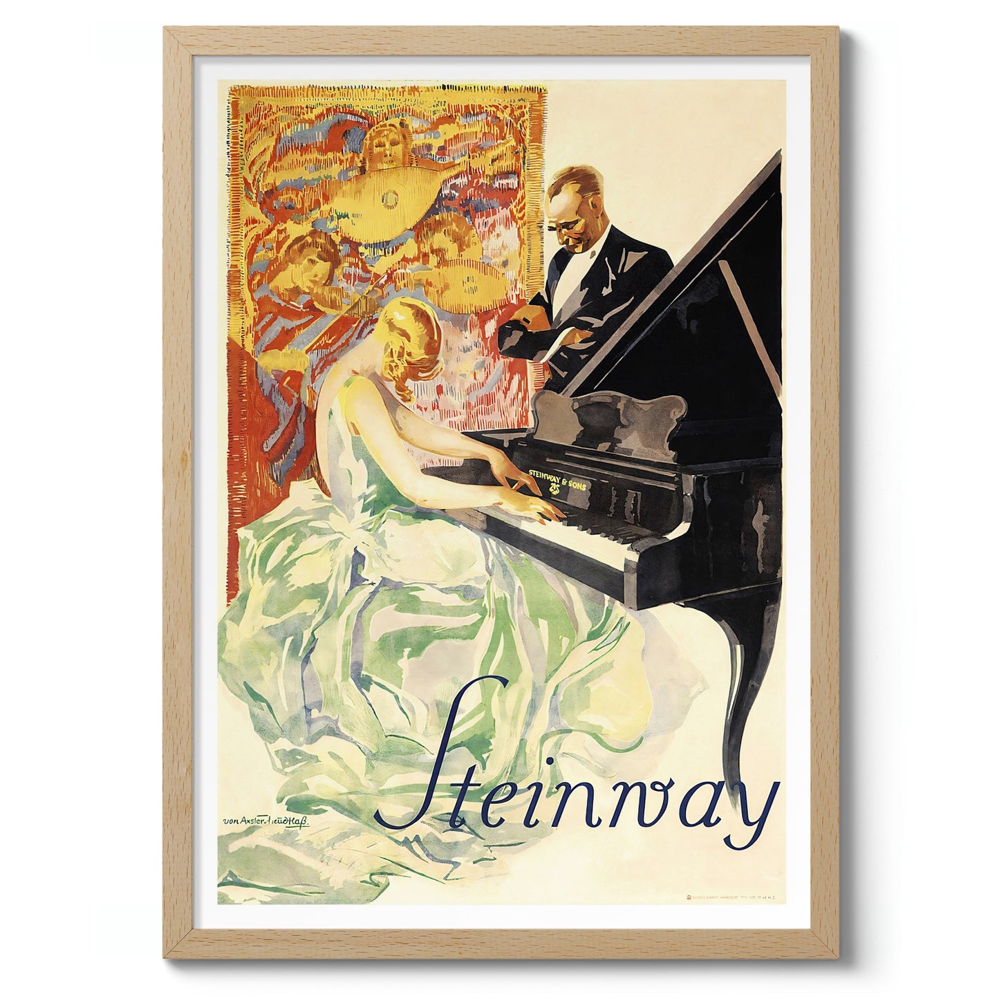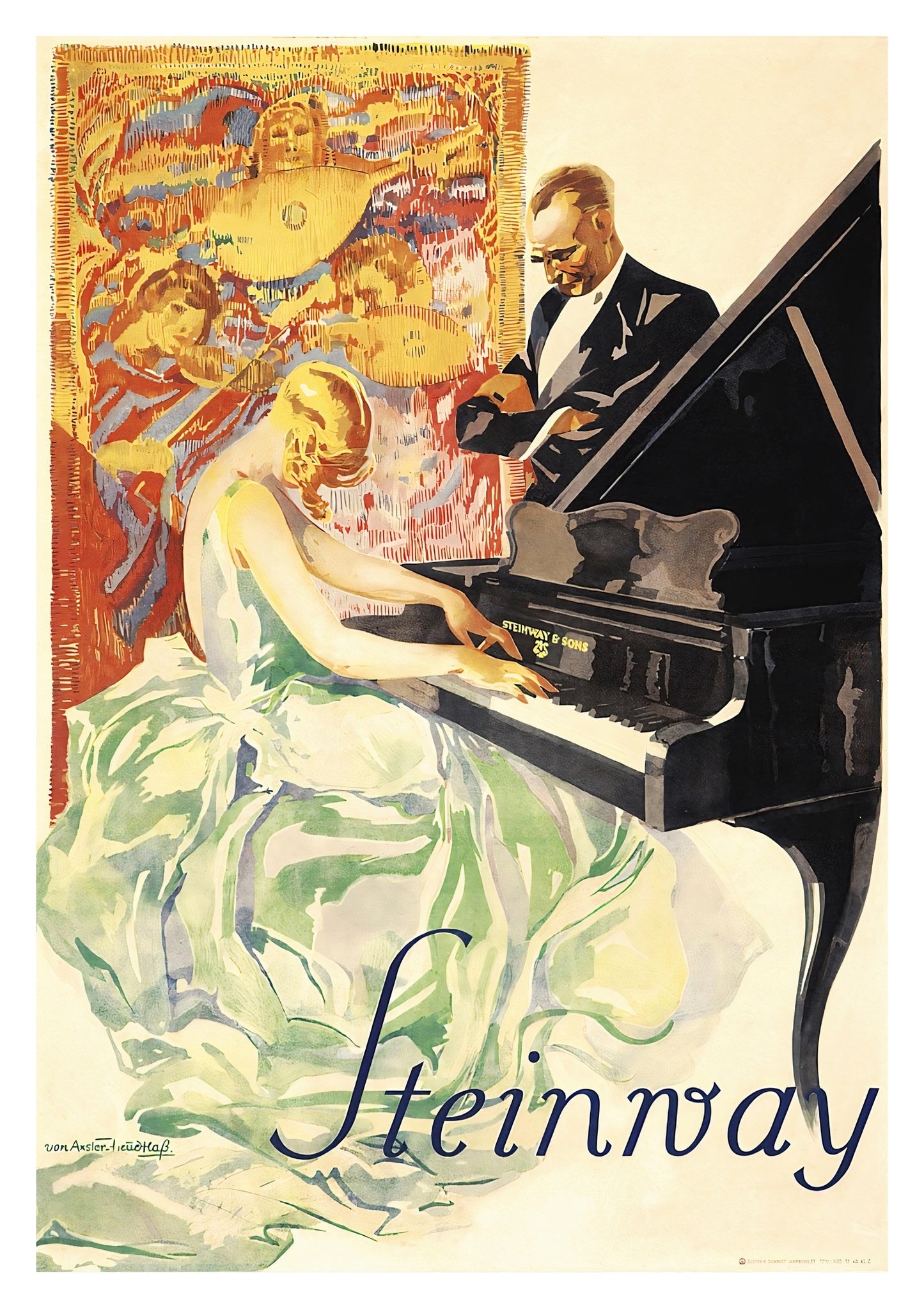 This vintage Steinway Piano poster captures the elegance of a bygone era. It features a sophisticated scene with a woman in a flowing green dress at a grand piano, accompanied by a male musician. The watercolor-style illustration is enhanced with warm yellows and greens, making it a timeless piece for music enthusiasts and vintage art collectors.