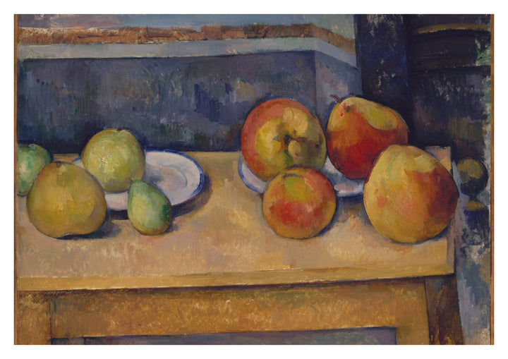 "Still Life with Apples and Pears" poster by Paul Cézanne captures a timeless arrangement of fruit laid out on a wooden table. This Post-Impressionist painting showcases the rich, textured colours of apples and pears, highlighting the artist's skill in portraying everyday objects with depth and nuance. Ideal for kitchen or farmhouse decor, this artwork invites a sense of rustic charm and classic artistry.