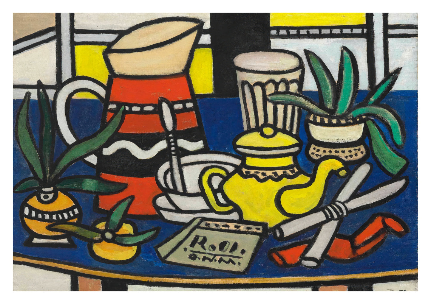 "Still Life with Blue Carpet" by Fernand Léger captures a vibrant still life scene with bold colours and geometric forms. This Cubist painting features kitchen items, such as a teapot and pitcher, set against a rich blue carpet backdrop. Houseplants and everyday objects are skillfully arranged to create a dynamic composition, making this poster a striking addition to any space.