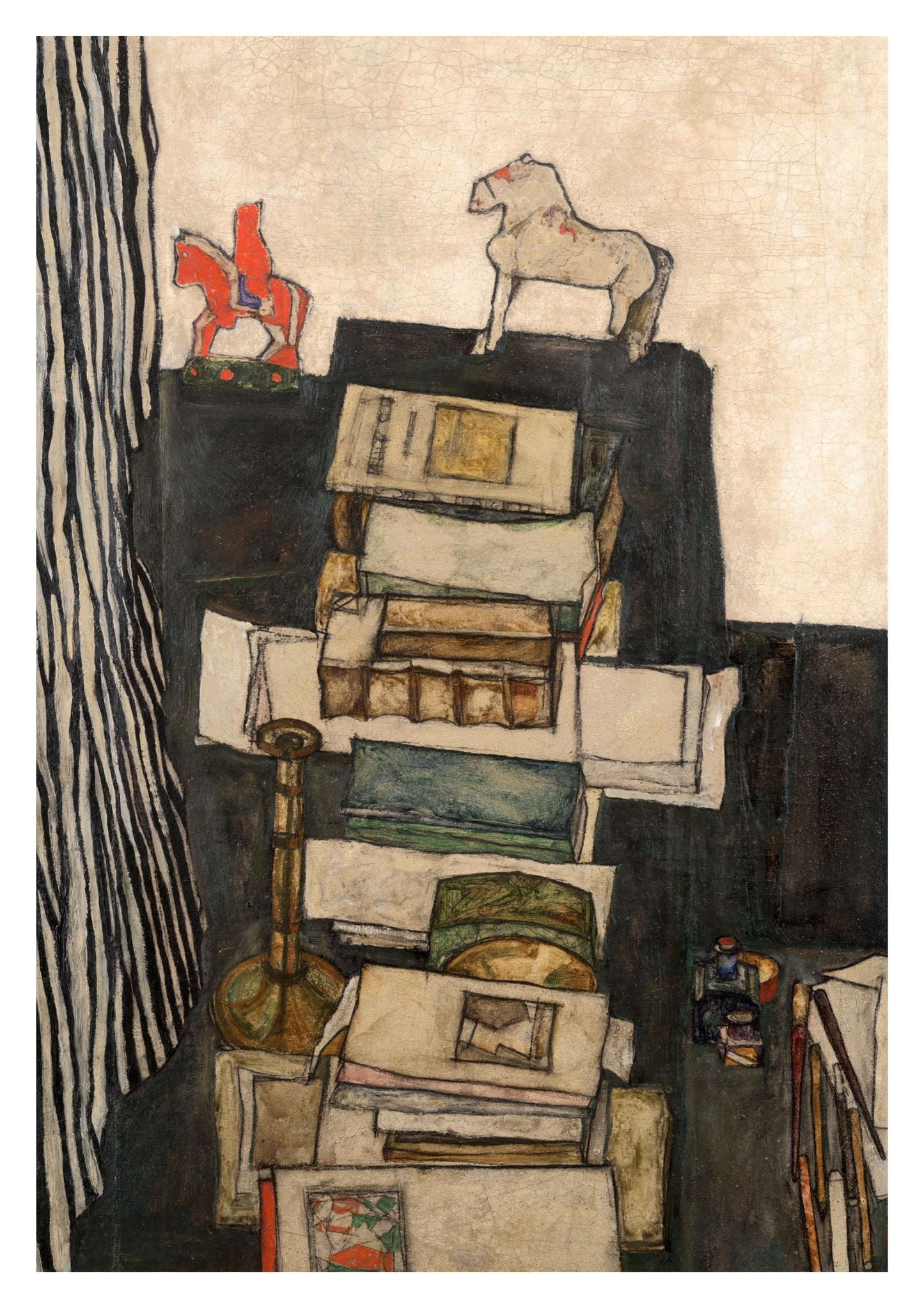 Capture the essence of Egon Schiele's "Still Life with Books (The Artist's Desk)" with this expressionist poster. Depicting a cluttered desk adorned with stacks of books, a candle, and small decorative objects, this artwork invites a glimpse into the artist’s study. Ideal for study or office decor, this piece celebrates intellectual pursuit and creativity.