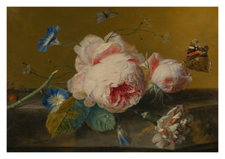 This "Still Life with Flowers & Butterfly" poster by Jan Van Huysum features an elegant arrangement of lush roses and delicate blooms, beautifully accented by a resting butterfly. The artwork showcases intricate details and rich, natural hues, embodying the timeless beauty of Renaissance still life paintings. Perfect for adding a touch of classic floral elegance to any space.