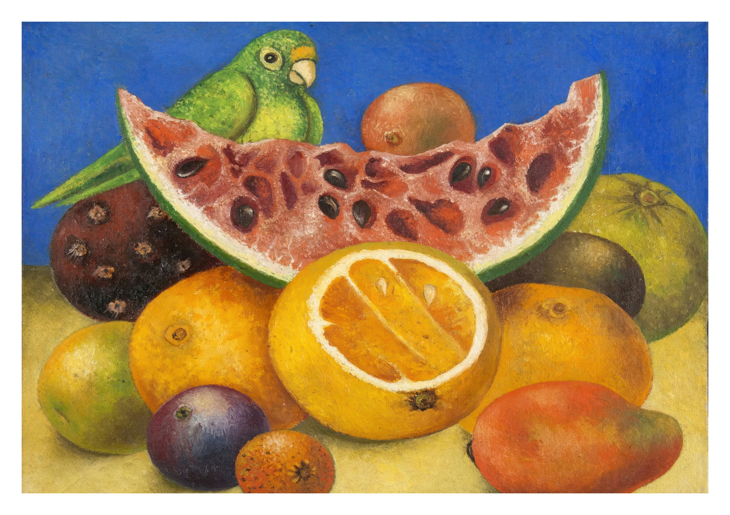 This vibrant still-life poster by Frida Kahlo features an array of colourful fruits, including watermelon, orange, and lime, set against a rich blue backdrop. A green parrot perches gracefully among the fruits, adding a lively touch to the composition. Perfect for adding a splash of colour and artistic flair to any space.