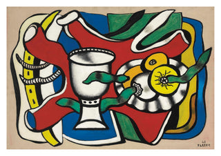 "Still Life with White Vase" by Fernand Léger showcases a vibrant Cubist interpretation of a kitchen scene. This landscape poster features bold shapes and striking colours, centering on a white vase surrounded by abstract fruit and geometric forms. Léger's masterful use of line and composition creates a dynamic, eye-catching artwork perfect for adding modern flair to any space.