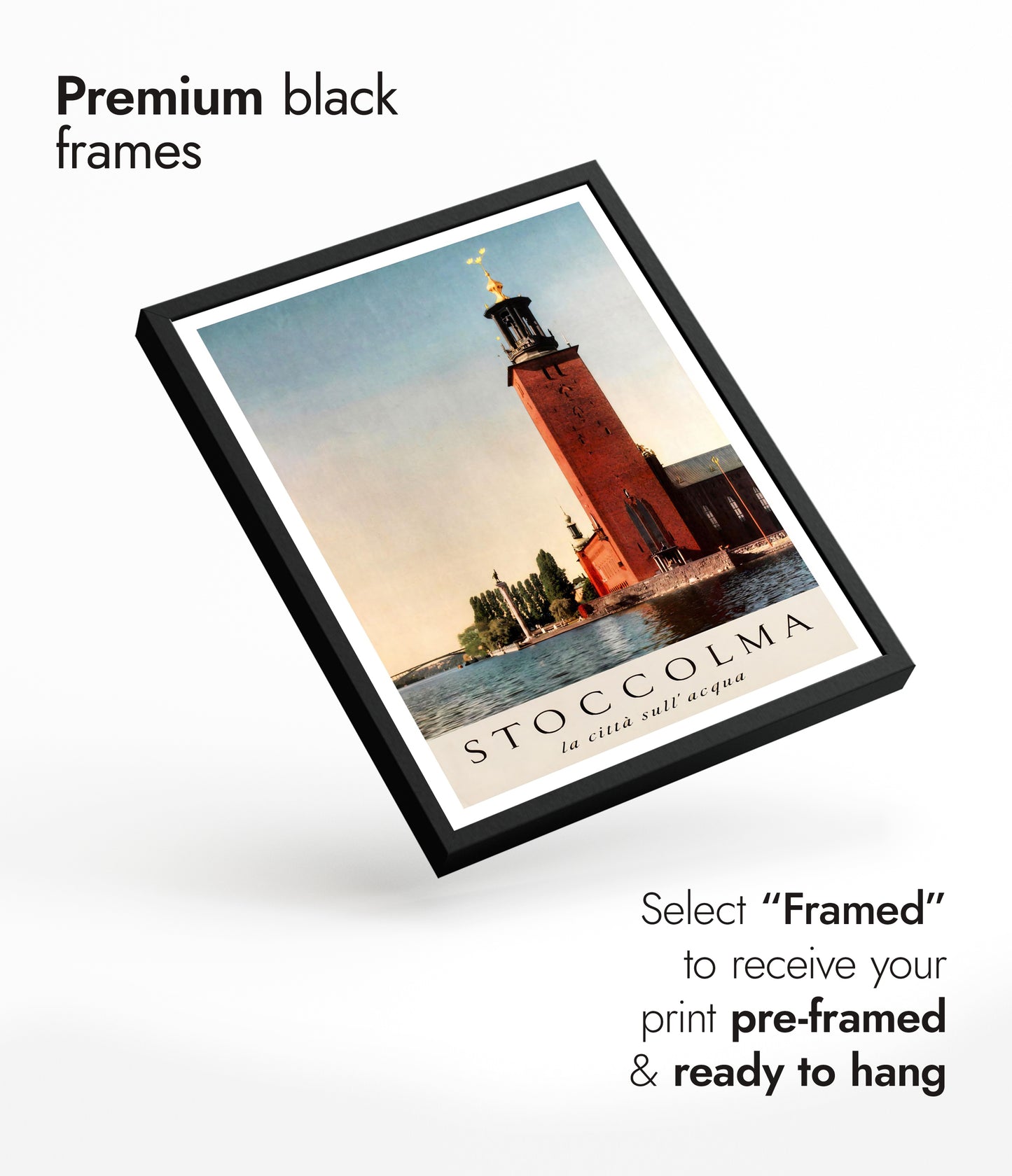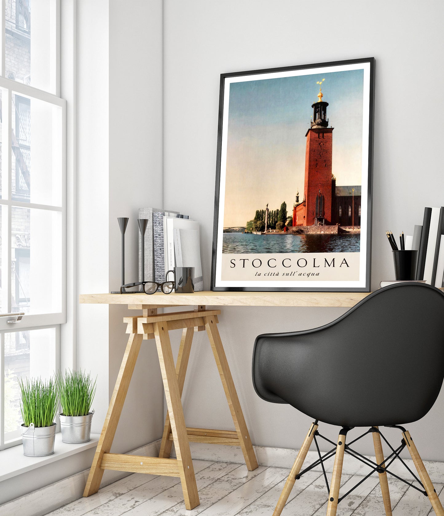 This vintage travel poster illustrates the iconic Stockholm City Hall in radiant beige and red tones. The classic illustration captures the picturesque waterfront, featuring the hall's towering spire and lighthouse-like structure. The water's reflection highlights Stockholm's charm as "la città sull'acqua," meaning "the city on the water" in Italian. Ideal for enthusiasts of travel and Swedish architecture.