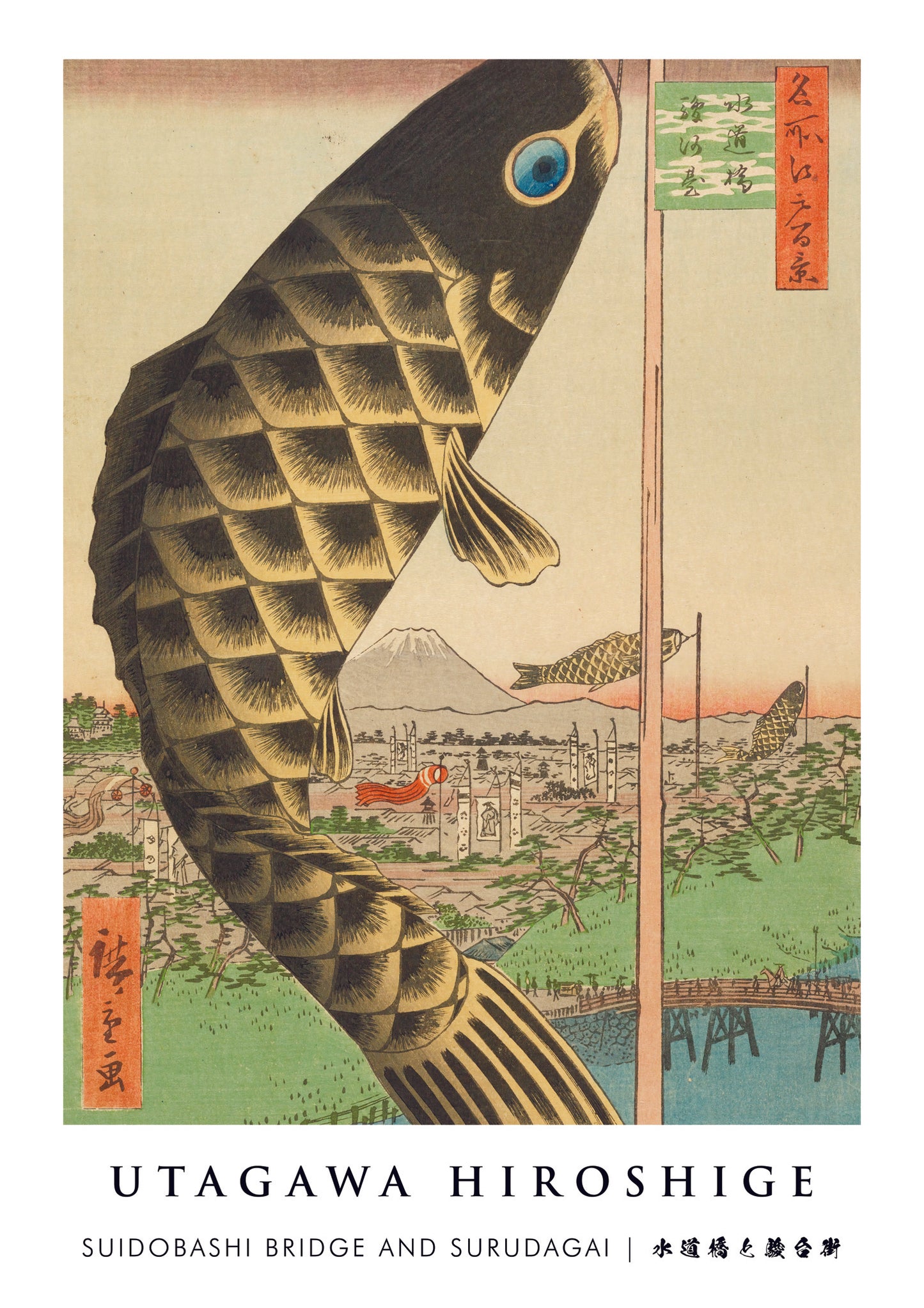 This traditional woodblock poster by Utagawa Hiroshige, titled "Suidobashi Bridge and Surudagai," portrays a vibrant landscape scene. Dominated by a large fish kite, the artwork offers a detailed glimpse into a serene Japanese village, featuring a bridge, river, and distant mountains. Ideal for fans of Ukiyo-E and traditional Japanese art.