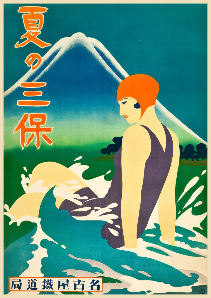 This vintage Japanese poster titled "Summer at Miho Peninsula" features a striking graphic illustration of a bather in a vibrant swimsuit against the serene backdrop of Mt. Fuji. The artwork captures the essence of summer, blending elements of nature with a nostalgic aesthetic. Perfect for lovers of vintage illustrations and Japanese landscapes, this poster brings an iconic scene to any space.