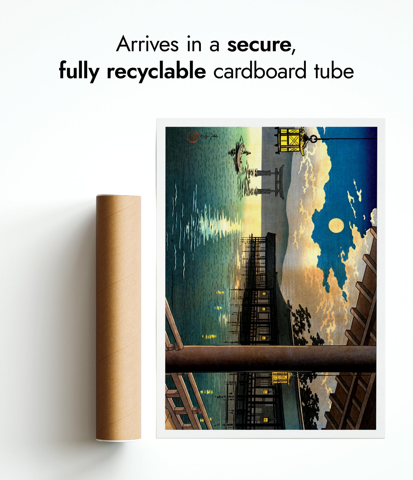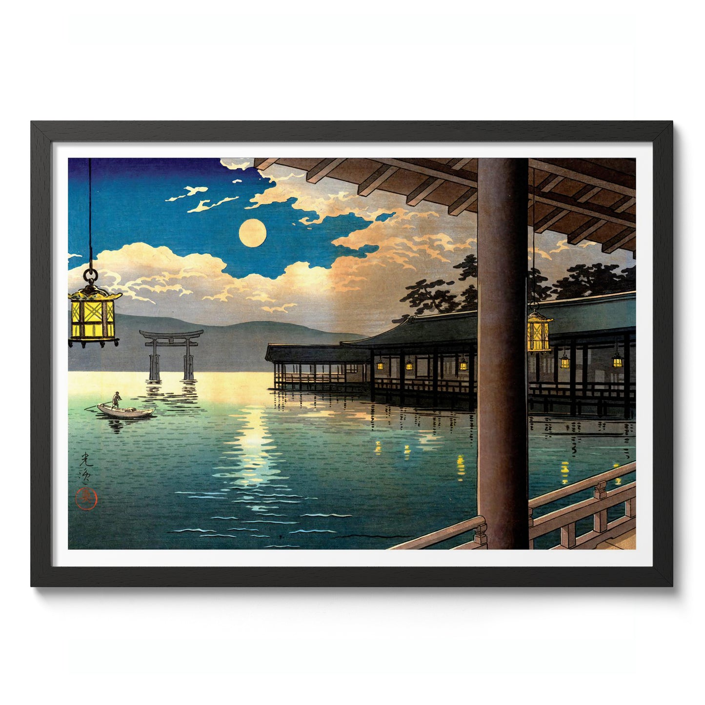 The "Summer Moon at Miyajima" poster by Tomikichiro Tokuriki beautifully illustrates a traditional Japanese woodblock scene. It captures a serene bay under a radiant full moon, with serene reflections in the water. A lone boat and ornate lantern evoke tranquility, while the architectural details impart traditional elegance. The calming green, blue, and brown hues enhance this Shin-Hanga style artwork, embodying timeless summer allure.