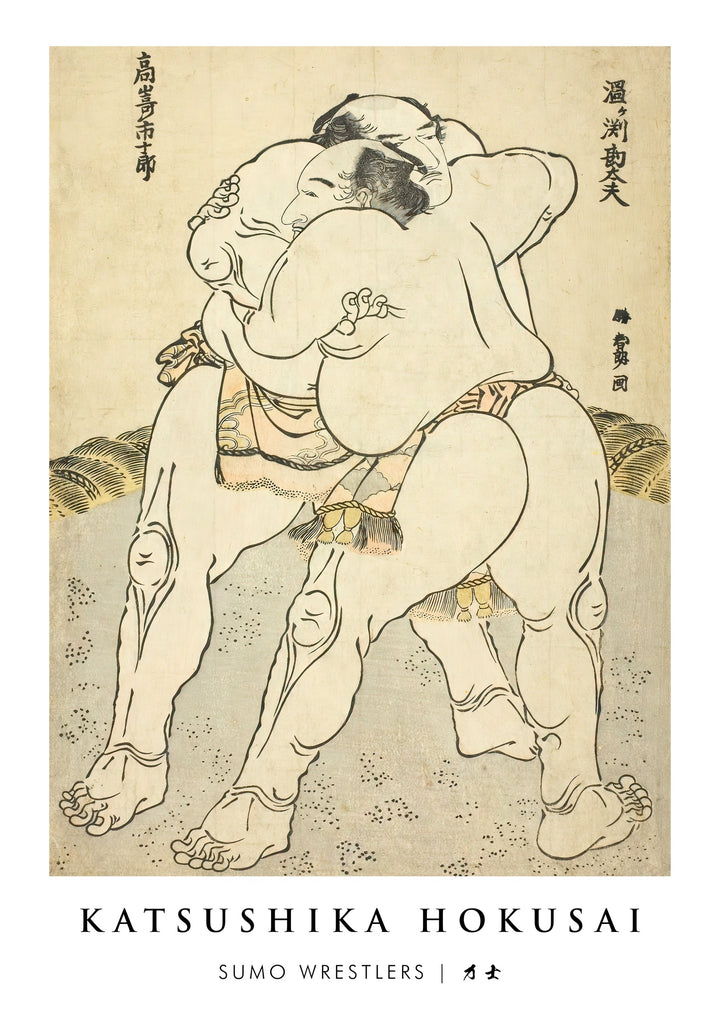 This poster titled "Sumo Wrestlers" showcases a traditional Japanese woodblock print by Katsushika Hokusai. The artwork depicts two muscular sumo wrestlers locked in combat, highlighting the strength and intensity of this ancient sport. The detailed linework and muted colour palette capture the essence of Edo-period artistry, emphasizing themes of tradition, power, and Japanese culture.