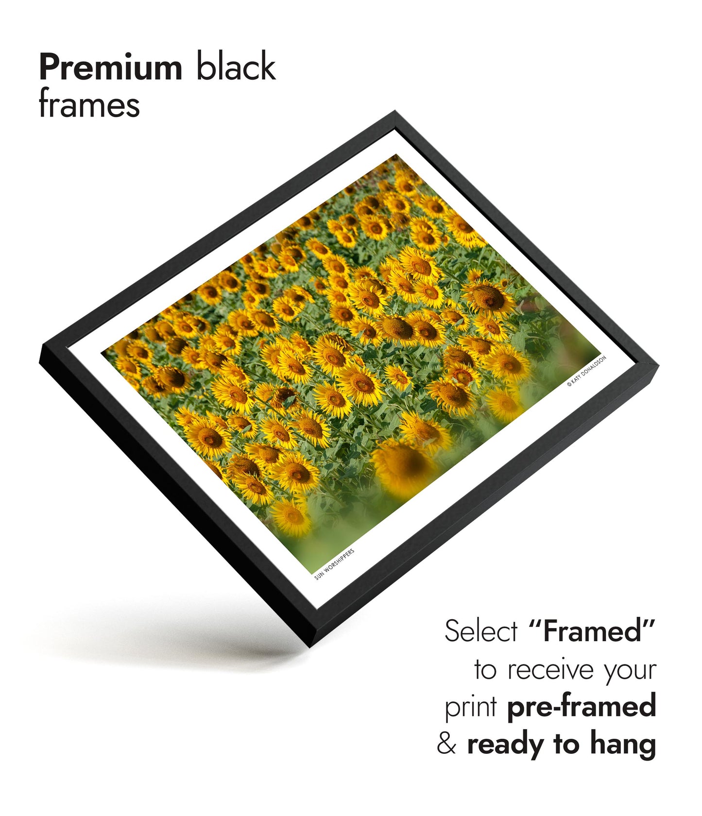 Solid wood frames available in black stained or natural finishes, with UV resistant acrylic glass. Framed orders arrive pre-installed with your choice of print, ready to hang. Available in all print sizes.