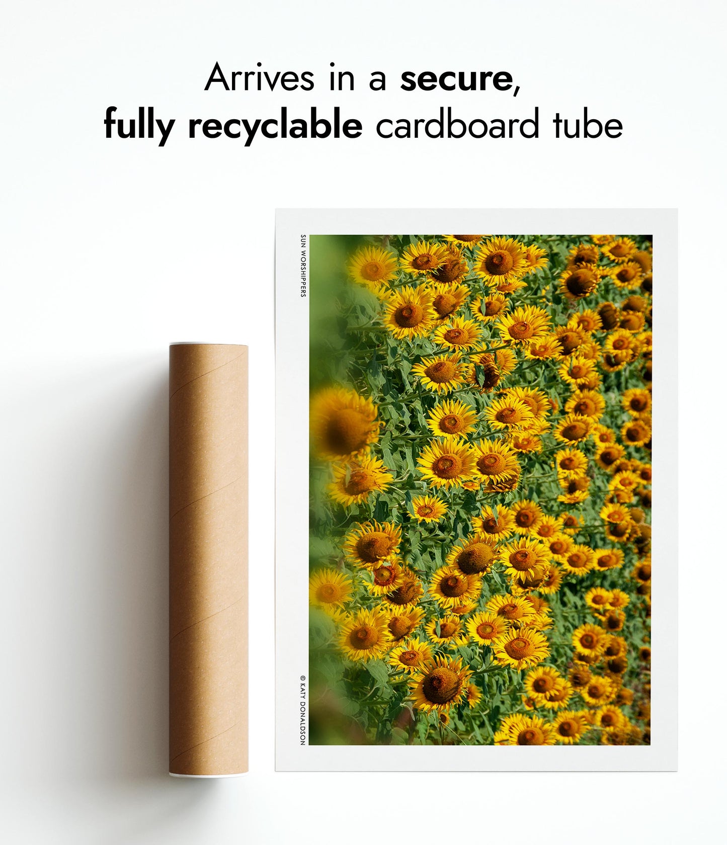 All orders are securely packed in recyclable, eco-friendly solutions. Frames are protected with sustainable bubble wrap alternatives inside thick boxes. Print only orders are shipped in heavy-duty cardboard tubes or protective hard-backed envelopes.