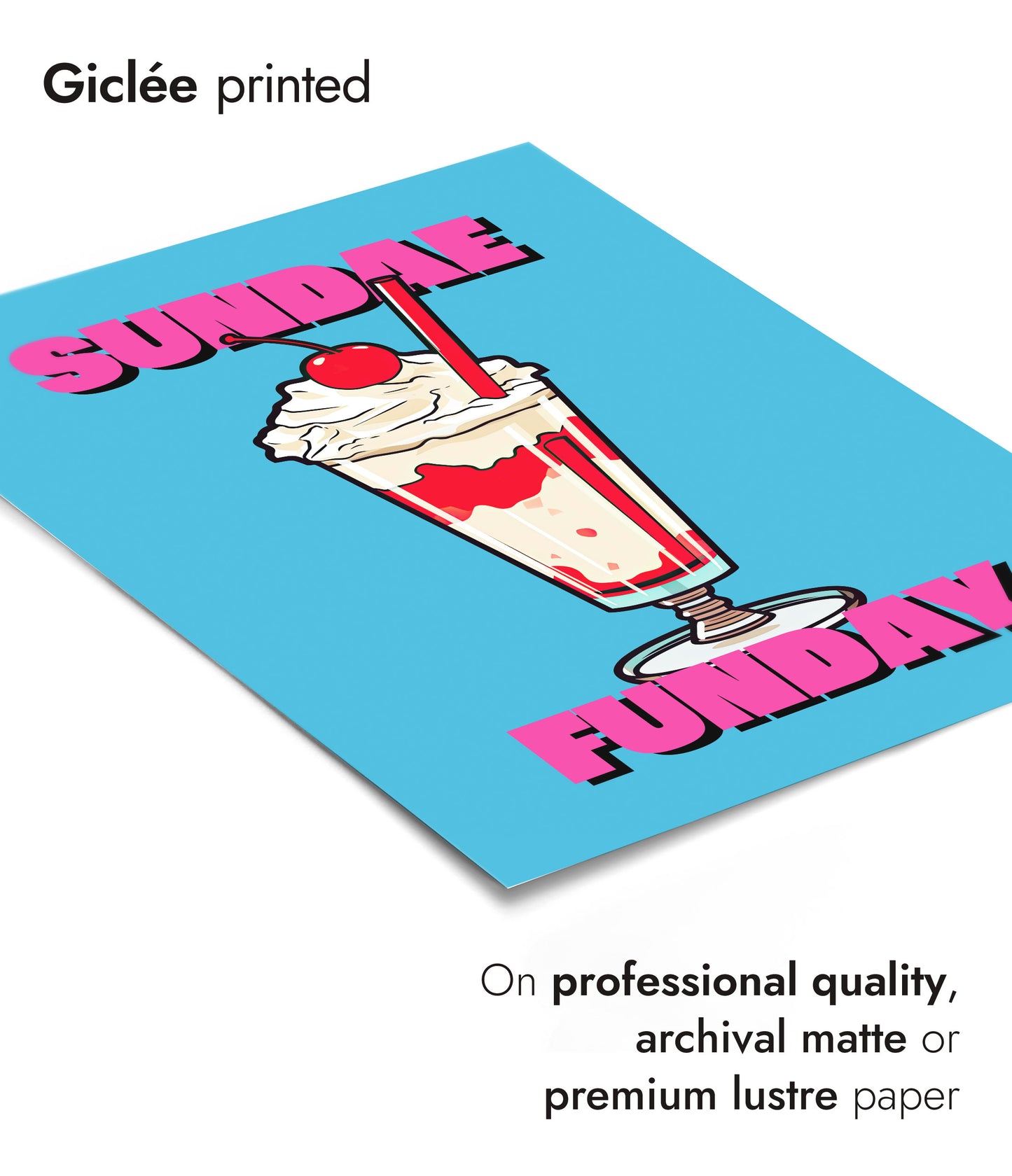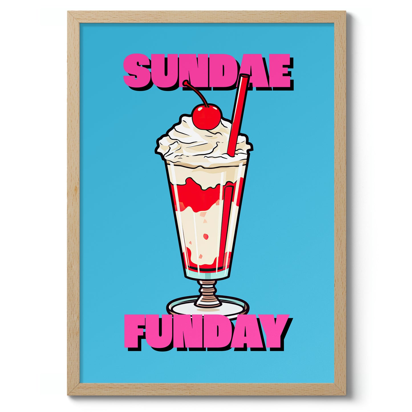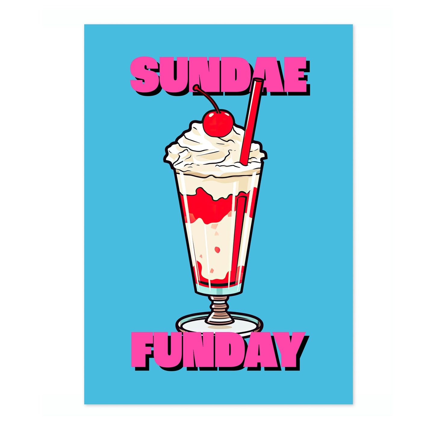 This vibrant poster titled "Sundae Funday" features a classic American diner ice cream sundae against a bright blue background. The illustrated sundae is topped with whipped cream and a cherry, creating a nostalgic, pop art feel. Bold pink text adds a playful touch, making it a perfect piece for any food or retro art enthusiast.