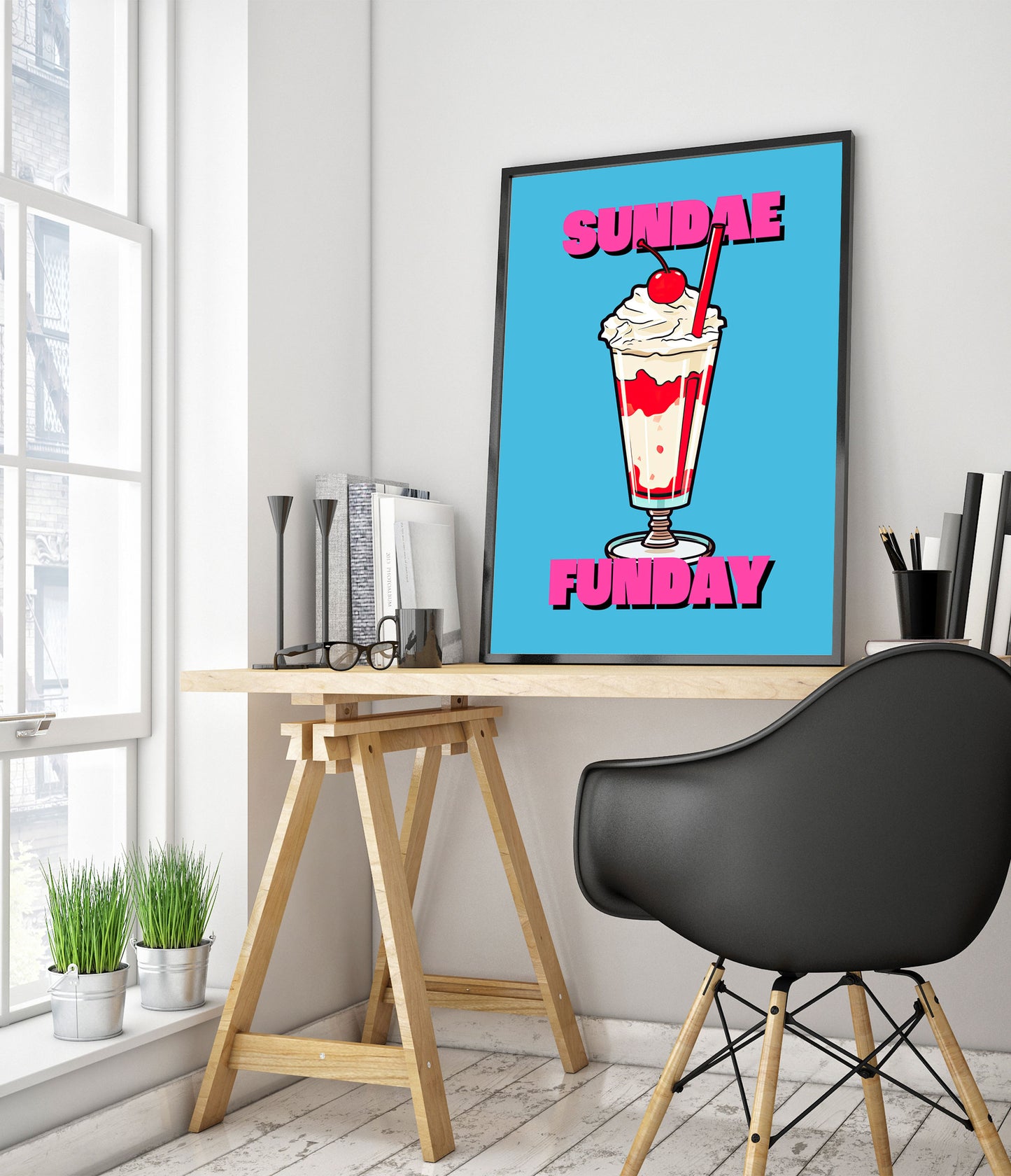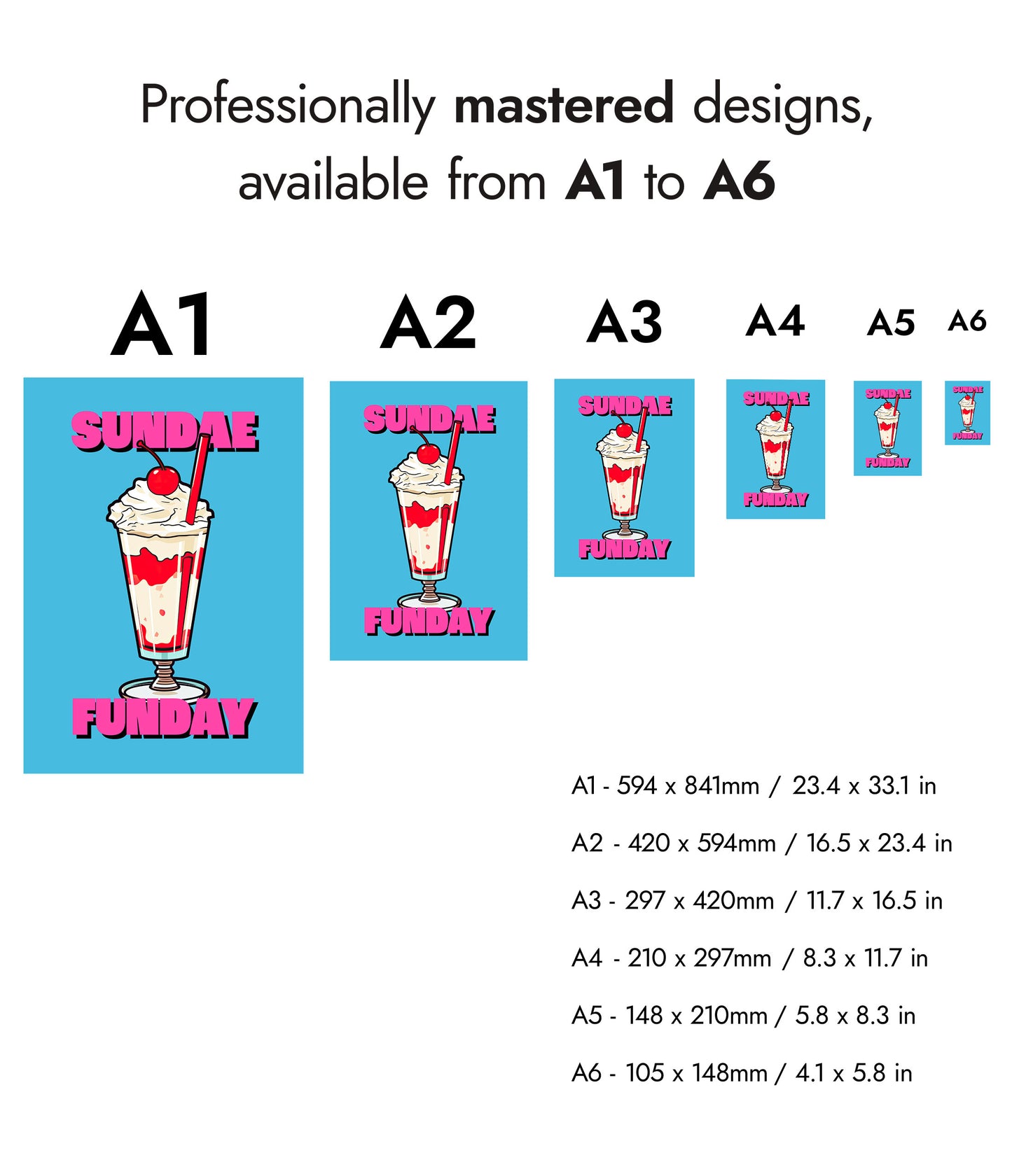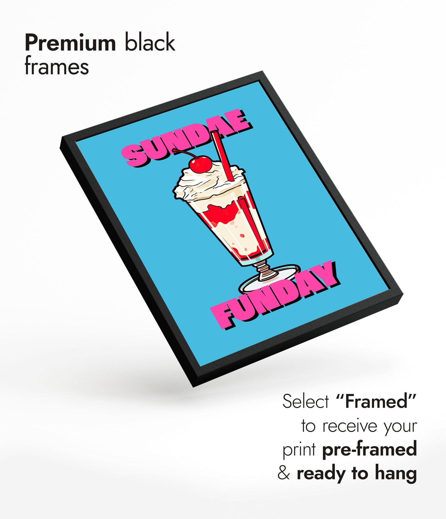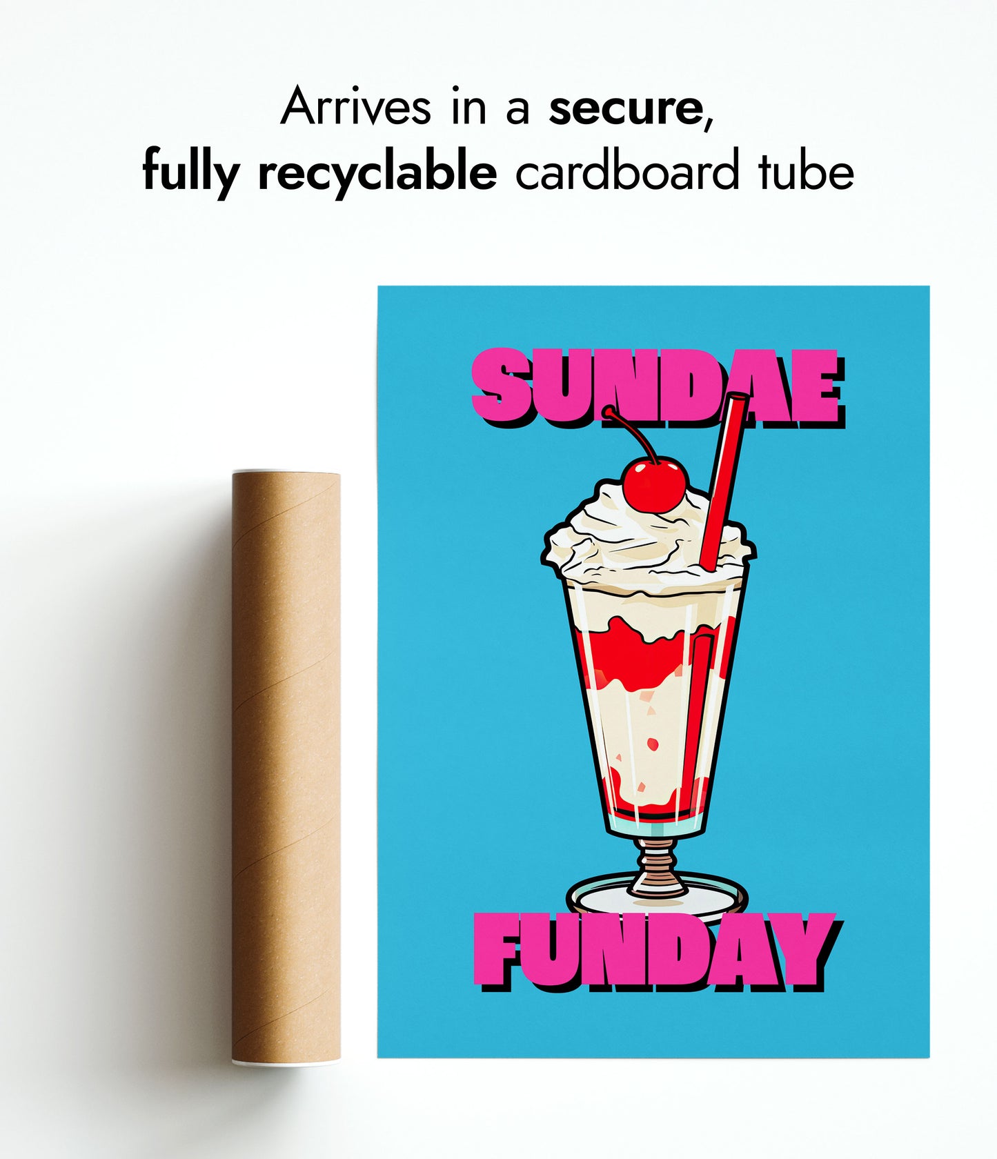 This vibrant poster titled "Sundae Funday" features a classic American diner ice cream sundae against a bright blue background. The illustrated sundae is topped with whipped cream and a cherry, creating a nostalgic, pop art feel. Bold pink text adds a playful touch, making it a perfect piece for any food or retro art enthusiast.