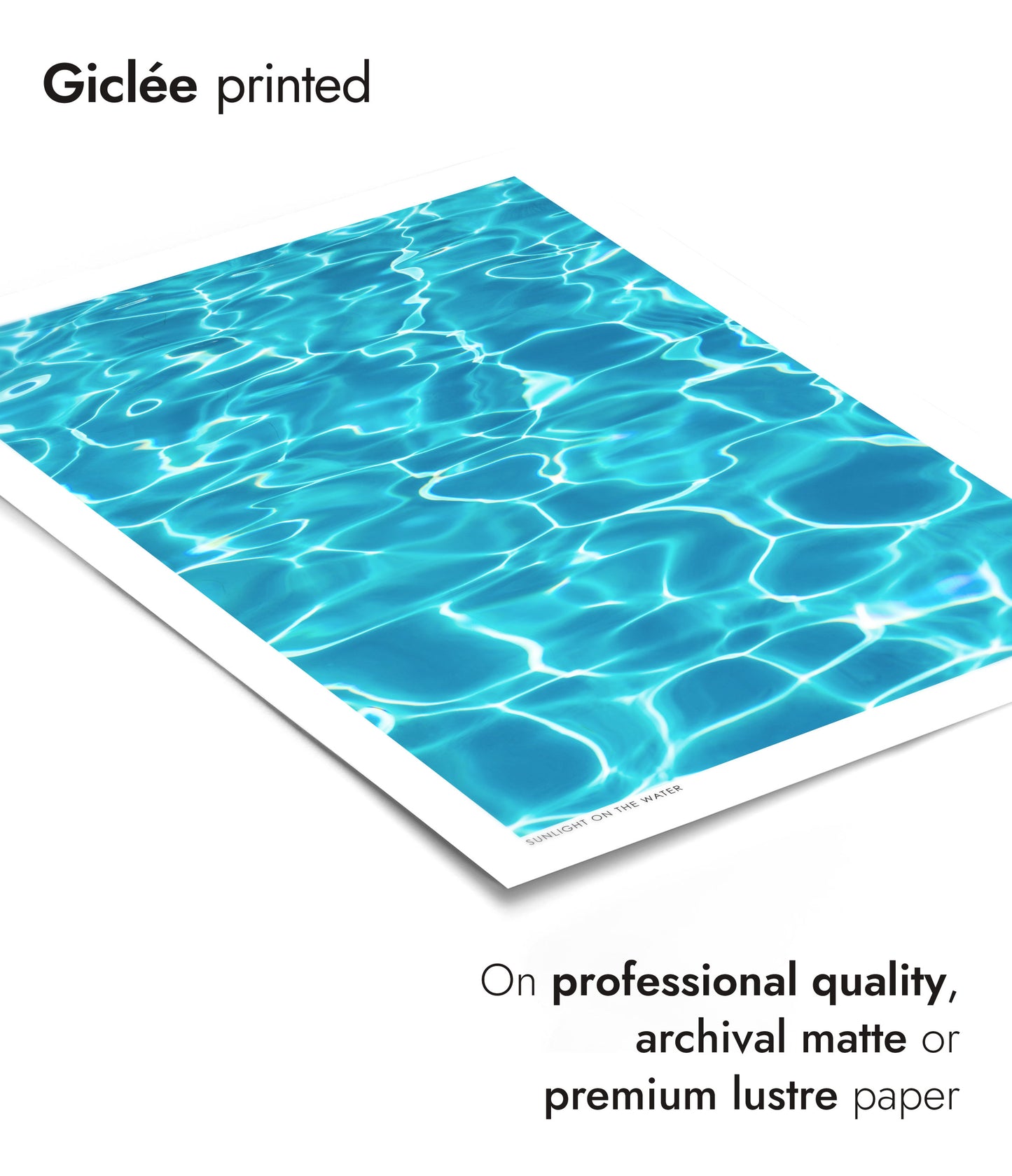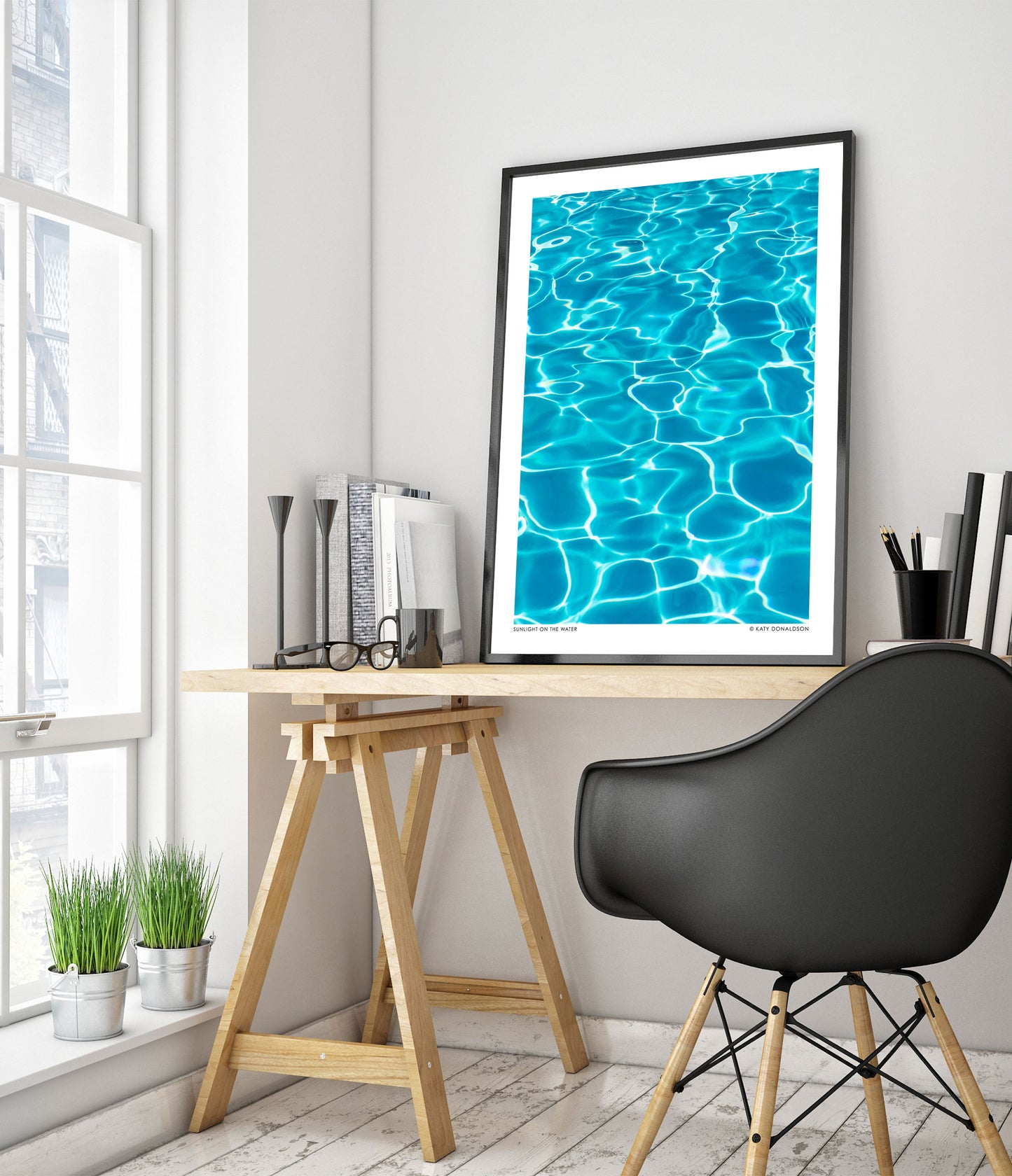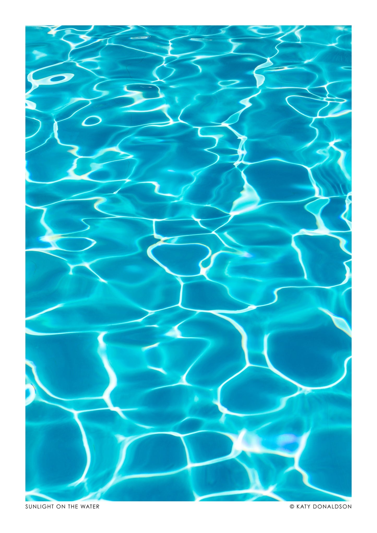 “Sunlight On The Water” poster by Katy Donaldson captures the mesmerizing play of light on a crystal-clear pool. This modern, abstract, and minimalist photographic print evokes a sense of summer with its vivid blue hues and intricate reflection patterns. Perfect for adding a touch of tranquility and elegance to any space.