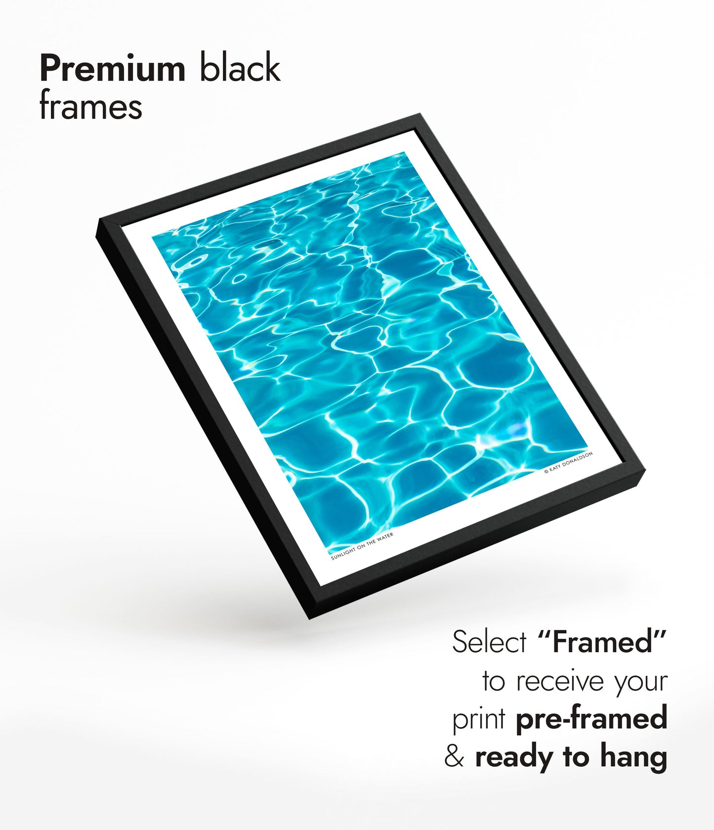 Solid wood frames available in black stained or natural finishes, with UV resistant acrylic glass. Framed orders arrive pre-installed with your choice of print, ready to hang. Available in all print sizes.
