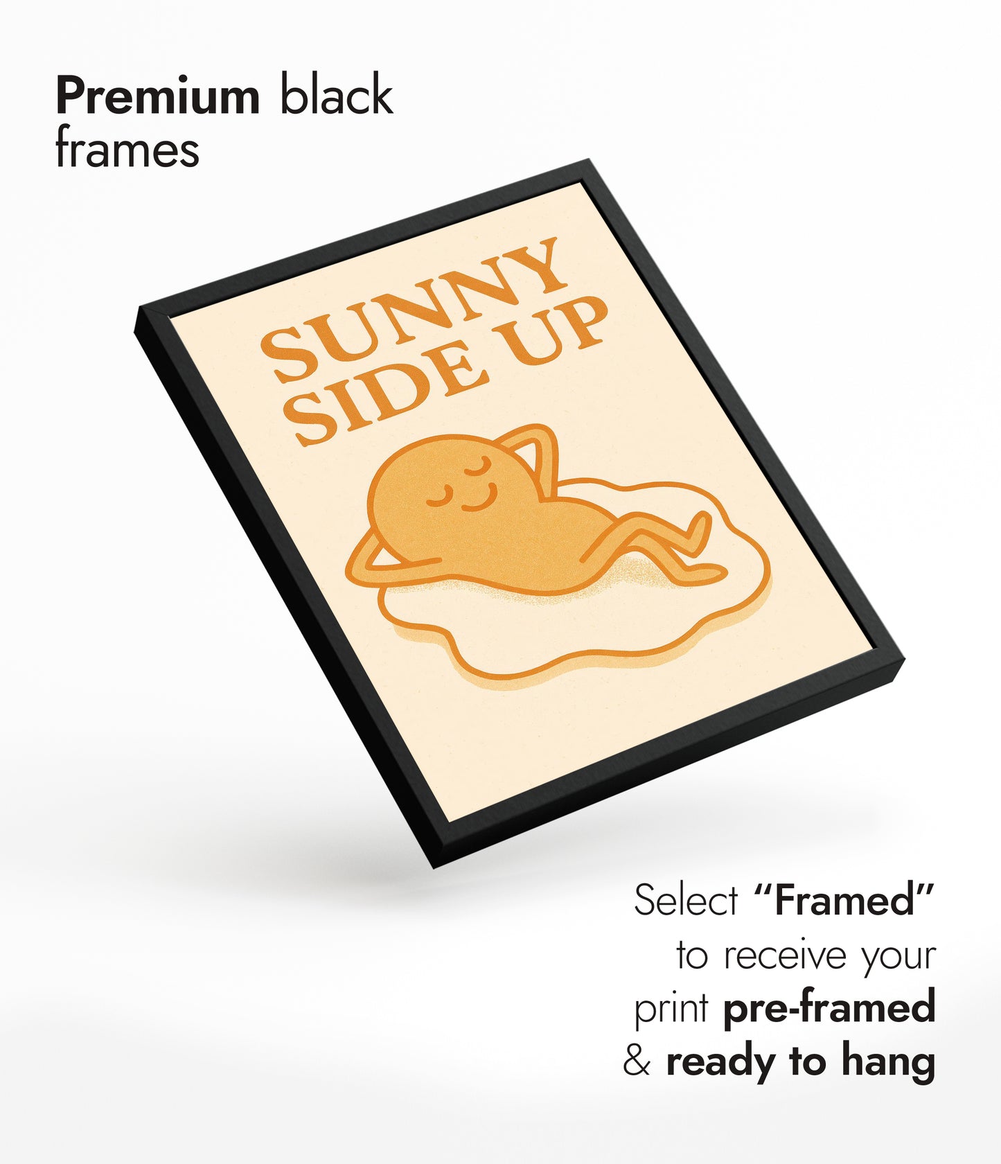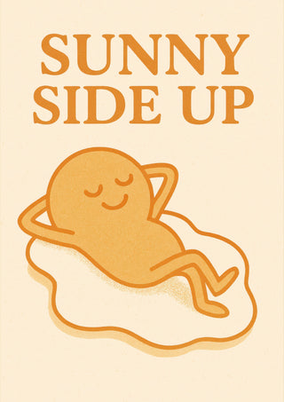 This "Sunny Side Up" poster features a whimsical illustration of a relaxed egg, embodying a chill vibe. The playful cartoon design uses a yellow hue to enhance its vintage style, complete with bold typography. Ideal for those who appreciate quirky art with a food theme, this poster adds a cheerful and laid-back atmosphere to any space.