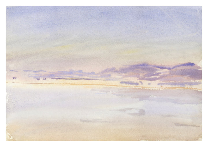 Capture the serene beauty of a seascape with "Sunset at Sea" by John Singer Sargent. This impressionist landscape poster portrays a tranquil sunset over calm waters, bathes the sky in soft purples and subtle yellows. Perfect for adding a peaceful, reflective touch to any room. Ideal for fans of impressionism and marine-themed art.