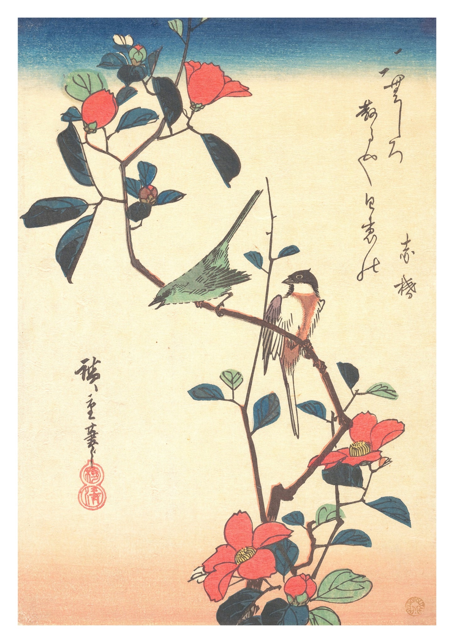"Swallows and Kingfisher with Rose Mallows" is a traditional Japanese woodblock poster by Utagawa Hiroshige. Featuring delicate swallows and a vibrant kingfisher perched among blooming rose mallows, this artwork captures the serene beauty of nature. The elegant illustration uses soft hues and intricate details to celebrate Ukiyo-e style, making it a timeless wall decor piece.